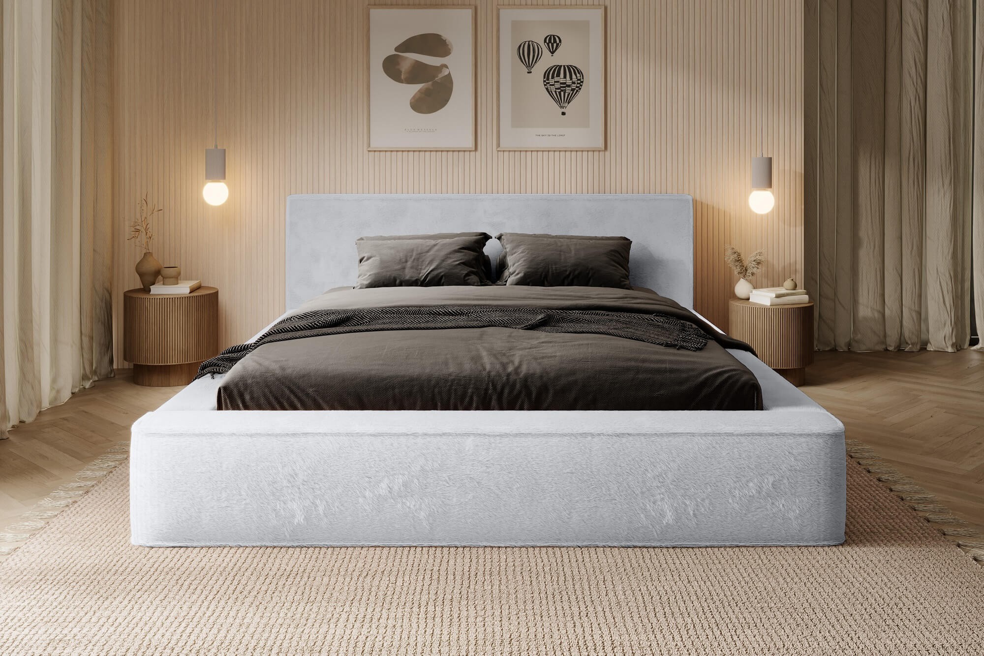 Zanurz się w wyjątkowym komforcie łóżka AJSZA. To mebel zaprojektowany z najwyższej jakości materiałów, gdzie elegancja spotyka się z prawdziwym komfortem i funkcjonalnością. Cechy, takie jak solidna i wytrzymała konstrukcja, uniwersalny kolor i spory rozmiar 180x200 idealny do przestronnych sypialni, drewniany bądź metalowy stelaż z listewkami sprężynującymi, które zapobiegają zbieraniu się kurzu i wilgoci oraz automatyczne siłowniki, to elementy, które zapewniają wygodę użytkowania oraz przyjemność wypoczynku każdego dnia. Niewątpliwym atutem jest oczywiście pojemnik na pościel z twardym dnem z solidnej płyty HDF, zapewniający dodatkową przestrzeń do przechowywania i oszczędność miejsca w pokoju. Prosta i klasyczna bryła ozdobiona sztucznym futerkiem na całej powierzchni daje niesamowicie nietuzinkowy wygląd przestrzeni, co sprzyja rozmaitym aranżacjom wnętrz. Idealne rozwiązanie, jeśli lubisz odważne i oryginalne rozwiązania w swoim domu.