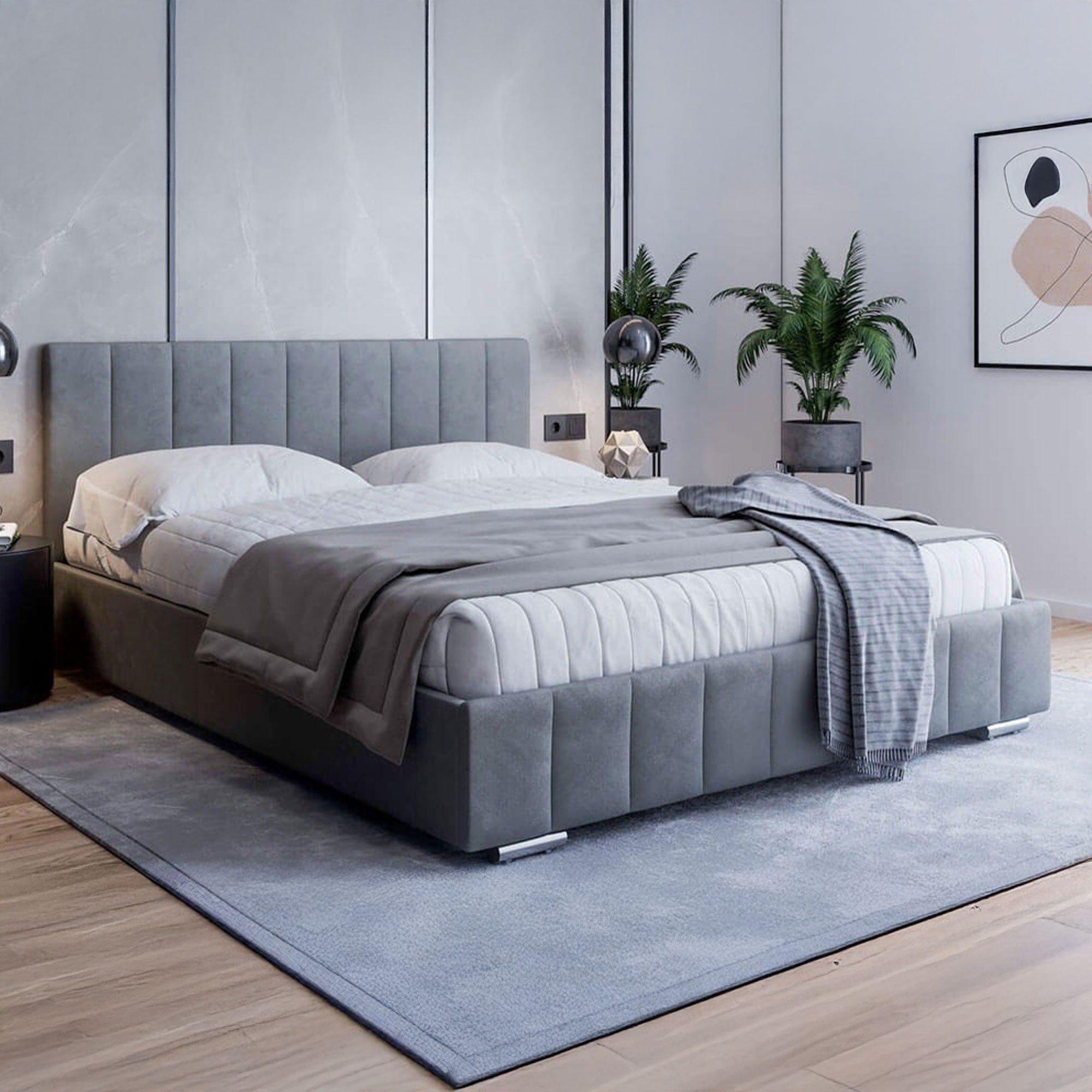 W zestawie także praktyczny pojemnik na pościel umieszczony pod powierzchnią łóżka. Zyskamy więc nie tylko nowoczesne i stylowe łóżko tapicerowane z pięknym wezgłowiem, ale również dodatkową przestrzeń do przechowywania.