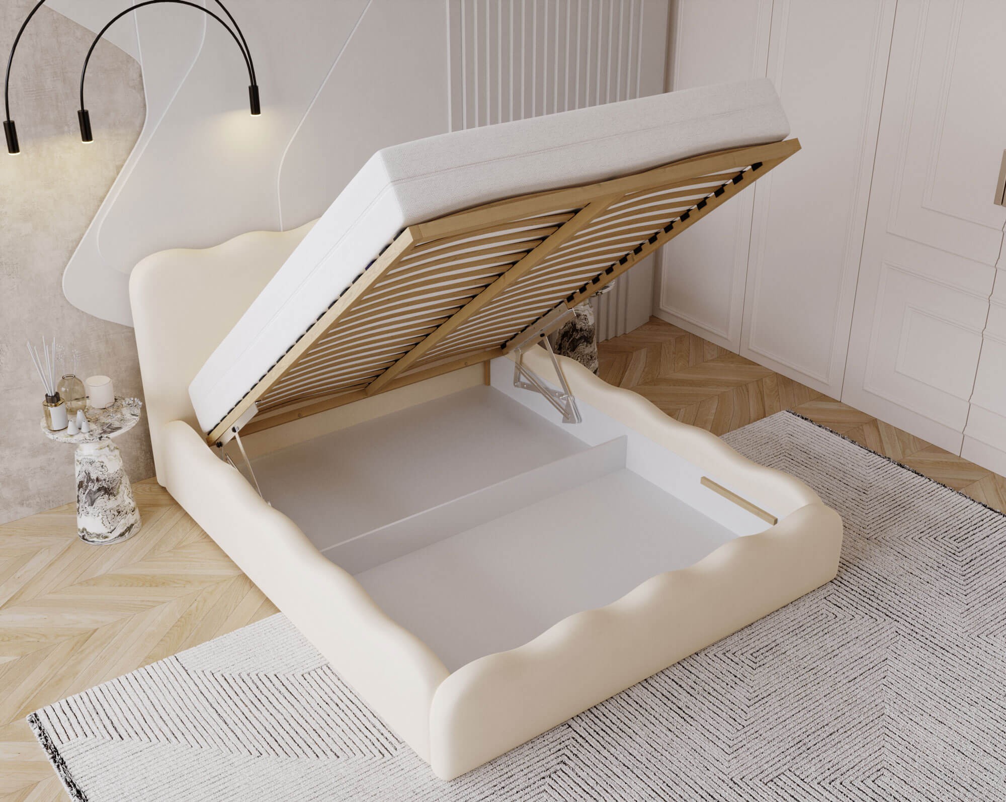 Łóżko tapicerowane BALI o wymiarach 160x200 cm to elegancki i funkcjonalny mebel, który doskonale łączy komfort, trwałość i nowoczesny styl. Wyposażone w pojemnik na pościel, pozwala w łatwy sposób przechować kołdry, poduszki czy inne tekstylia, utrzymując porządek w sypialni. Stelaż oparty na wzmocnionej ramie gwarantuje stabilność i solidność konstrukcji, a zastosowane automaty znacząco ułatwiają otwieranie pojemnika. Dzięki temu codzienne korzystanie z łóżka jest lekkie i bezpieczne. Tapicerowane wykończenie nadaje meblowi przytulny, elegancki charakter, który można dopasować do wystroju wnętrza, wybierając odpowiedni kolor tkaniny. Model BALI 160x200 to doskonały wybór dla osób ceniących wygodę, funkcjonalność i estetykę – idealny do każdej nowoczesnej sypialni.