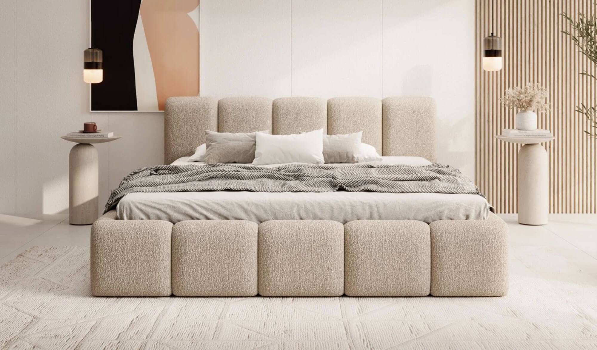 Łóżko tapicerowane FERO to propozycja dla osób ceniących nowoczesny design, funkcjonalność i solidne wykonanie. Miękkie, niskie wezgłowie sprawia, że mebel doskonale sprawdzi się w każdej sypialni, także tej o niższym suficie. Subtelne zaokrąglenia nadają mu lekkości i harmonii, a starannie wykonane detale podkreślają elegancki wygląd łóżka. Model FERO wyposażony jest w praktyczny pojemnik na pościel, który otwiera się lekko i bez wysiłku dzięki mechanizmowi sprężynowemu. Wnętrze pojemnika zostało wykonane z trwałej płyty HDF, odpornej na codzienne użytkowanie. Drewniany stelaż zapewnia odpowiednią wentylację materaca, chroniąc go przed wilgocią i wydłużając jego żywotność. To łóżko łączy w sobie estetykę i trwałość, oferując komfortowy sen i porządek w sypialni. Polska produkcja, staranność wykonania oraz możliwość wyboru koloru tapicerki sprawiają, że FERO doskonale dopasuje się do każdego wnętrza i posłuży przez wiele lat.