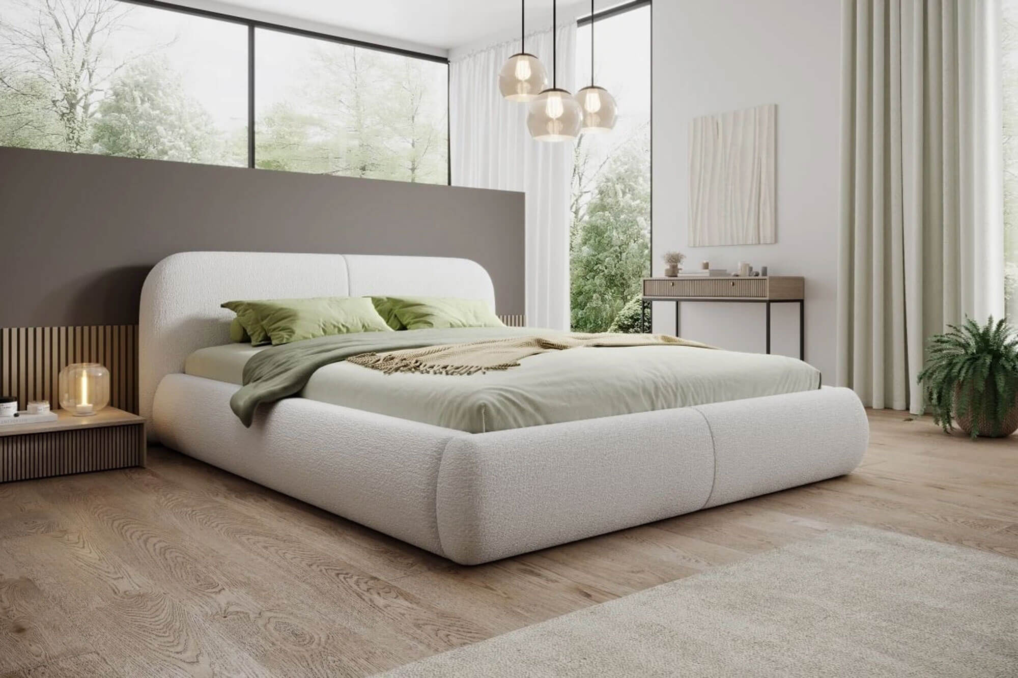 Łóżko tapicerowane z pojemnikiem FOGO 200x200 to propozycja dla osób, które cenią przestrzeń, wygodę i nowoczesny styl. Charakterystyczne, zaokrąglone zagłowie nadaje mu elegancki wygląd, a jednocześnie zapewnia wyjątkowy komfort podczas czytania lub relaksu. To idealny wybór do dużych sypialni, w których liczy się zarówno estetyka, jak i funkcjonalność. Model FOGO 200x200 został zaprojektowany z dbałością o każdy szczegół. Trwała konstrukcja z płyty laminowanej i drewna gwarantuje solidność oraz stabilność, a system wentylacji zapewnia odpowiednią cyrkulację powietrza i ochronę materaca przed wilgocią. Duży pojemnik na pościel otwierany mechanizmem sprężynowym ułatwia codzienne użytkowanie i pomaga utrzymać porządek w sypialni. Łóżko FOGO 200x200 to połączenie elegancji, praktyczności i polskiej jakości wykonania. Każdy detal został starannie dopracowany, dzięki czemu mebel zachowuje swój wygląd i trwałość przez wiele lat. Możliwość wyboru koloru tkaniny sprawia, że z łatwością dopasujesz go do aranżacji swojej sypialni, tworząc wyjątkowo komfortowe miejsce do wypoczynku.