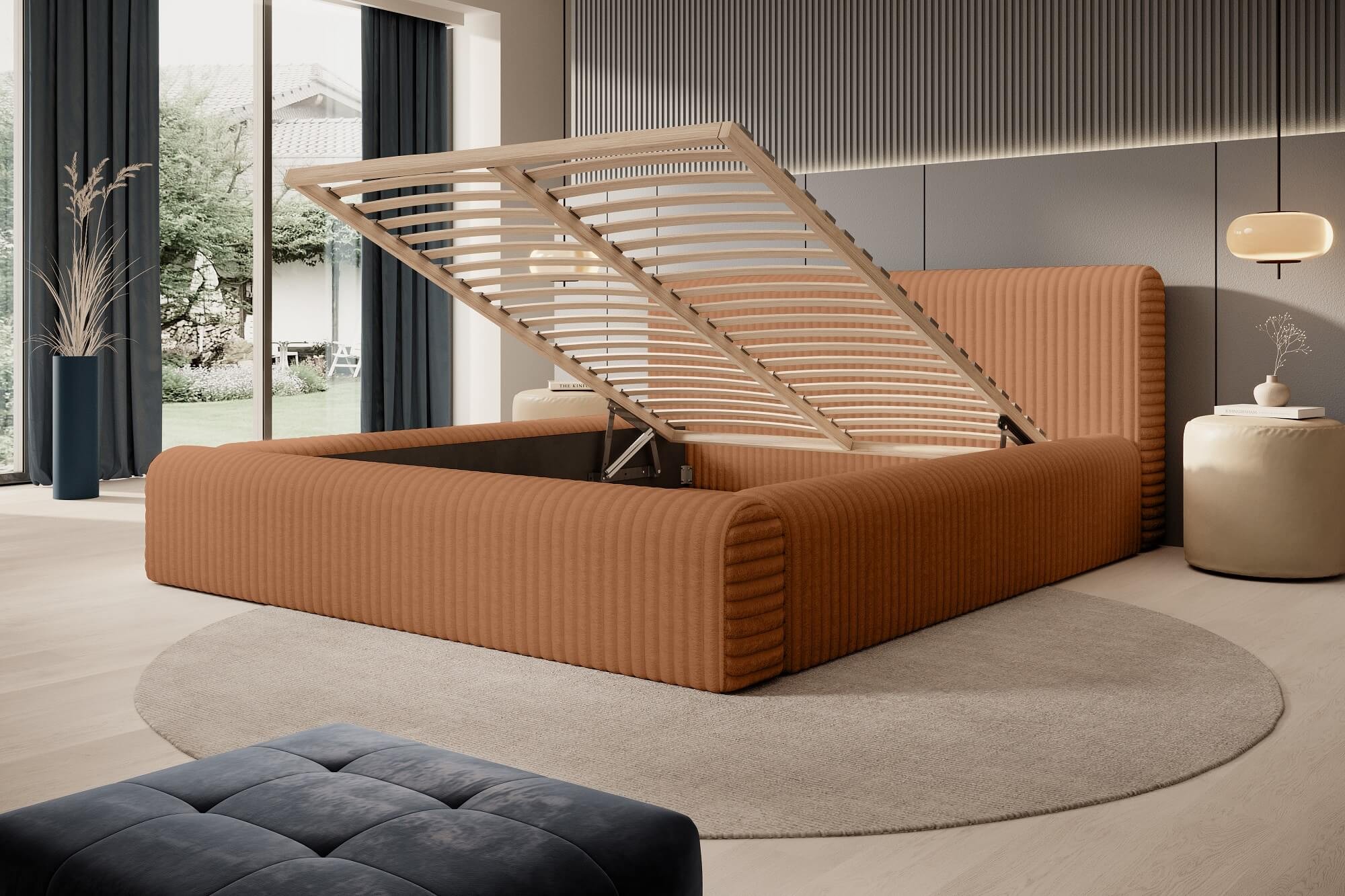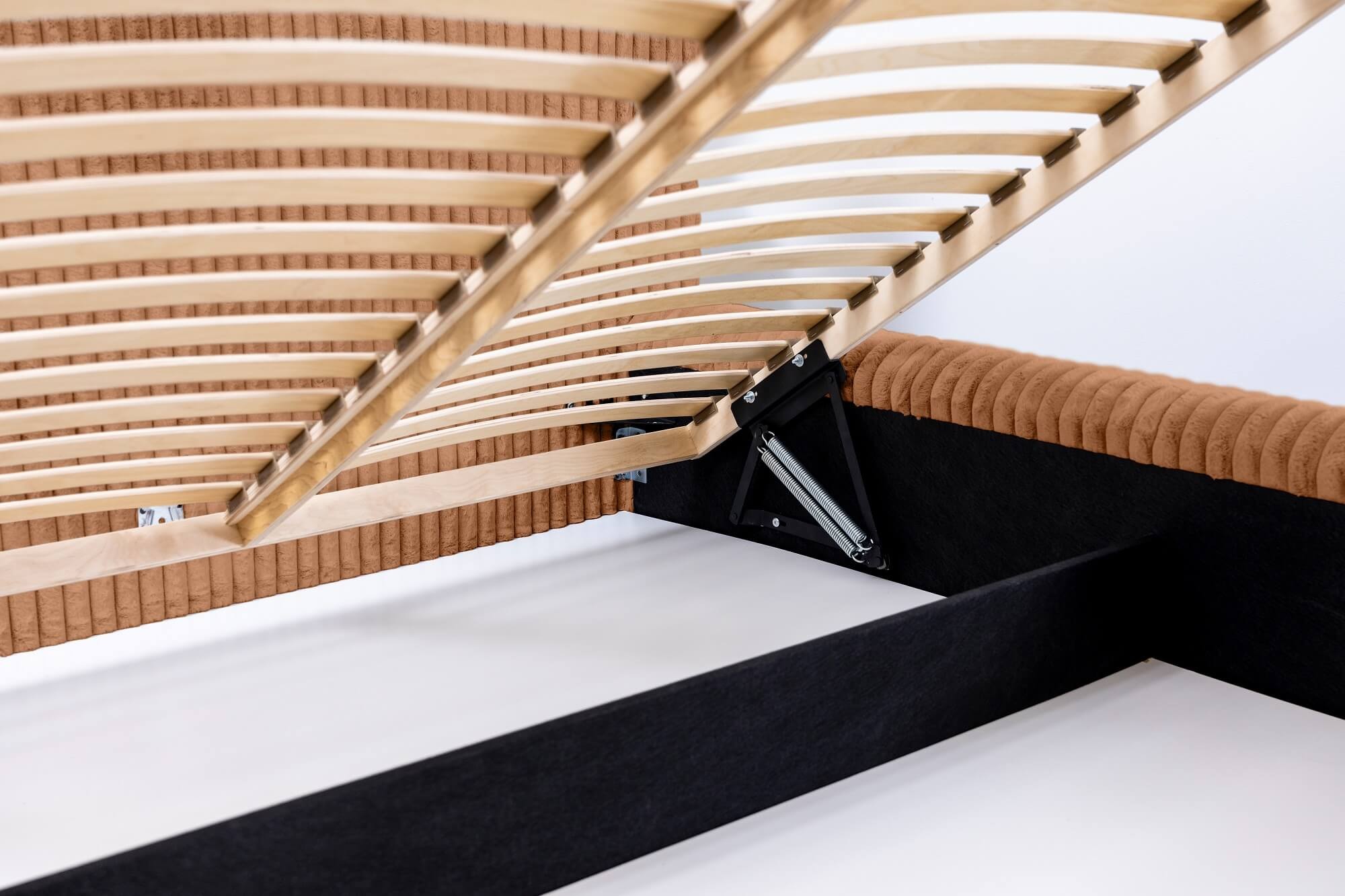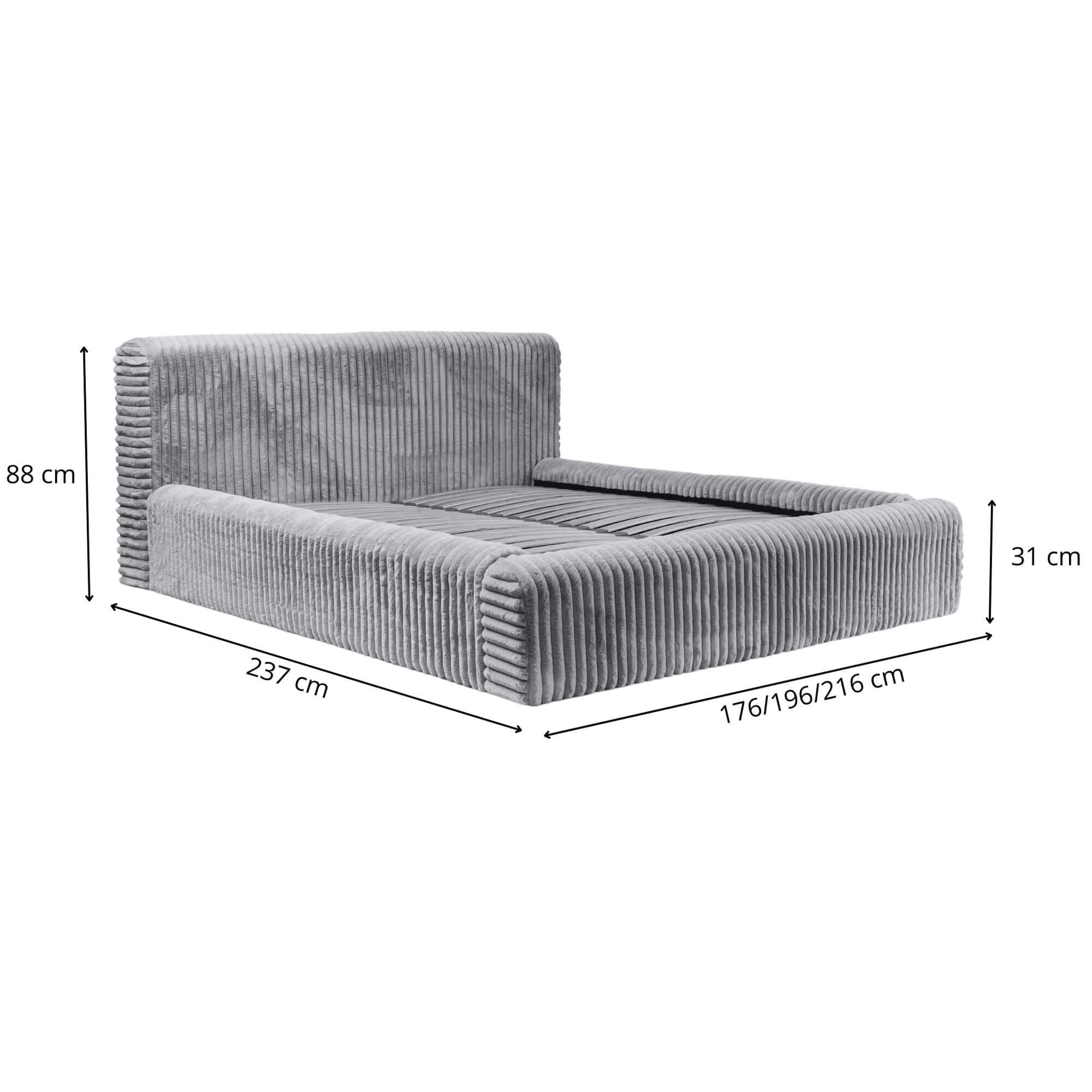 HANA to doskonały wybór dla osób poszukujących prawdziwego komfortu w swojej sypialni. Elegancka, prosta bryła o nowoczesnym wyglądzie i delikatnych zaobleniach, otulona futerkową tkaniną Vito idealnie wpasowuje się w różnorodne style wnętrz. Wybierając spośród licznych wariantów kolorystycznych oraz rodzajów tkanin z łatwością wyczarujesz sypialnię swoich marzeń. Jego kompaktowa konstrukcja, minimalistyczny charakter i duży rozmiar pod materac 180x200 pozwalają na niewątpliwie szybkie i łatwe dopasowanie do różnych przestrzeni. Dzięki solidnej konstrukcji zapewnisz sobie wyjątkowy wypoczynek, a możliwość wyboru koloru i stelaża pozwoli jeszcze dokładniej dopasować mebel do indywidualnych potrzeb. Stelaż pod materac to solidna baza złożona z drewnianej lub metalowej ramy oraz listewek sprężynujących dla dodatkowego komfortu oraz swobodnego przepływu powietrza, co ogranicza zbieranie się kurzu i wilgoci. Automatyczne podnośniki umożliwiają łatwe podnoszenie i opuszczanie materaca, dając łatwy dostęp do pojemnika na pościel, który znajduje się pod stelażem - oferuje on sporo miejsca na zestawy pościeli, koce czy inne przedmioty oraz pozwala skutecznie zaoszczędzić miejsce w sypialni.