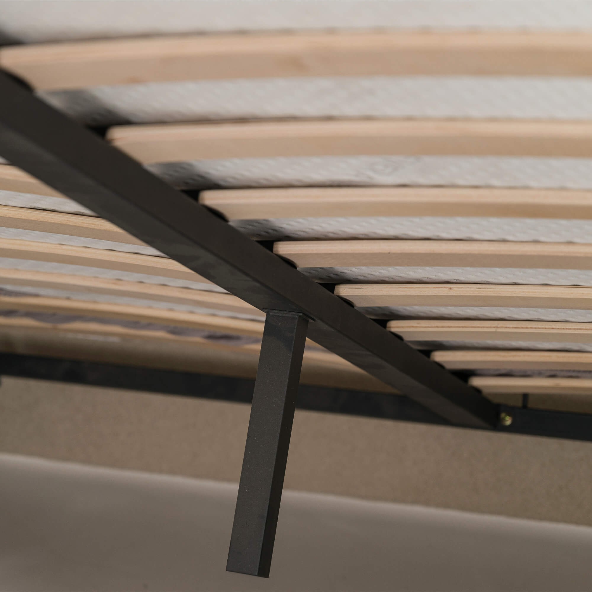 • Solidny stelaż wykonany ze sklejki drewnianej zapewniający trwałość i stabilność łóżka.