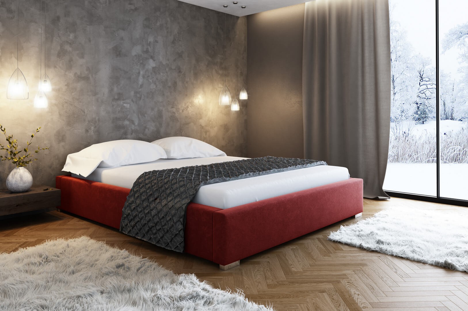 Minimalistyczne i niezwykle oryginalne łóżko 160x200 bez zagłówka. Idealne, by wyeksponować piękną ścianę za łóżkiem czy też poukładać przy niej duże, mięciutkie poduchy w dekoracyjnych poszewkach.