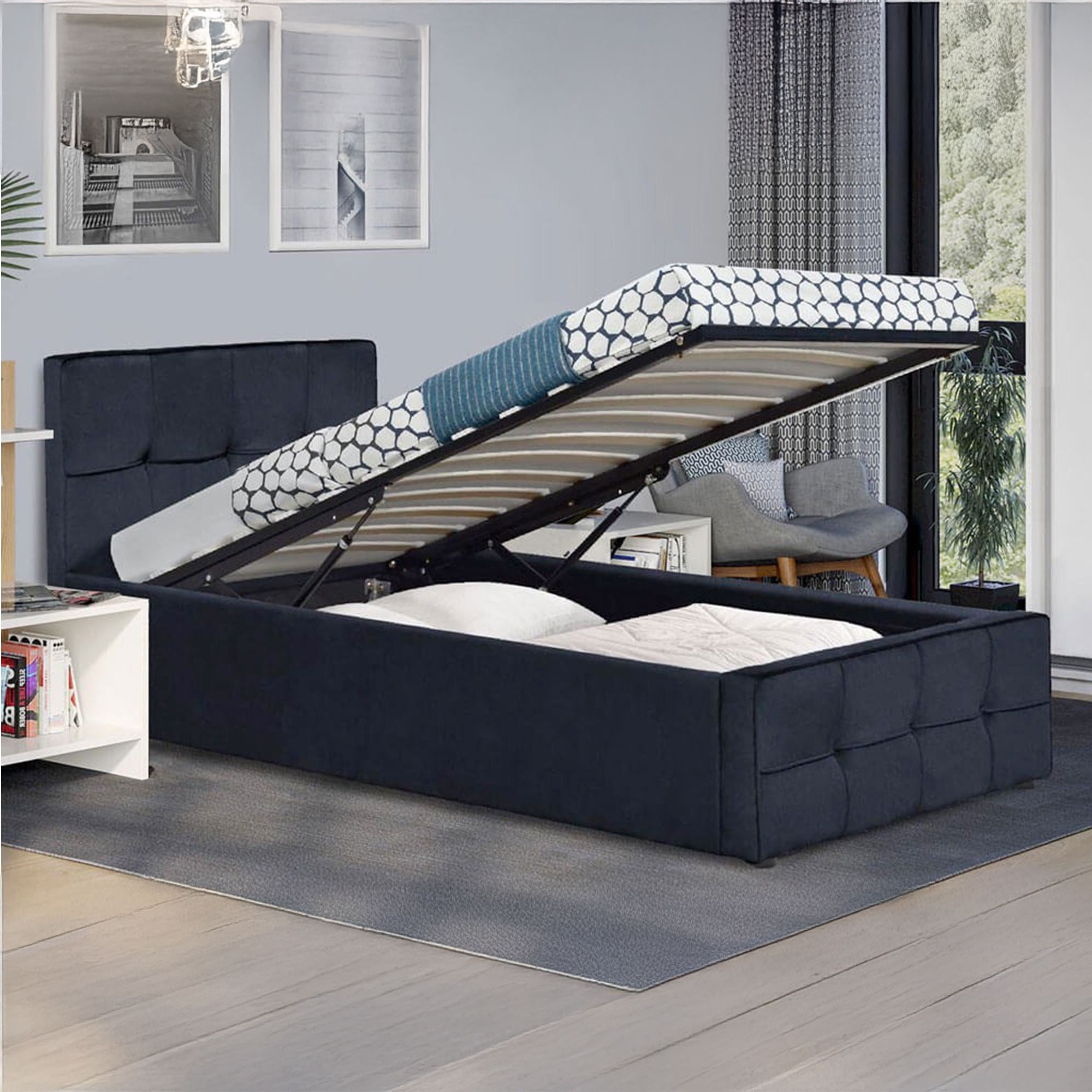 Łóżko tapicerowane 90X200 SFG004P pokryte czarnym welurem to nie tylko eleganckie, ale również niezwykle funkcjonalne rozwiązanie dla każdej sypialni. Wyposażone jest w pojemnik na pościel, który jest niezwykle praktycznym rozwiązaniem pozwalającym na utrzymanie porządku i oszczędność przestrzeni. Dostęp do przechowywanych przedmiotów jest ułatwiony dzięki podnośnikowi gazowemu. Dodatkowo stelaż metalowy to gwarancja stabilności i długiej żywotności łóżka. Starannie zaprojektowany, z dbałością o każdy detal, wspiera materac, zapewniając komfortowy i zdrowy sen.
