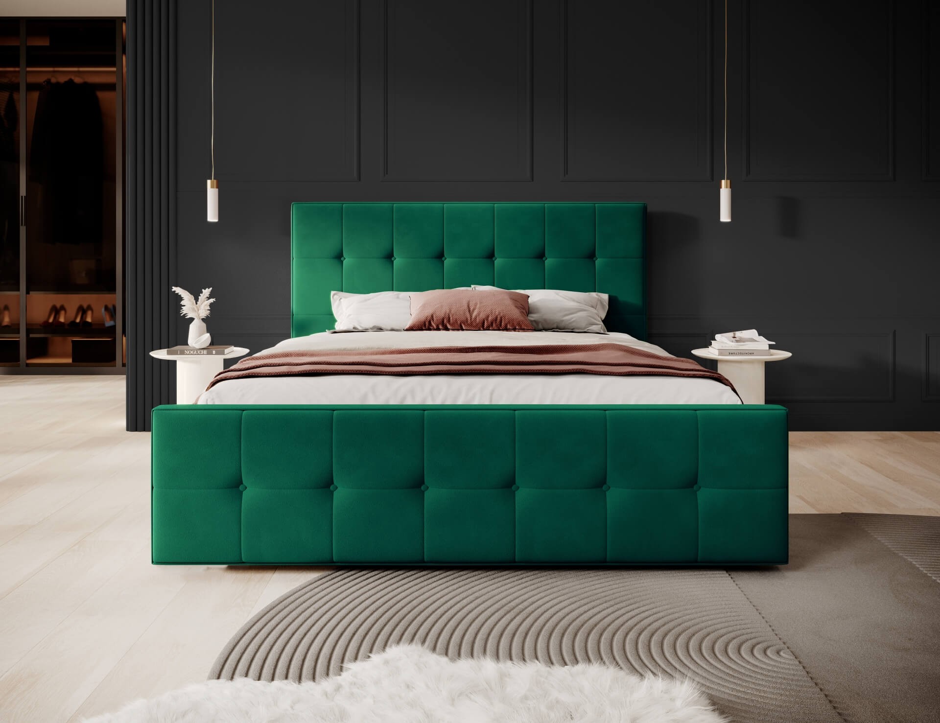 • Rama łóżka wykończona jest z wysokiej jakości tkaniny tapicerskiej ( welur )