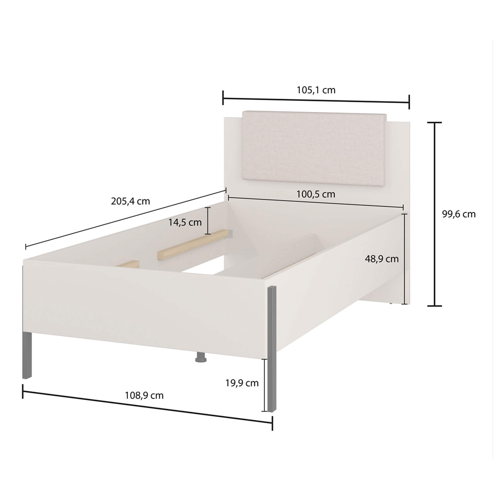 • Łóżko wykonane z płyty meblowej, z widocznymi obrzeżami zabezpieczonymi obrzeżem ABS, matowe wykończenie.