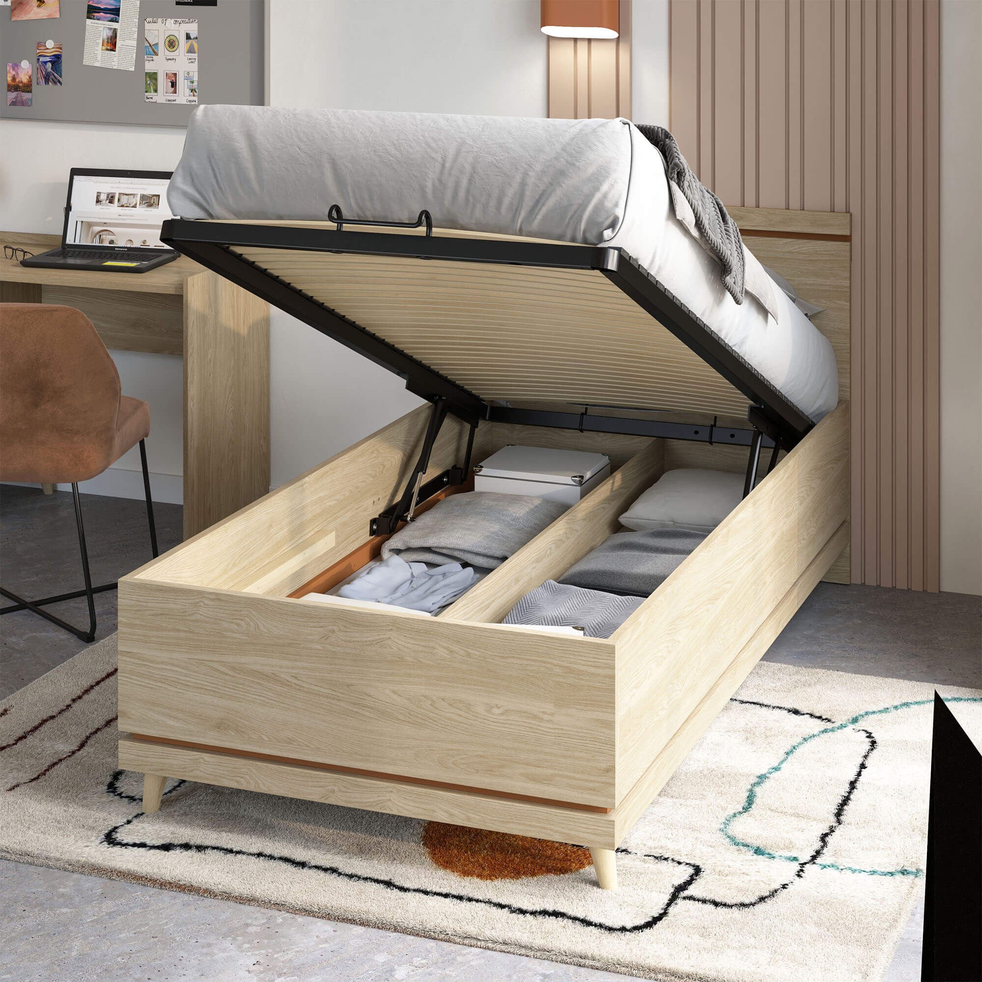 • Pojemny schowek na pościel pod stelażem.