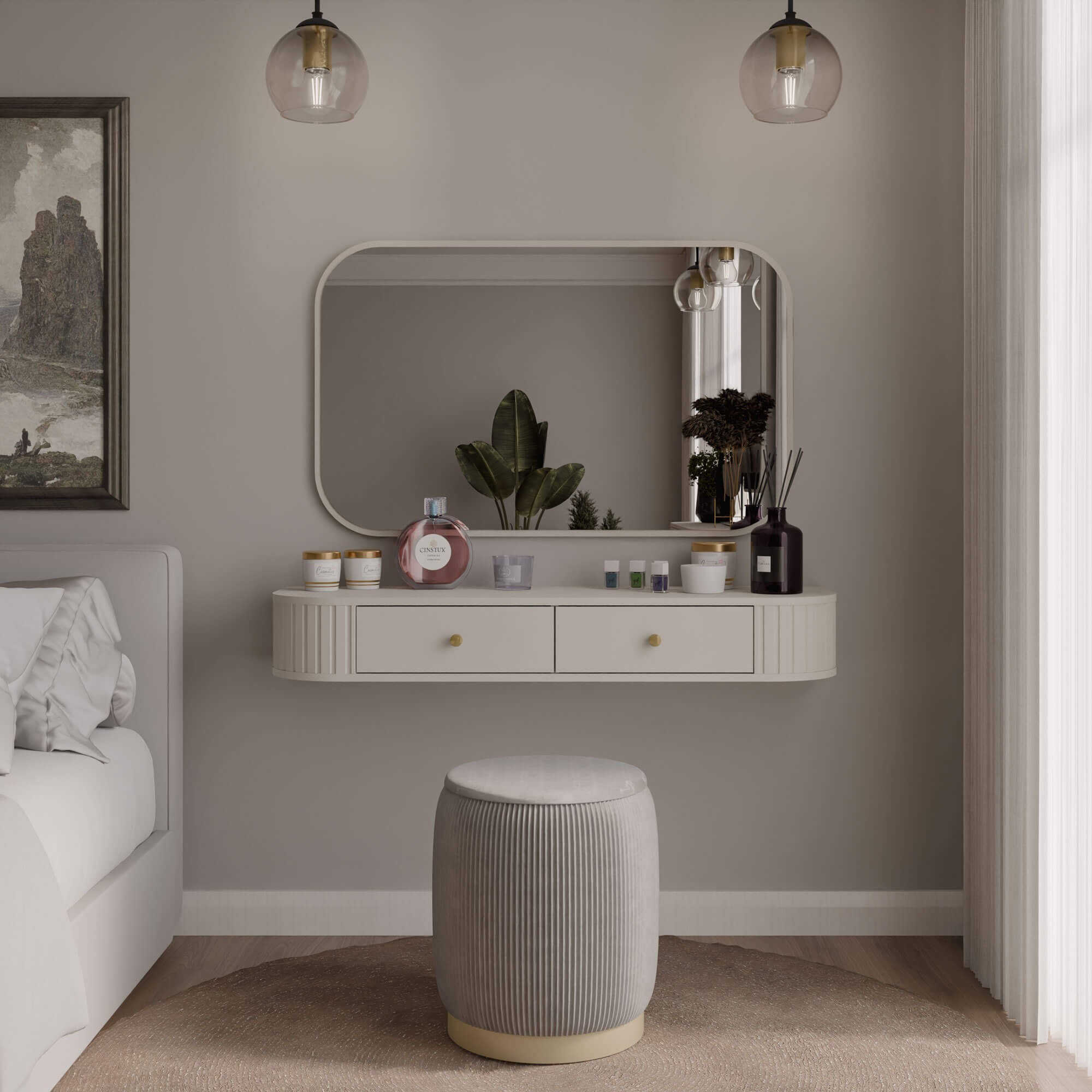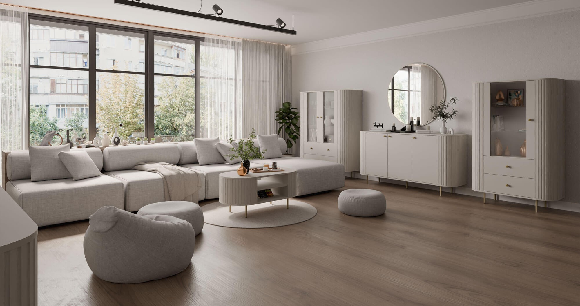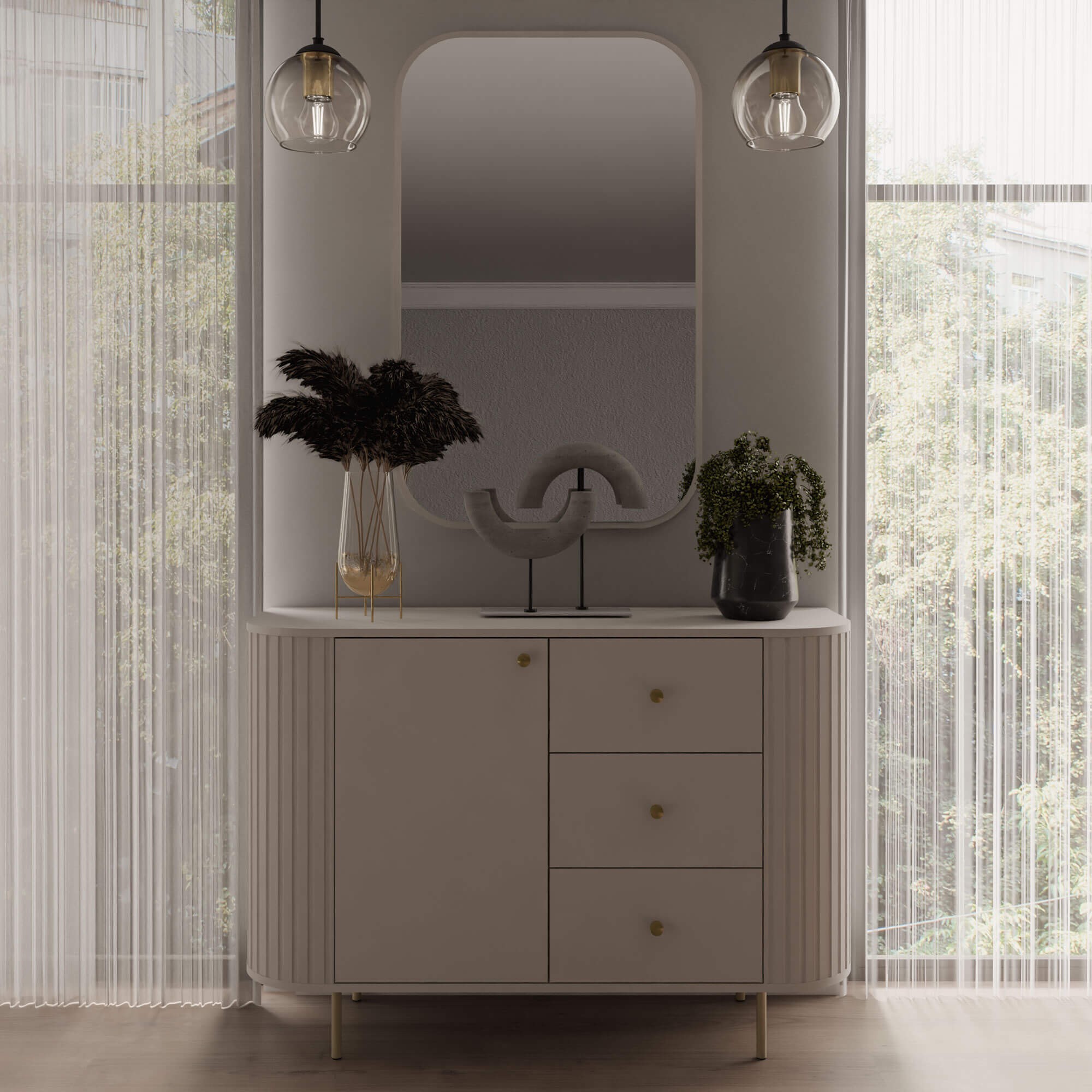 Model został zaprojektowany jako element dopełniający komody i szafki RTV z tej samej serii. W zestawieniu z ryflowanymi bokami mebli oraz złotymi detalami tworzy elegancką i spójną kompozycję. To doskonały wybór do salonu, sypialni, jadalni czy przedpokoju – wszędzie tam, gdzie liczy się styl, światło i harmonia.