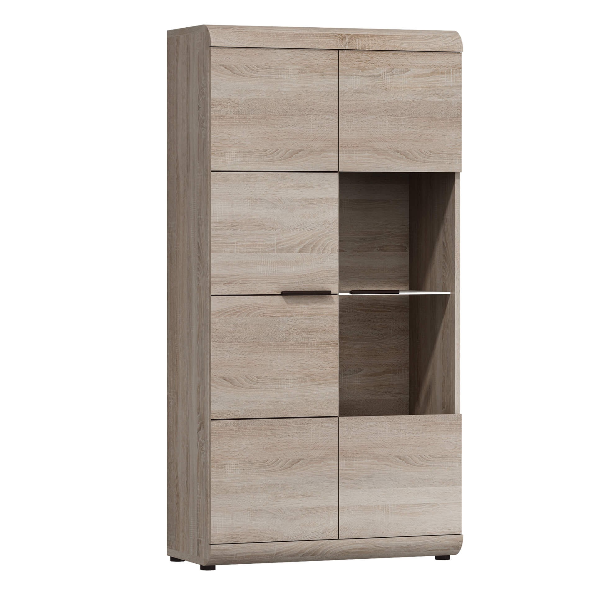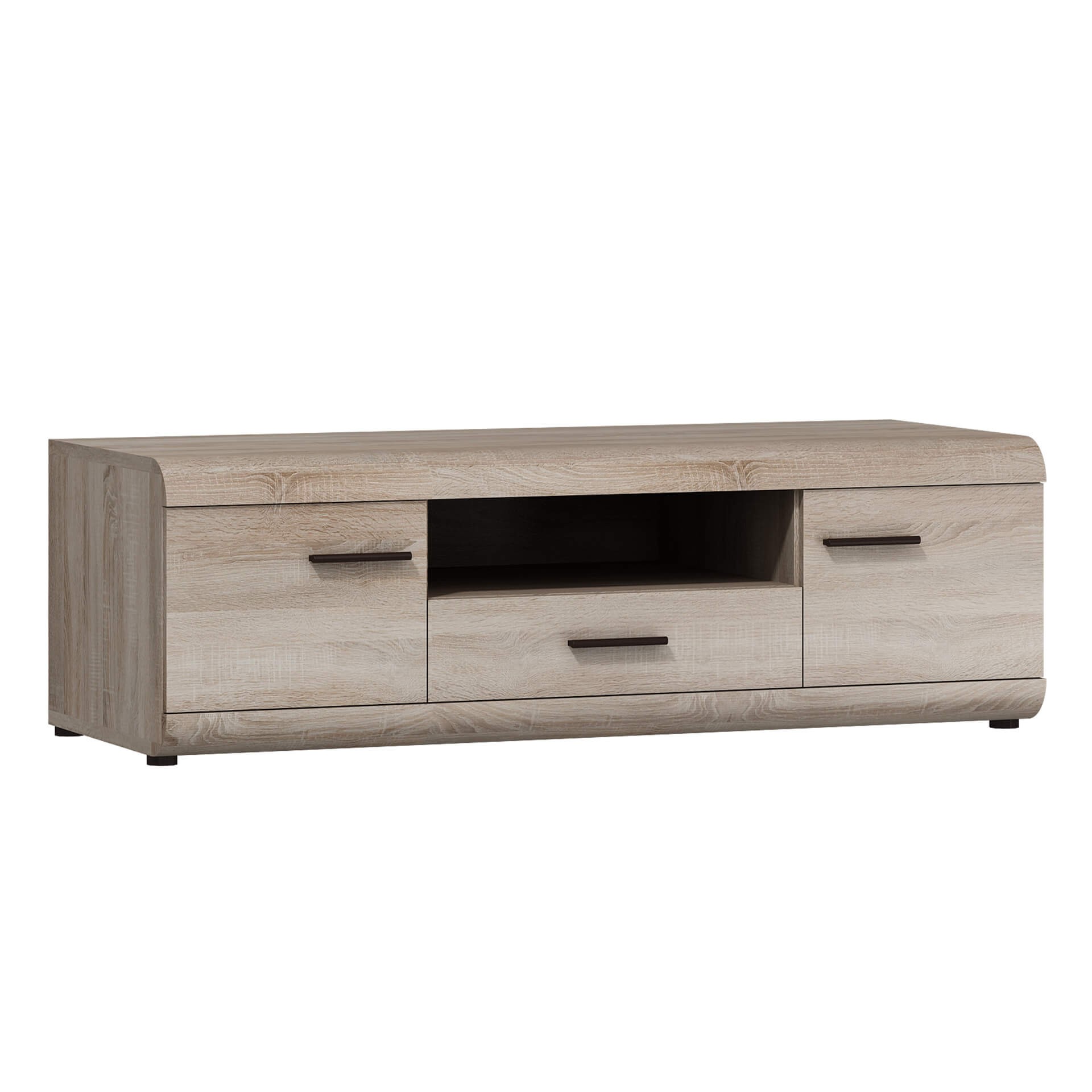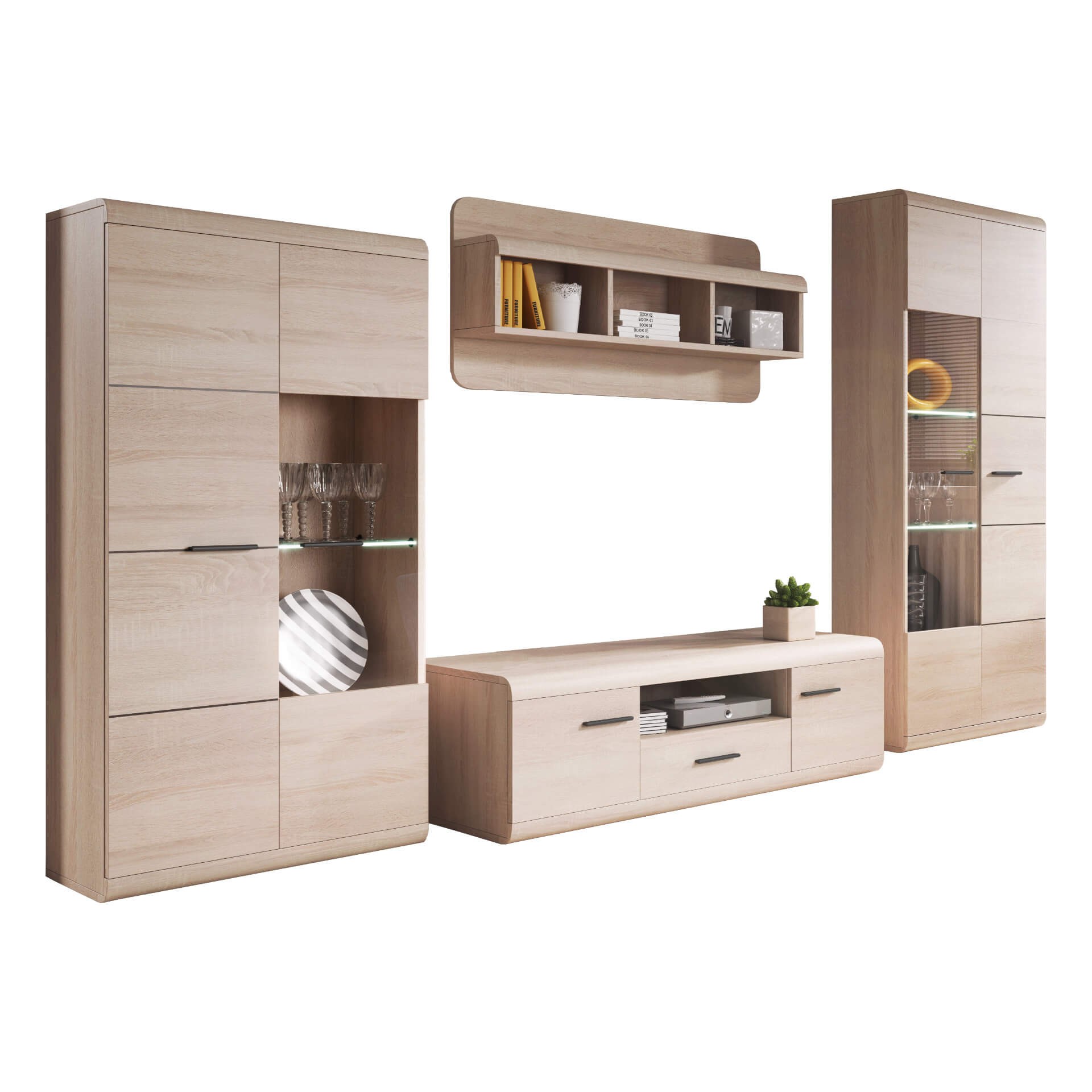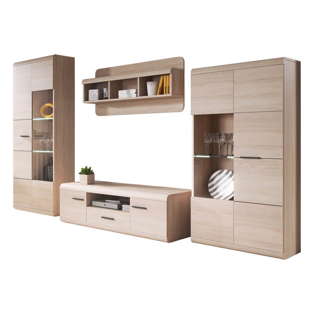 MEBLOŚCIANKA (LINK A+B+C+D) / DĄB SONOMA stanowi znakomite rozwiązanie do wnętrz zaaranżowanych w stylu nowoczesnym. Na uwagę zasługują tu między innymi zaoblone kształty brył oraz frezowane fronty. Zestaw został wyprodukowany z trwałej, odpornej na zarysowania oraz działanie wilgoci, łatwej w utrzymaniu w czystości płyty laminowanej o grubości 16 mm. Korpus zabezpiecza obrzeże ABS chroniące przed zniszczeniem. Elementy szklane wykonano ze szkła hartowanego cechującego się podwyższoną odporności na uszkodzenia mechaniczne. Wygodę korzystania z szuflad gwarantują prowadnice rolkowe pozwalające na komfortowe i płynne otwieranie oraz zamykanie. W skład kompletu wchodzą następujące meble: stolik RTV, półka wisząca, witryna niska oraz witryna wysoka.