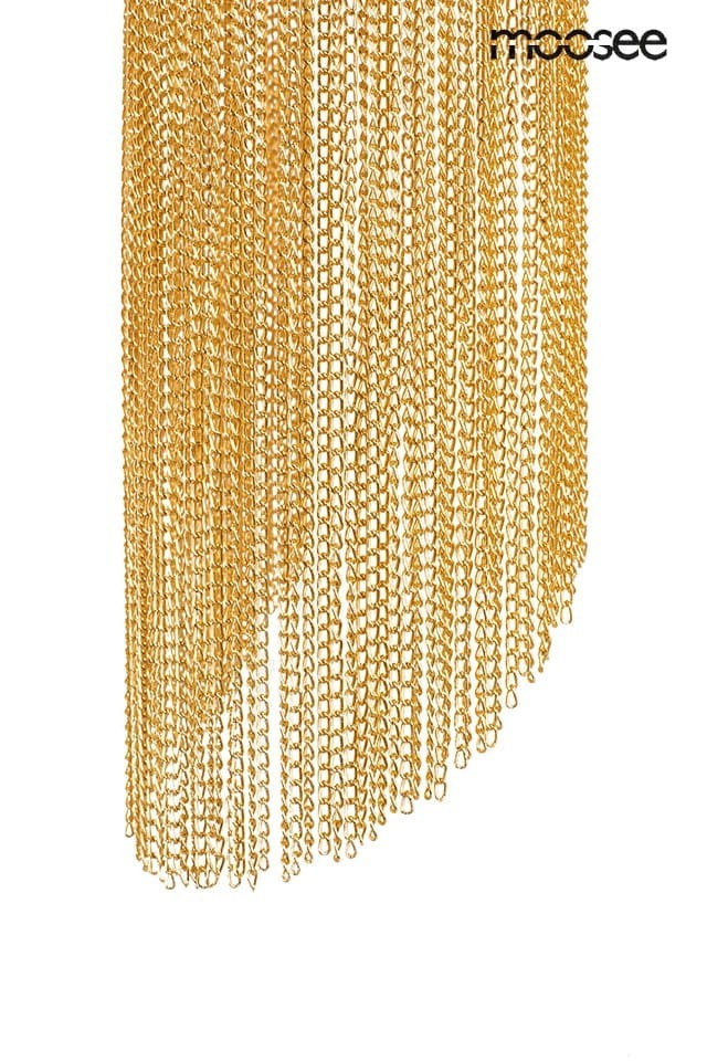 Oprawę wykonano z metalu w złotym kolorze, a jej klosz tworzą delikatne łańcuszki.