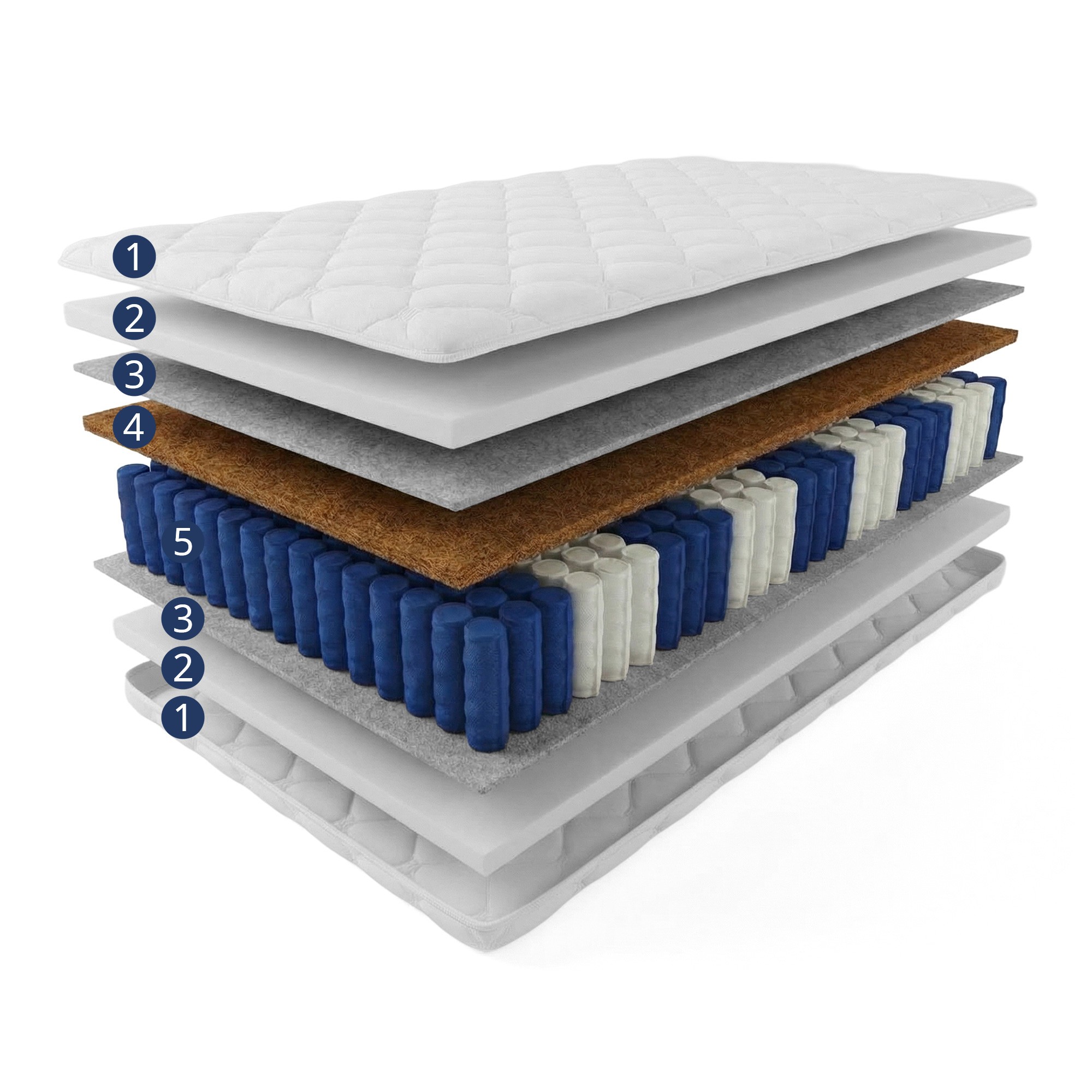 4. Kokos lateksowany - surowiec naturalny wykonany z włókna kokosowego wulkanizowanego naturalnym lateksem. Nie wydziela żadnych toksyn, ani szkodliwych substancji, które mogłyby niekorzystnie oddziaływać na skórę bądź drogi oddechowe. Warstwa kokosu nadaje twardość i wytrzymałość nie ujmując przy tym elastyczności. Pochłania wydzielany pot i wilgoć co w połączeniu ze strukturalnymi właściwościami włókien zapewnia idealną warstwę przewiewną dla materaca. Ma bardzo dobre właściwości termiczne, antyalergiczne i antygrzybiczne.