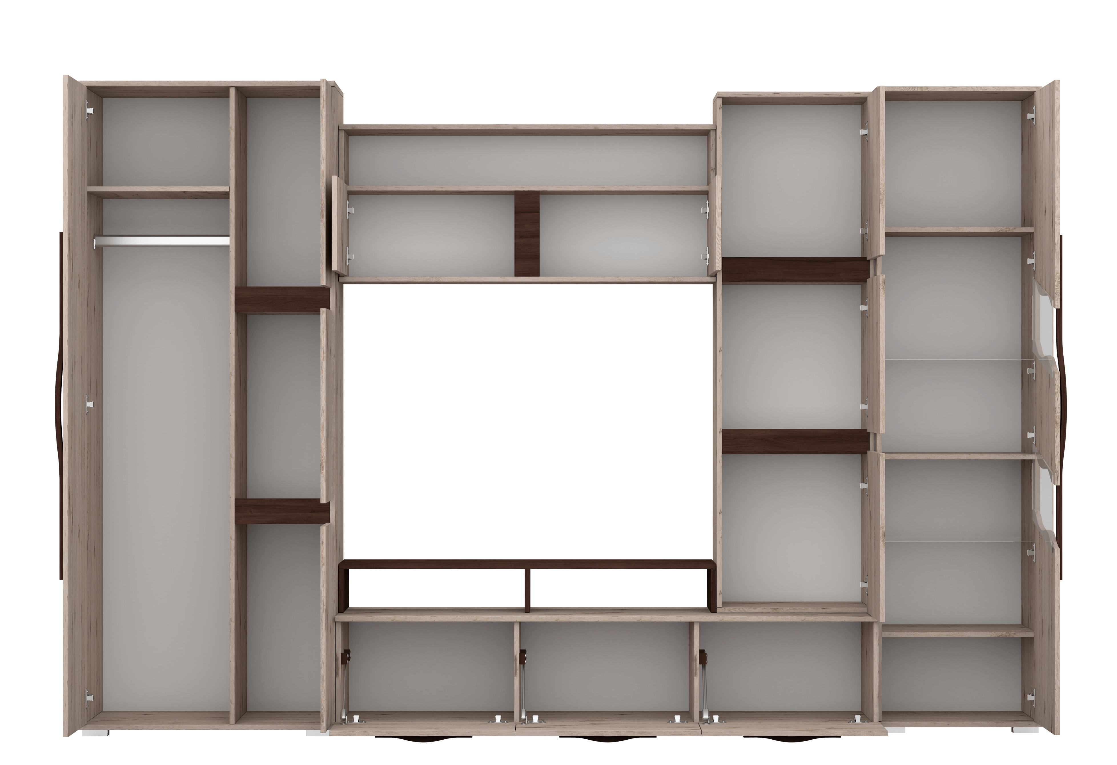 Meblościanka San Marino idealnie sprawdza się w niewielkich pokojach, gdzie ważne jest maksymalne wykorzystanie przestrzeni. Wyposażona jest w pojemną szafę, nadstawkę, szafkę RTV, liczne praktyczne półki oraz witrynę z frontem z dekoracyjnego dymionego szkła. Całość zdobią wstawki i uchwyty w kolorze czekolady. Meblościanka nie posiada płyty pomiędzy szafką RTV a nadstawką/półką.