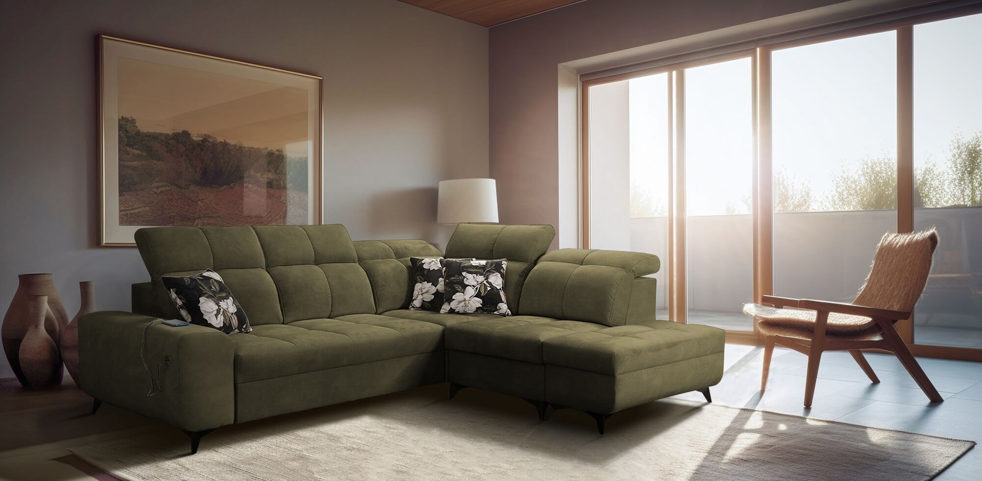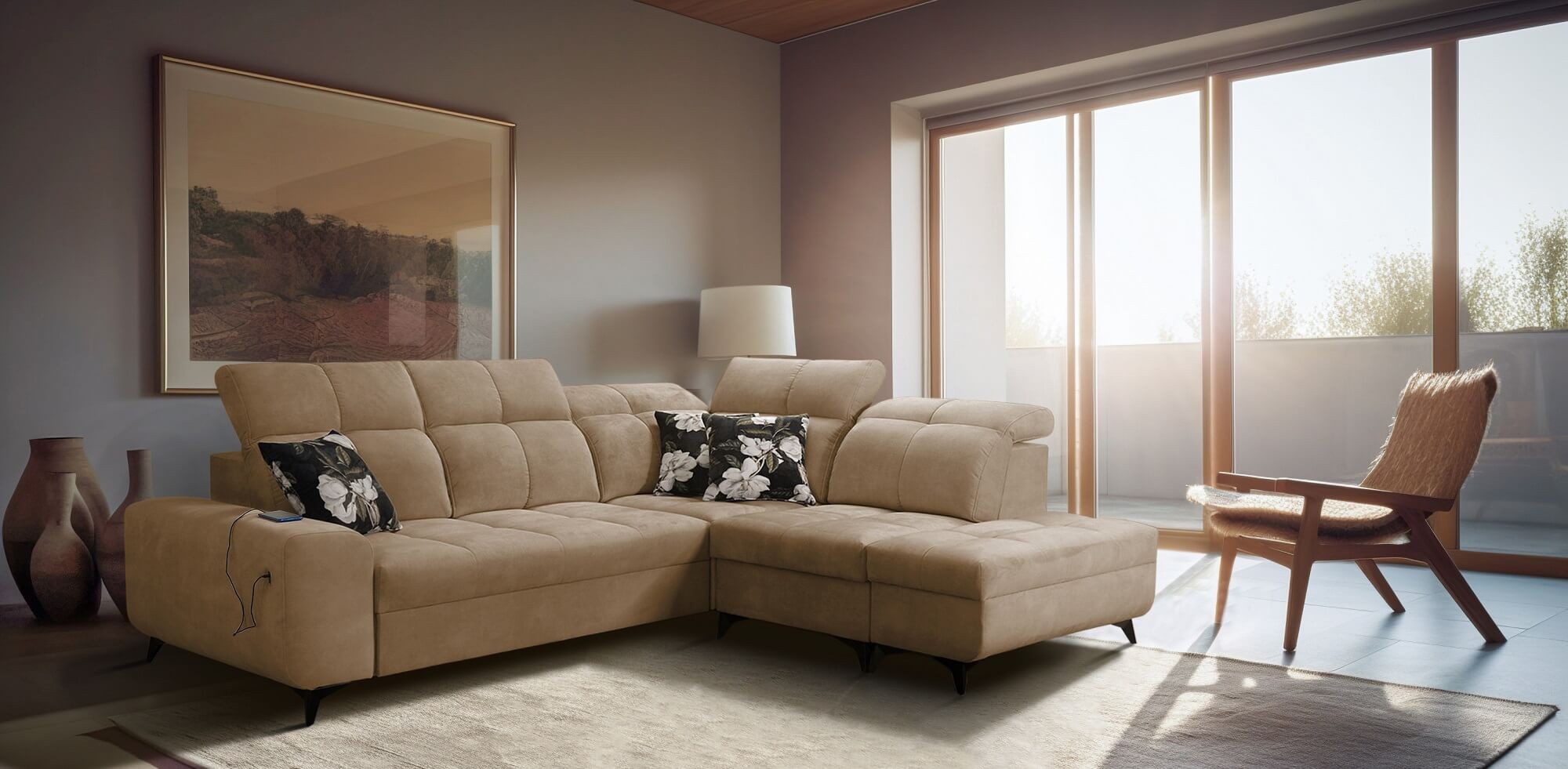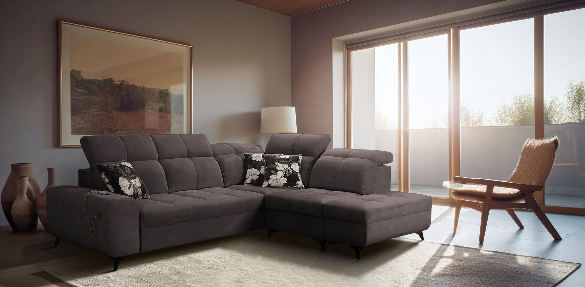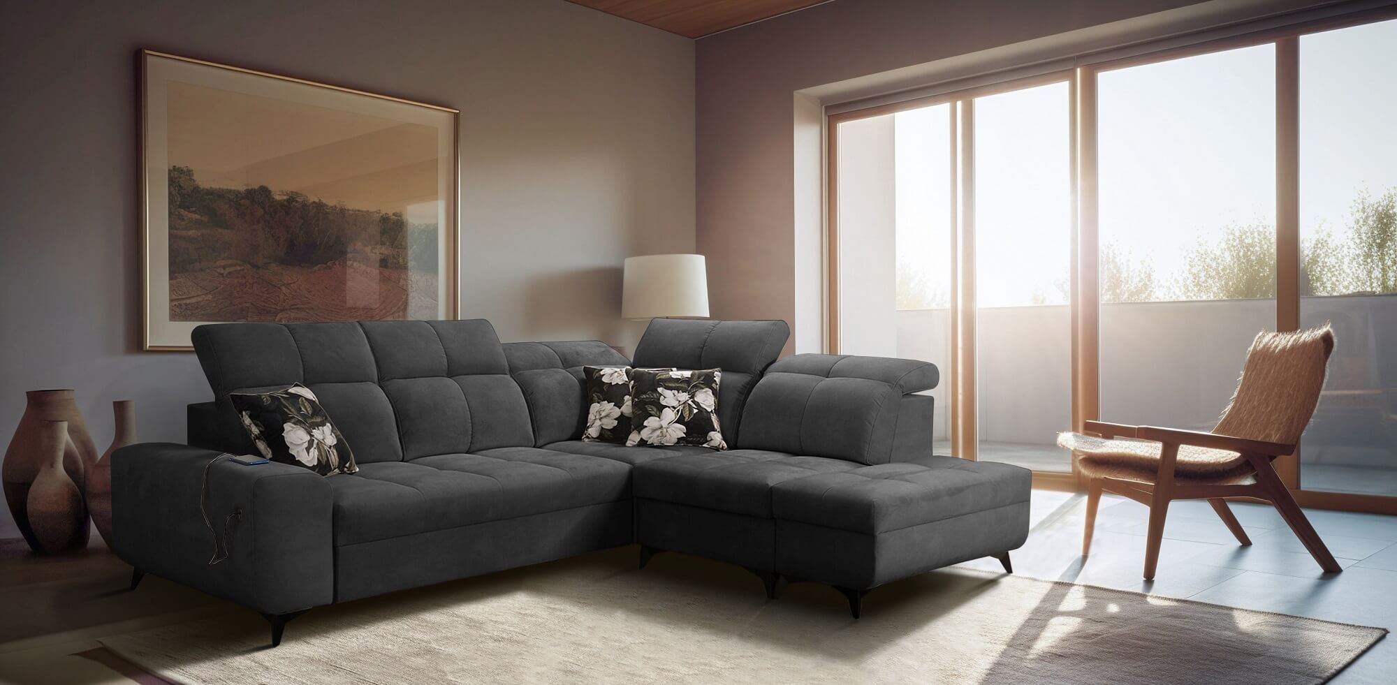 Narożnik GOLDIN VII | Funkcja spania, pojemnik, regulowane zagłówki, USB | Kolor do wyboru