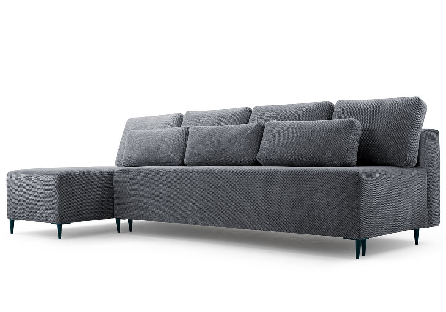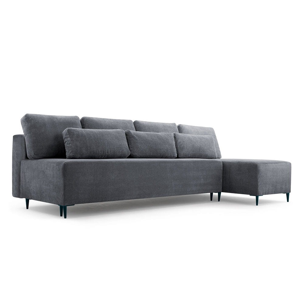 Narożnik z funkcją spania MAROKO jest oferowany w interesującej gamie kolorów, a jego nowoczesne czarne nóżki dodają mu stylowego wyglądu. Wyposażony jest w funkcję spania o wymiarach 120x251 cm oraz pojemnik na pościel. Tył narożnika jest pokryty materiałem w kolorze pasującym do reszty mebla. Tkanina ONEGA to niezwykle miękka i przyjemna w dotyku tkanina tapicerska o unikalnej strukturze. Materiał ten jest odporny na wchłanianie płynów i przyjazny dla zwierząt.