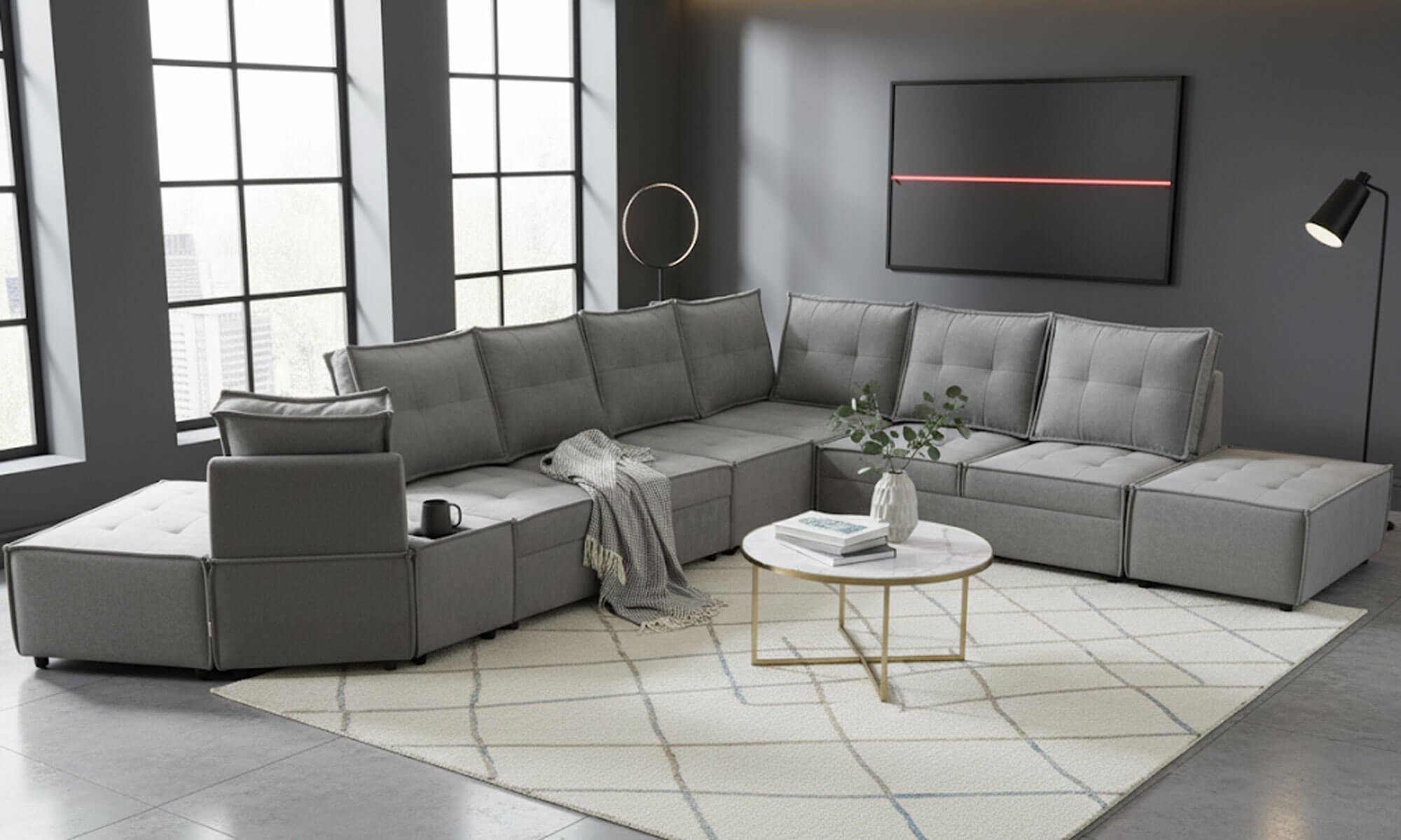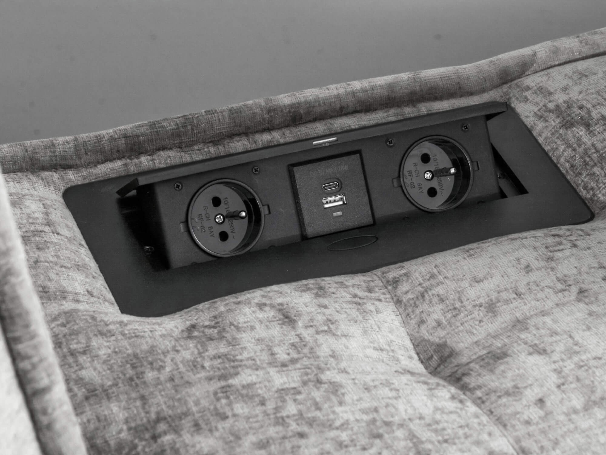 Narożnik modułowy z funkcją spania CLARA PUFA+R2+R4+2F+R1+1+PUFA to mebel stworzony dla osób, które cenią sobie wygodę, funkcjonalność i możliwość dopasowania wnętrza do własnych potrzeb. Dzięki modułowej budowie można go aranżować w różny sposób, tworząc układ idealnie pasujący do salonu. Rozkładana funkcja spania sprawia, że narożnik świetnie sprawdzi się również jako dodatkowe miejsce noclegowe. System CLARA wyróżnia się nowoczesnymi rozwiązaniami – w kolekcji dostępne są moduły z regulacją głębokości siedziska, wbudowanym gniazdkiem prądowym oraz ładowarkami USB-A i USB-C. Dzięki temu korzystanie z laptopa czy telefonu podczas odpoczynku staje się wyjątkowo komfortowe. Poduszki wypełnione w 100% kulką silikonową gwarantują miękkość i sprężystość, zapewniając wygodę na najwyższym poziomie. Tapicerowane plecy pozwalają ustawić narożnik nie tylko przy ścianie, ale także w centralnej części pokoju, tworząc elegancki punkt wypoczynkowy. Szeroki wybór tkanin obiciowych umożliwia idealne dopasowanie do charakteru wnętrza – od nowoczesnych aranżacji po bardziej klasyczne stylizacje. CLARA PUFA+R2+R4+2F+R1+1+PUFA to narożnik modułowy z funkcją spania, który łączy design, praktyczność i komfort. To rozwiązanie dla osób, które chcą stworzyć w salonie przestrzeń nie tylko estetyczną, ale także wygodną i przyjazną w codziennym użytkowaniu.