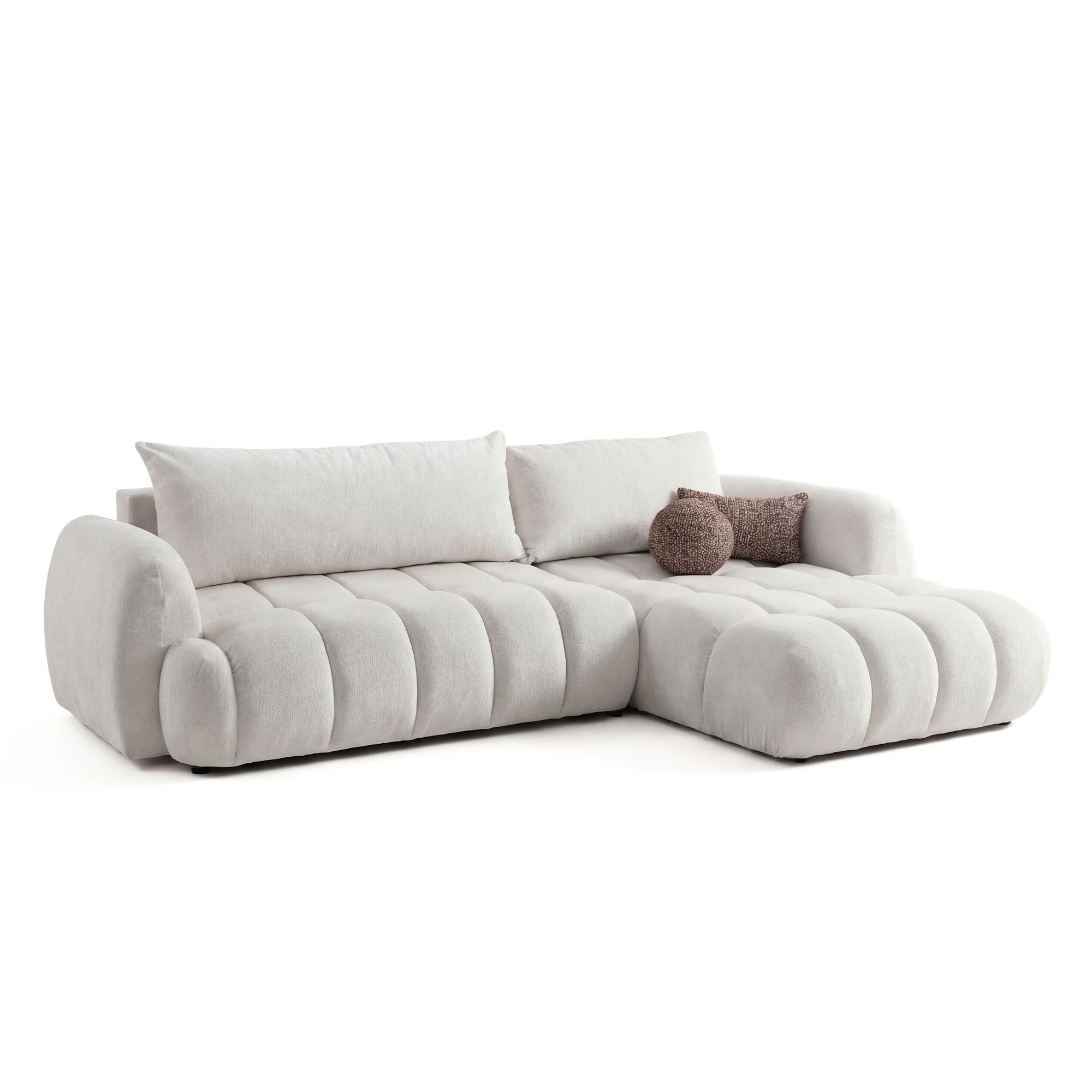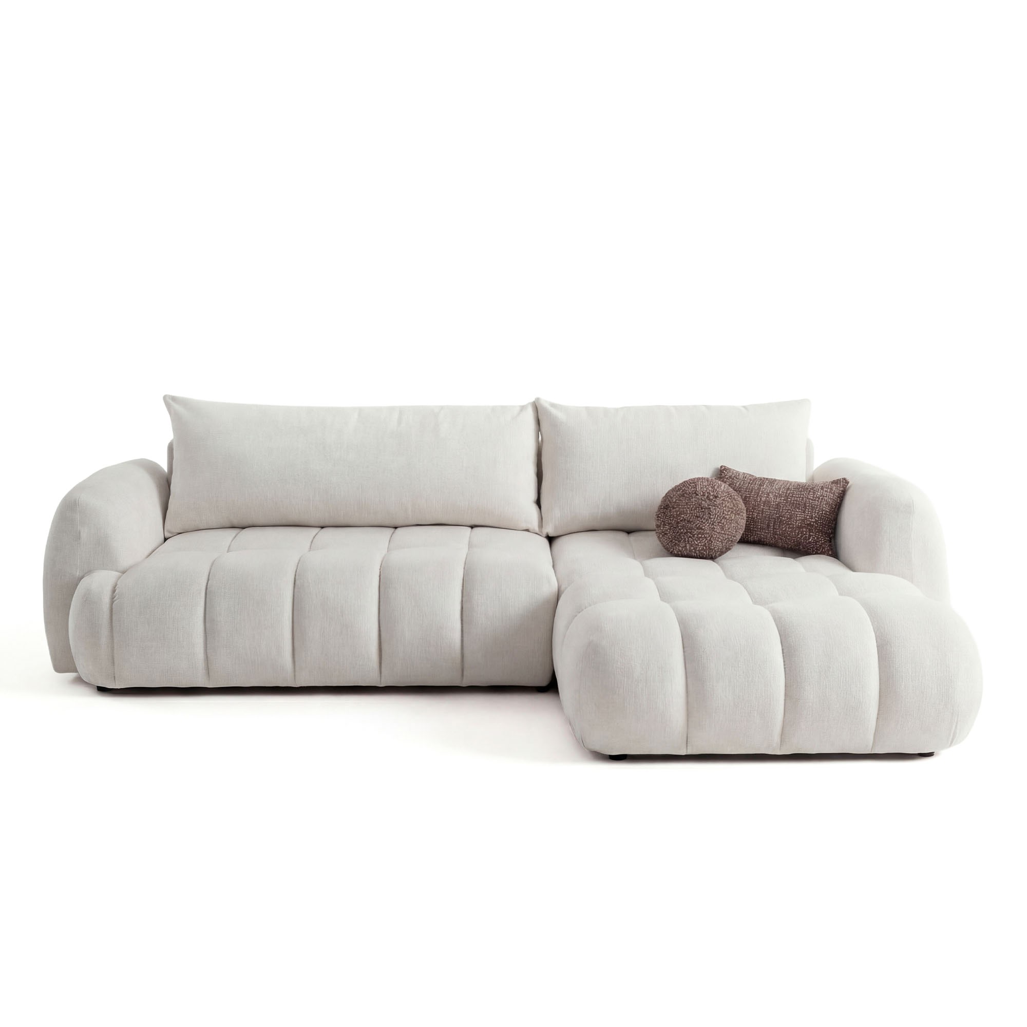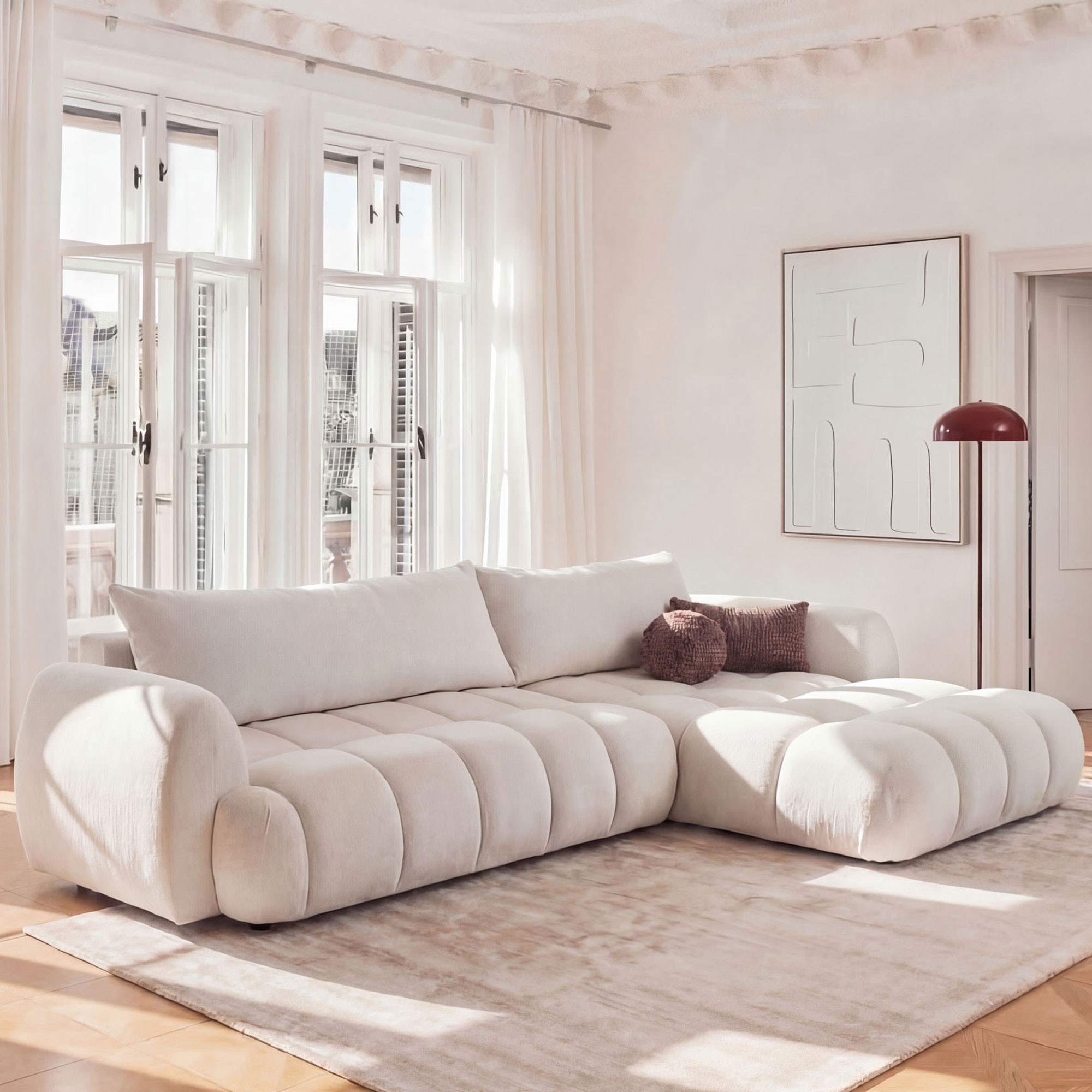 COCO 2 zwraca uwagę miękką, zaokrągloną formą i estetycznie wykończonym siedziskiem z regularnymi przeszyciami. Narożny układ daje więcej przestrzeni do siedzenia i leżenia, dzięki czemu mebel sprawdza się w salonie jako centralny punkt strefy wypoczynkowej.