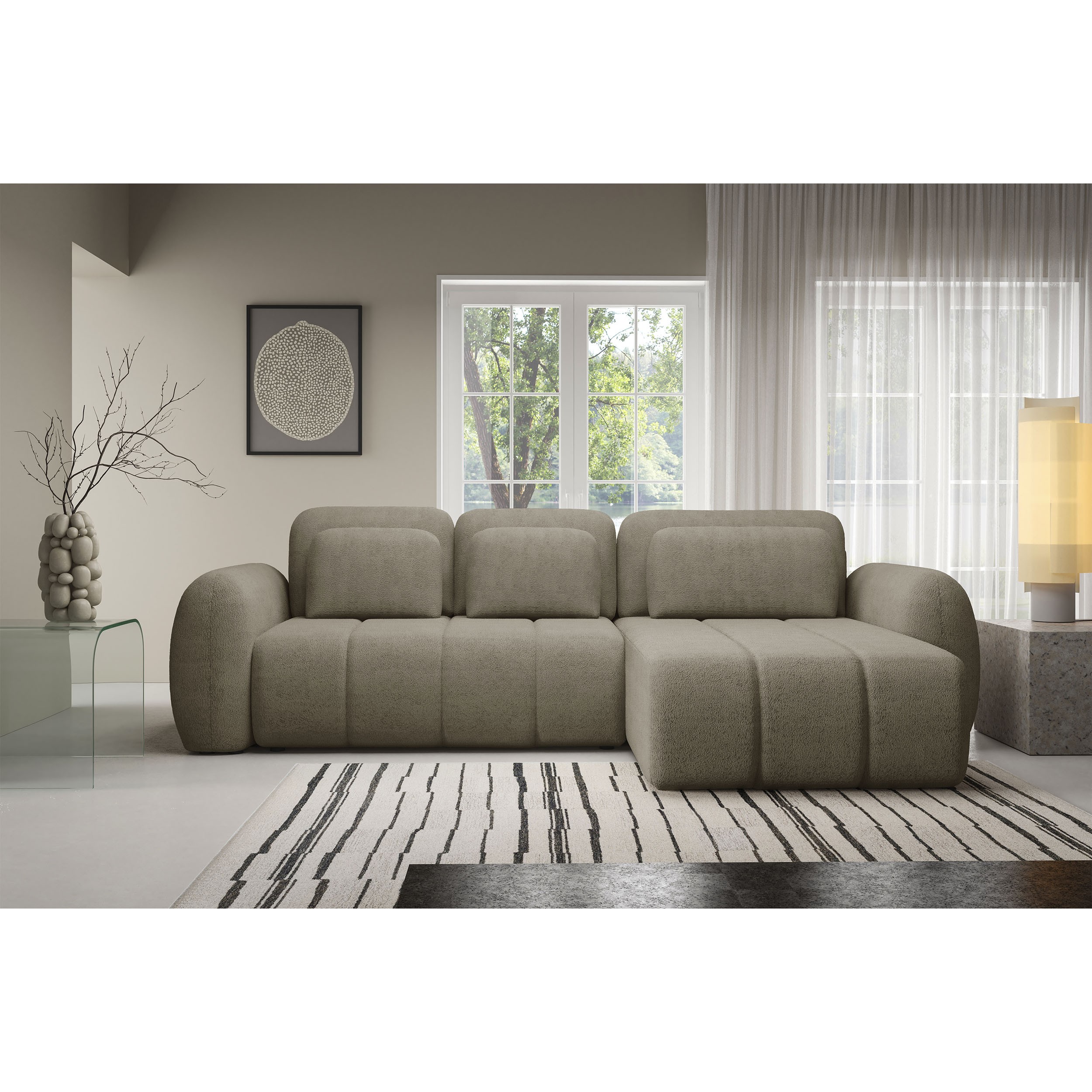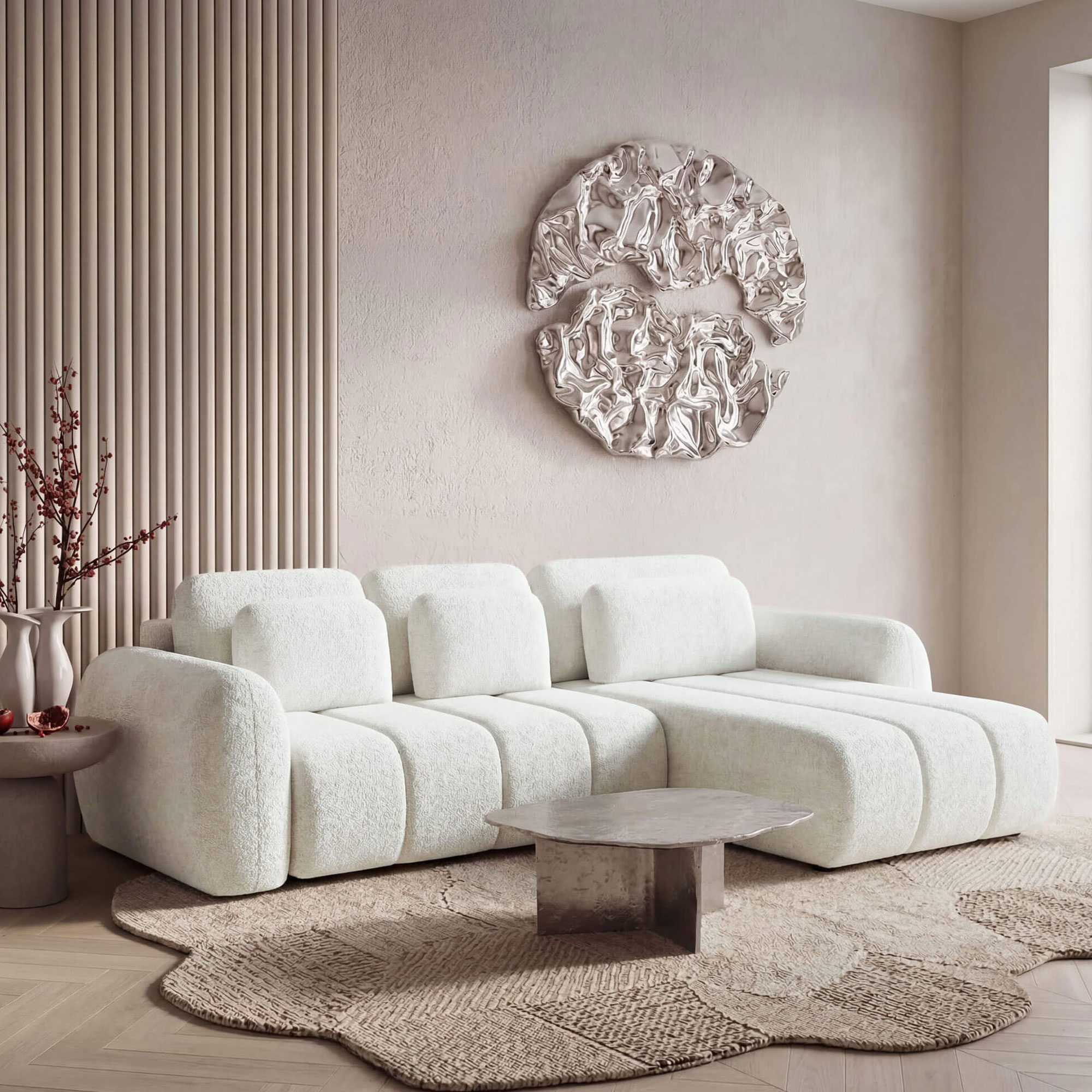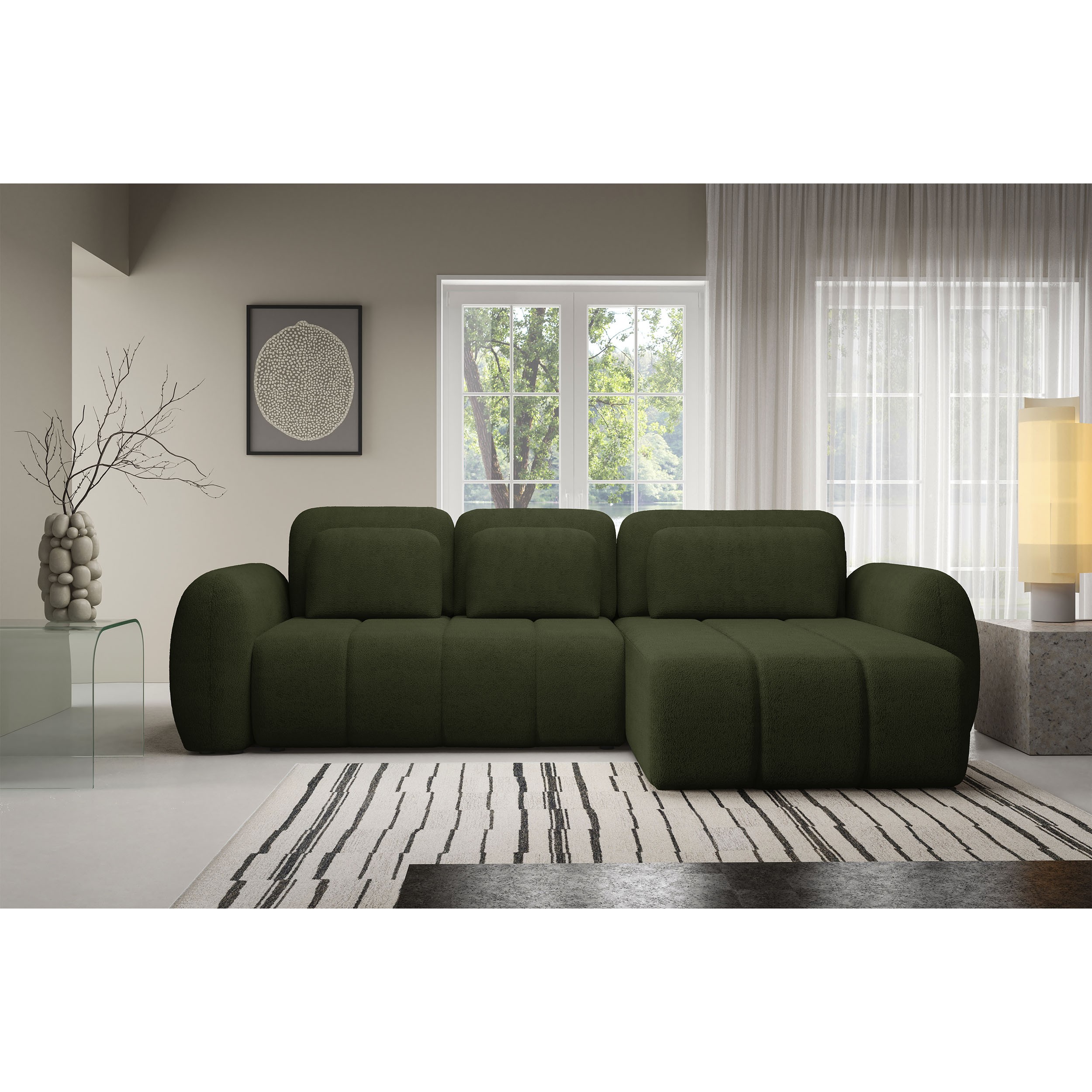 Modułowa kolekcja wypoczynkowa WOOGIE to możliwość zaplanowania swojej przestrzeni według własnych potrzeb. Przestronny i wygodny narożnik wykonany w mięciutkiej, przytulnej tkaninie barankowej boucle o nazwie Centaur jest cudownie miękki i wygodny. Swój niepowtarzalny wygląd zawdzięcza nie tylko wyjątkowej tkaninie, ale również miękkim, zaoblonym kształtom, które dodają ciepła, przytulności i są zdecydowanie bezpieczniejsze w obecności dzieci. Mebel, który idealnie wpisuje się w najnowsze trendy wnętrzarskie i potrzeby każdego z nas! Duży wybór kolorystyczny pozwoli na szybkie i łatwe dopasowanie do własnych potrzeb i aranżacji wnętrza. Siedzisko wypełnione sprężystą pianką oraz sprężynami jest wyjątkowo komfortowe oraz odporne na zgniecenia i odkształcenia, zapewniając długą żywotność i idealny wygląd mebla na długie lata. Tapicerowane plecki doskonale sprawdzają się, jeśli chcemy ustawić narożnik w centrum strefy dziennej. Połączenie doskonałego designu, wygody i funkcjonalności – nie zwlekaj dłużej!