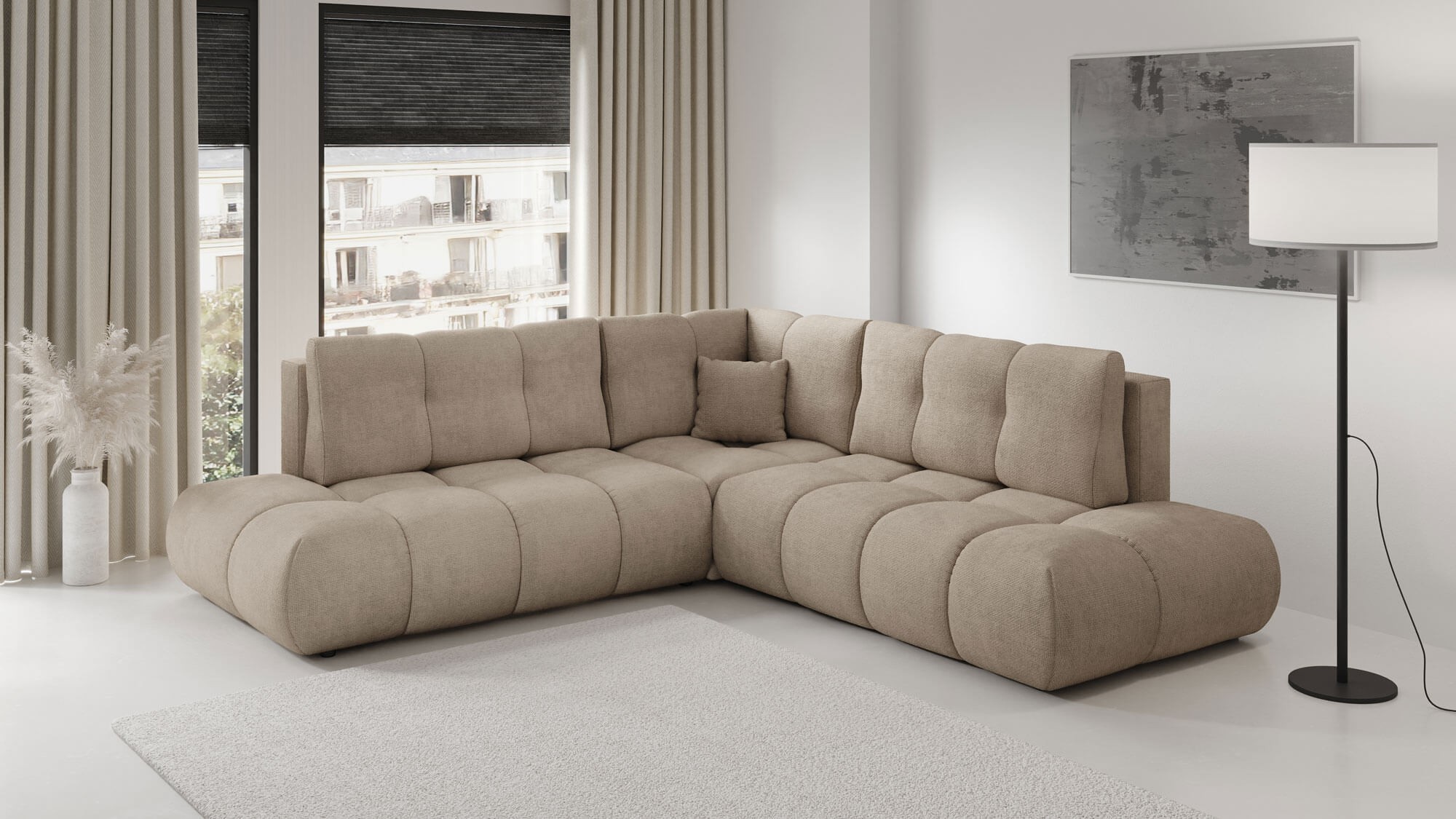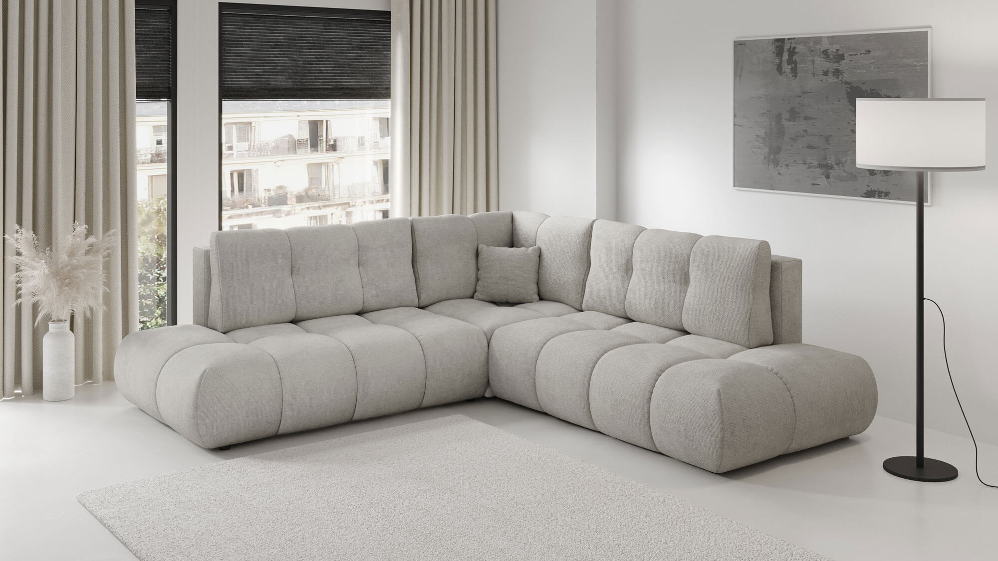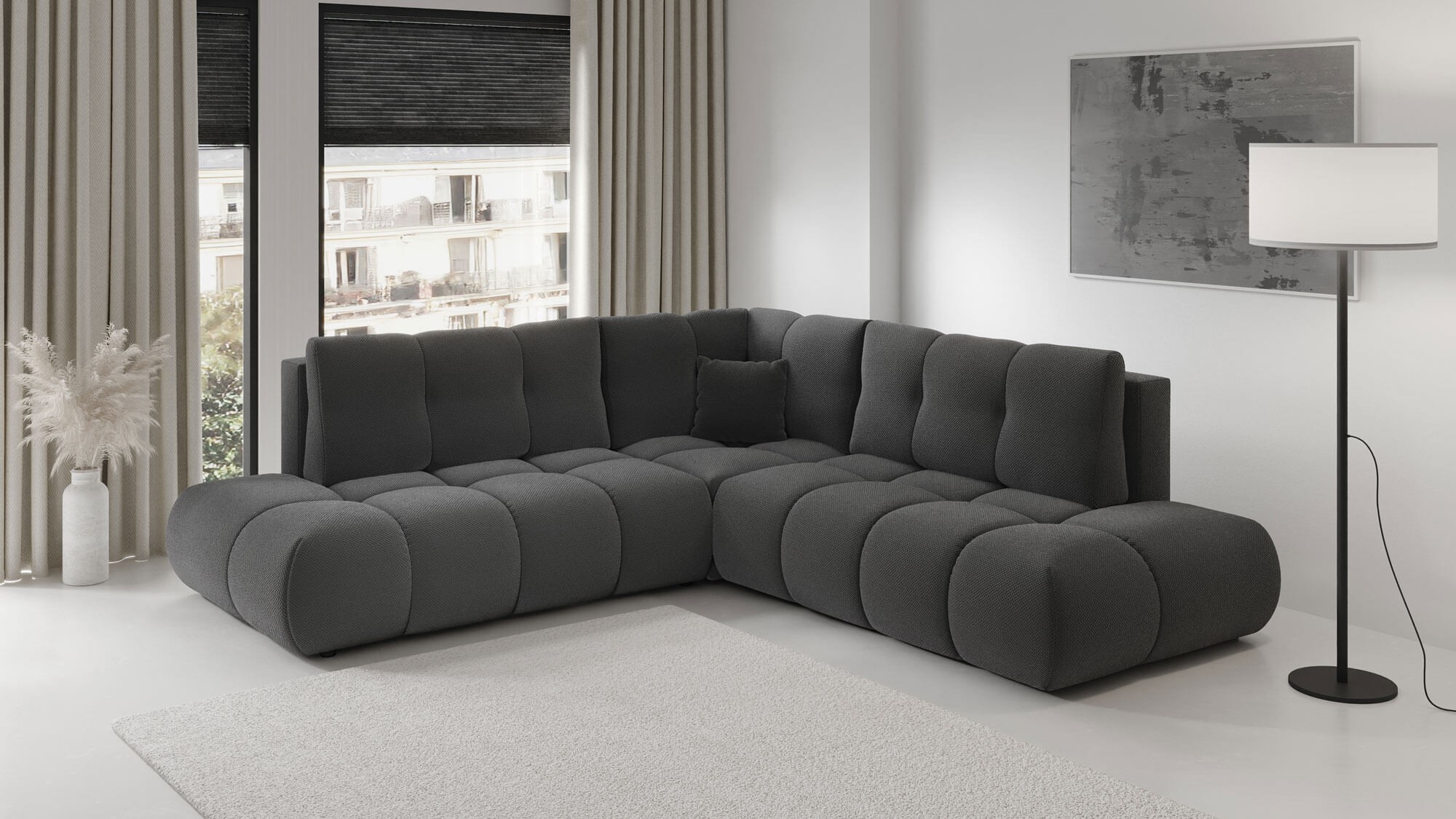 Narożnik rozkładany SOHO II to nowoczesny mebel, który od razu przyciąga uwagę swoim wyglądem. Miękkie, obłe kształty sprawiają, że salon staje się bardziej przytulny i elegancki. Charakterystyczne przeszycia dodają mu wyjątkowego stylu, a zarazem podkreślają solidność wykonania. Narożnik został zaprojektowany tak, aby był wygodny w codziennym użytkowaniu – miękkie poduchy i odpowiednio wyprofilowane siedzisko zapewniają komfortowy odpoczynek zarówno w dzień, jak i wieczorem. Dzięki funkcji rozkładania mebel w prosty sposób zmienia się w przestronne miejsce do spania, a pojemnik na pościel pomaga utrzymać porządek w salonie. Soho II to narożnik, który łączy w sobie funkcjonalność, nowoczesny design i wygodę na co dzień.
