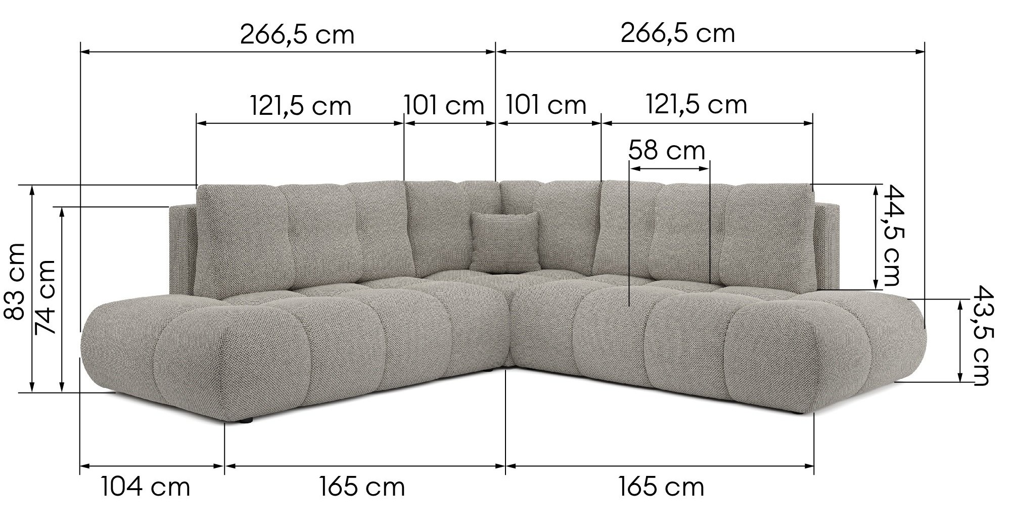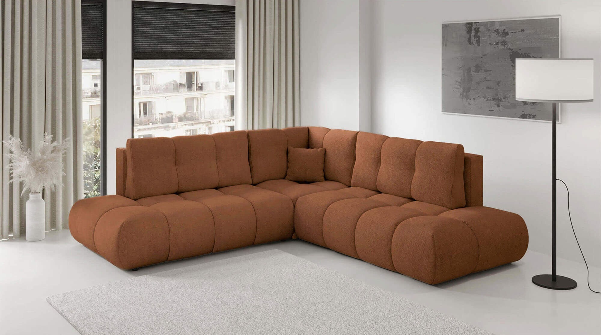 Narożnik rozkładany SOHO II to nowoczesny mebel, który od razu przyciąga uwagę swoim wyglądem. Miękkie, obłe kształty sprawiają, że salon staje się bardziej przytulny i elegancki. Charakterystyczne przeszycia dodają mu wyjątkowego stylu, a zarazem podkreślają solidność wykonania. Narożnik został zaprojektowany tak, aby był wygodny w codziennym użytkowaniu – miękkie poduchy i odpowiednio wyprofilowane siedzisko zapewniają komfortowy odpoczynek zarówno w dzień, jak i wieczorem. Dzięki funkcji rozkładania mebel w prosty sposób zmienia się w przestronne miejsce do spania, a pojemnik na pościel pomaga utrzymać porządek w salonie. Soho II to narożnik, który łączy w sobie funkcjonalność, nowoczesny design i wygodę na co dzień.
