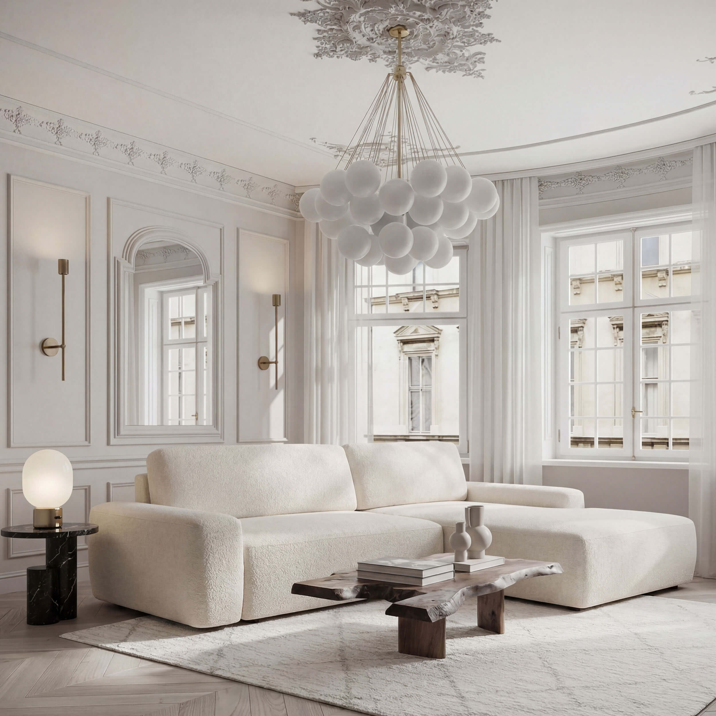 Nowoczesny narożnik w obłym kształcie BOULI prezentuje się nieziemsko – wyczaruje przytulny klimat w każdym miejscu, bowiem jego miękkość naprawdę zachęca do wypoczynku. Przytulny, zaokrąglony kształt dodaje uroku, a pokrycie aksamitną tkaniną zwiększa komfort. Siedzisko wypełnione jest pianką PUR i sprężyną falistą, co sprawia, że jest odporny na odkształcenia i wgniecenia. Możliwość rozłożenia siedziska pozwoli na szybką transformację narożnika w wygodne łóżko, a wbudowany schowek pomieści niezbędne pościele, koce czy poduszki. Rozkładanie ułatwia oczywiście zamontowany system smart, a o stabilność dba konstrukcja z drewna i płyt wiórowych.