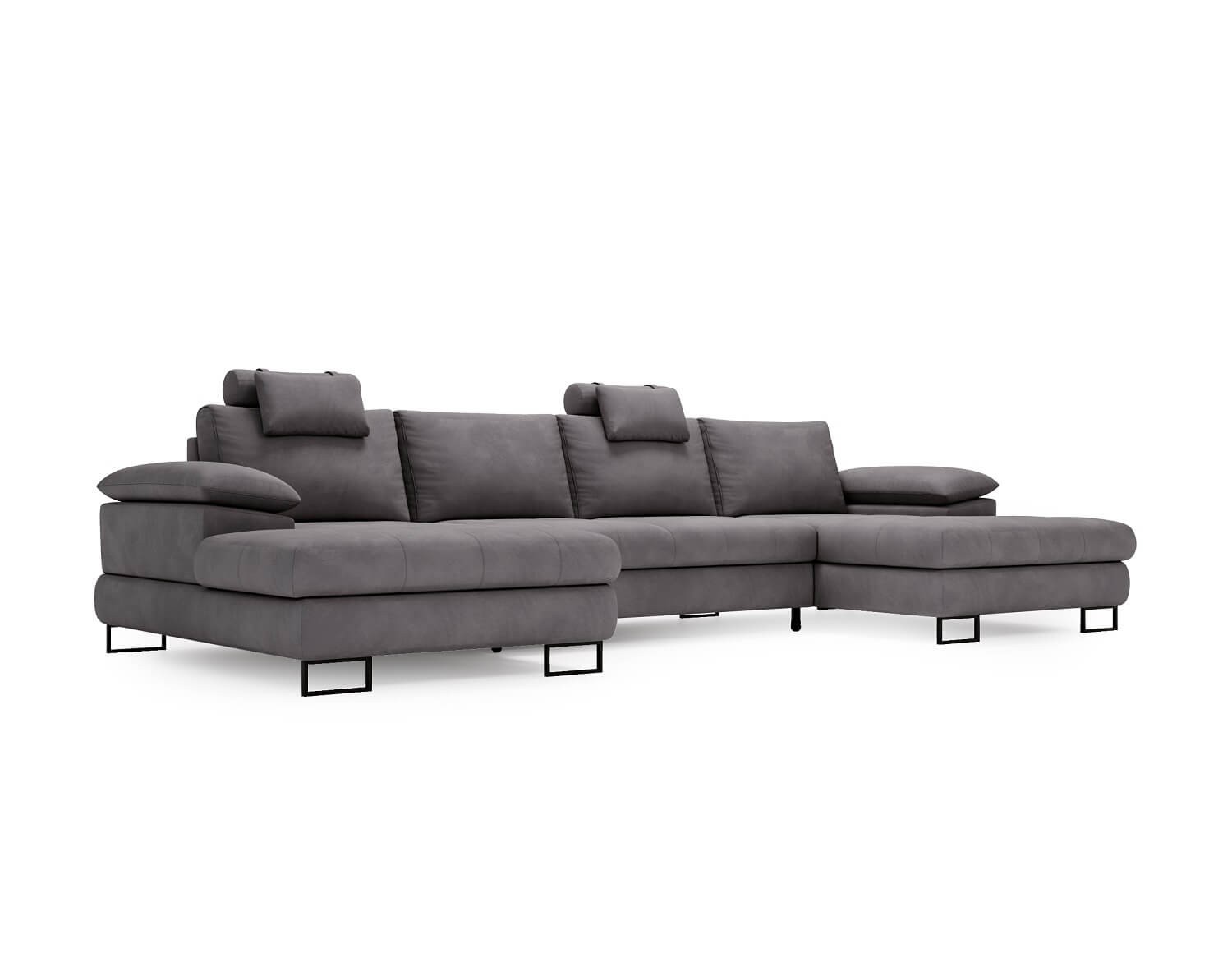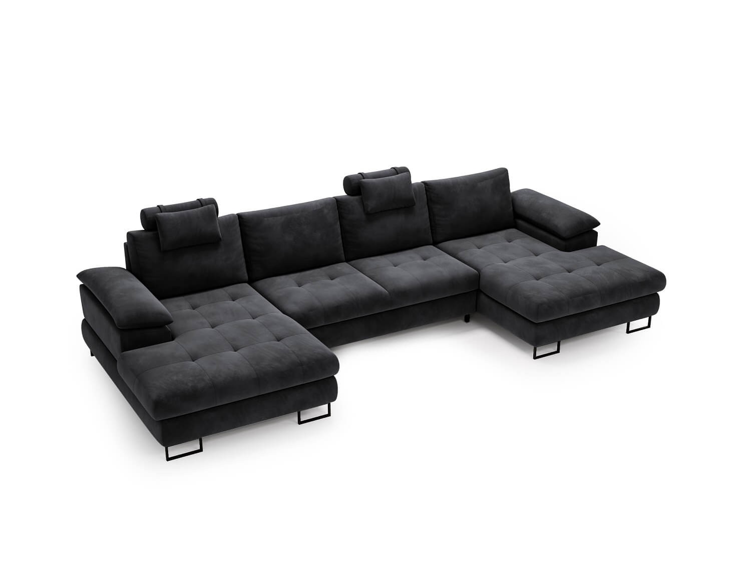 Duży narożnik w kształcie litery U to wygoda dla całej rodziny! Mimo sporych rozmiarów, chromowane i czarne nogi sprawiają, że prezentuje się lekko i zgrabnie, a tym samym nadają mu oryginalny charakter - nowoczesny loft to najbardziej popularny i ponadczasowy wystrój. Połączenie aksamitnej tkaniny z wysoką funkcjonalnością w postaci praktycznej funkcji spania i dwóch pojemników na pościel sprawia, że narożnik jest piękny, stylowy, ale i wspiera zachowanie porządku. W pojemnikach przechowamy zestawy pościeli, poduszki i inne drobiazgi, a rozkładane siedzisko będzie idealne do przenocowania gości czy popołudniowej drzemki.