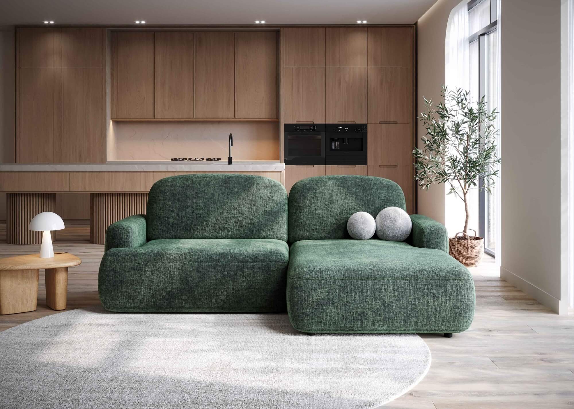 Obły narożnik z funkcją spania i pojemnikiem ALIVAR – przytulny i harmonijny styl