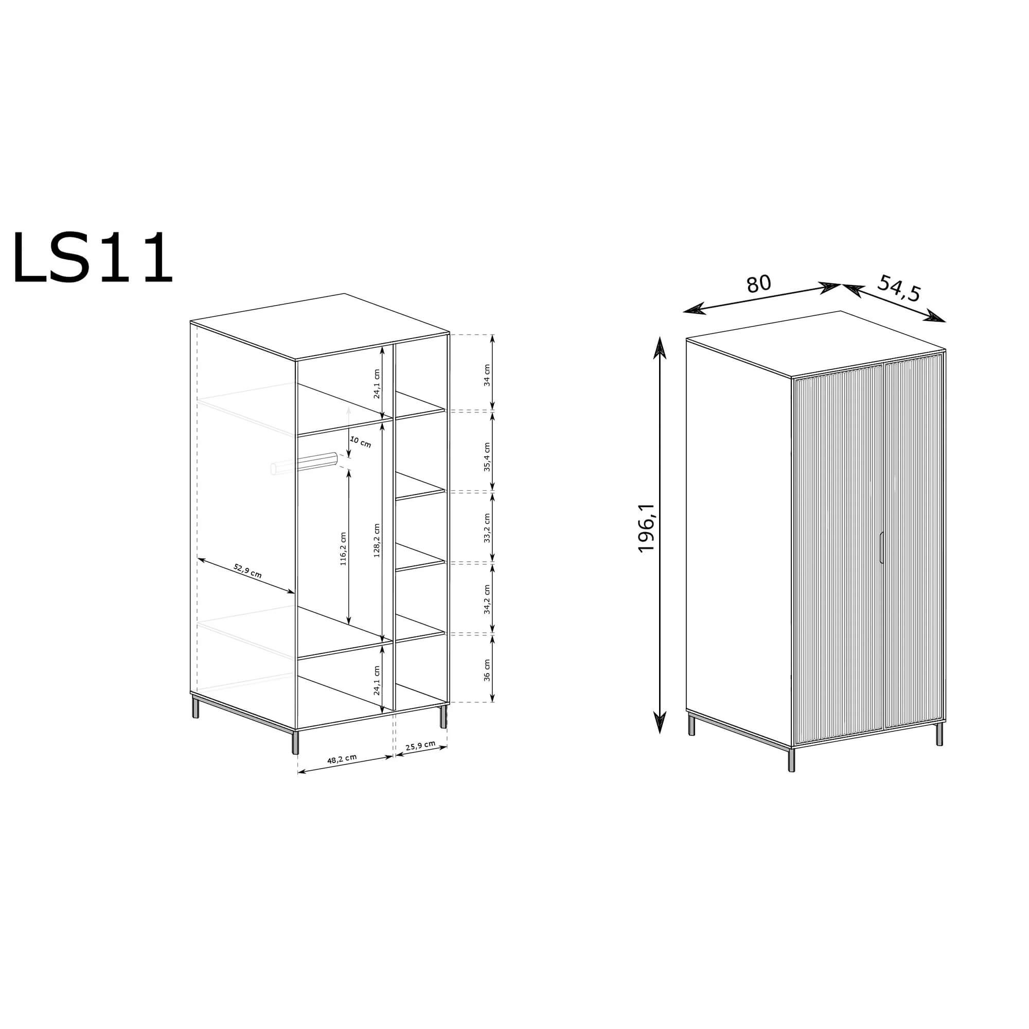 Wnętrze szafy LS-11 zostało zaprojektowane z myślą o maksymalnym wykorzystaniu przestrzeni. Znajdziesz tu zarówno pojemne półki na poskładaną odzież lub tekstylia, jak i solidny drążek, idealny do wieszania płaszczy, koszul czy sukienek. O komfort codziennego użytkowania dbają metalowe zawiasy z systemem cichego domyku, dzięki którym fronty zamykają się delikatnie i bezszelestnie.