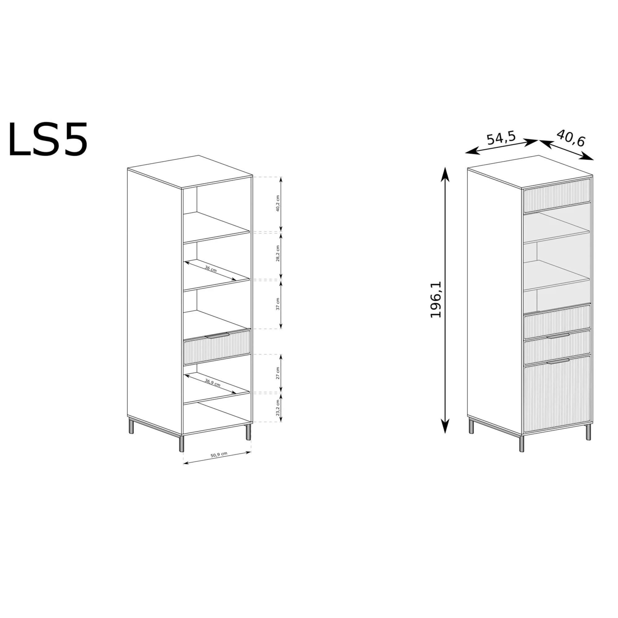 Witryna LS-5 została zaprojektowana z myślą o maksymalnej praktyczności. Górna, przeszklona część z dwiema półkami to idealne miejsce do wyeksponowania dekoracji, szkła lub ulubionych książek. Poniżej znajduje się pojemna szuflada na drobiazgi, a dolną część stanowi zamknięta szafka z półką, oferująca mnóstwo miejsca do przechowywania.
