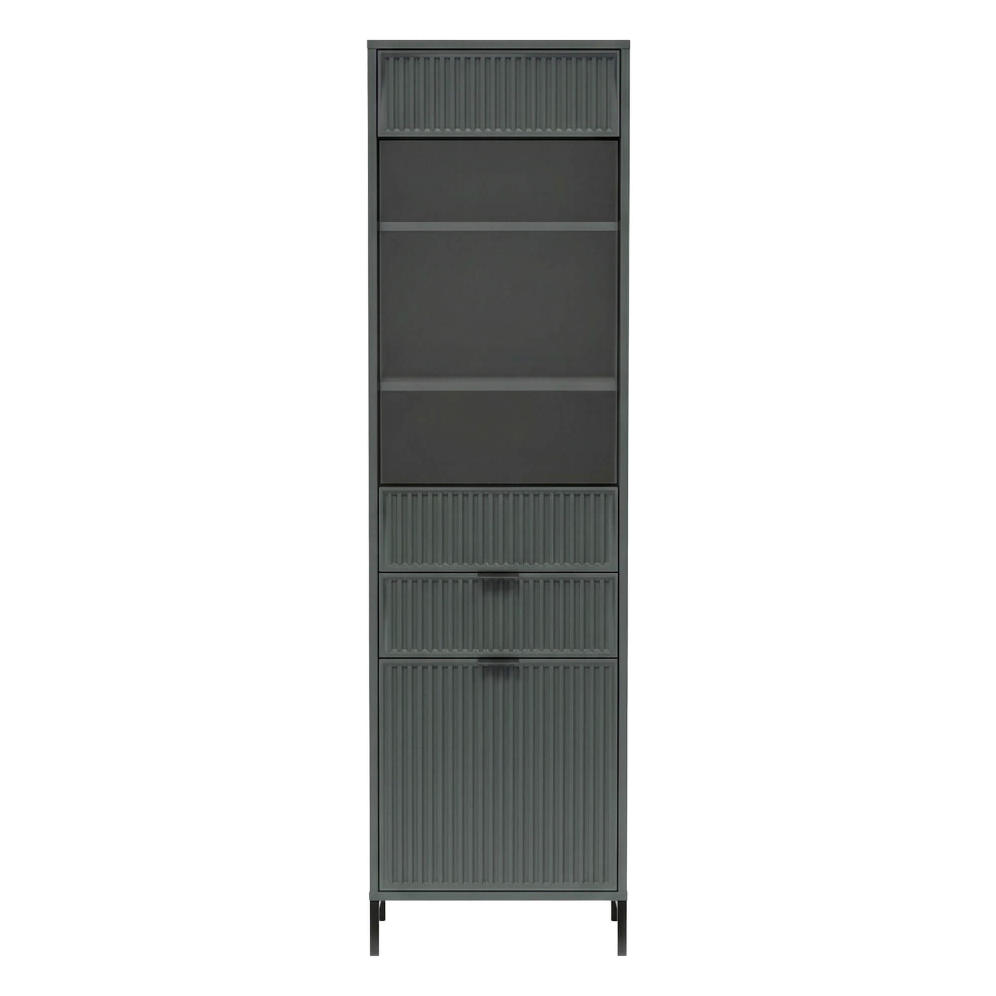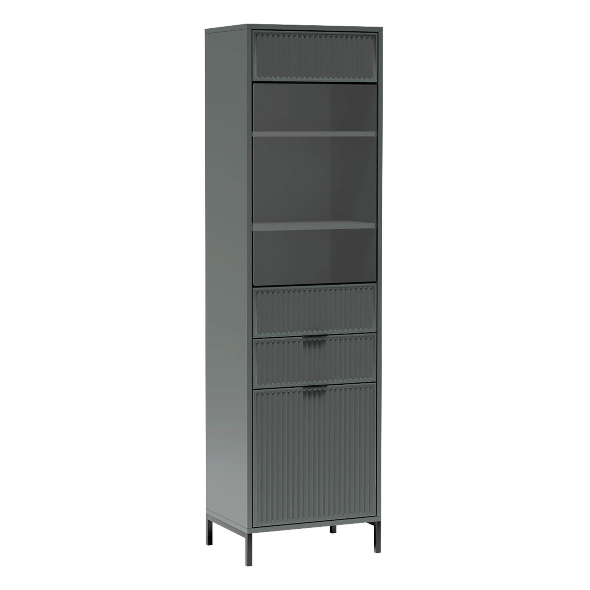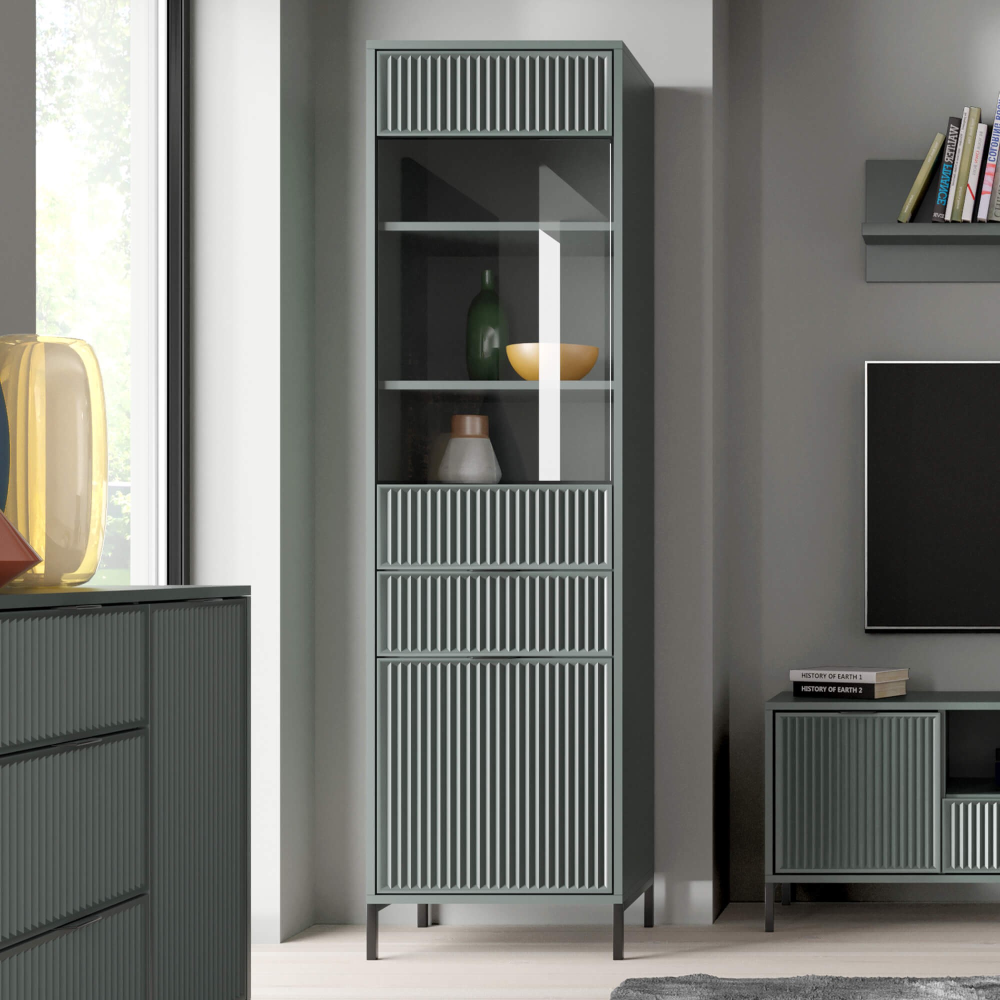 Nowoczesna witryna LS-5 to mebel, który zachwyca swoim unikalnym wykończeniem i bez trudu stanie się ozdobą każdego salonu. Unikalny kolor Green Stone nadaje jej niepowtarzalny charakter, łącząc elegancję z nowoczesnym, industrialnym sznytem. Smukłe, metalowe nogi w kolorze czarnym dodają konstrukcji lekkości, jednocześnie zapewniając stabilność i ułatwiając utrzymanie czystości pod meblem.