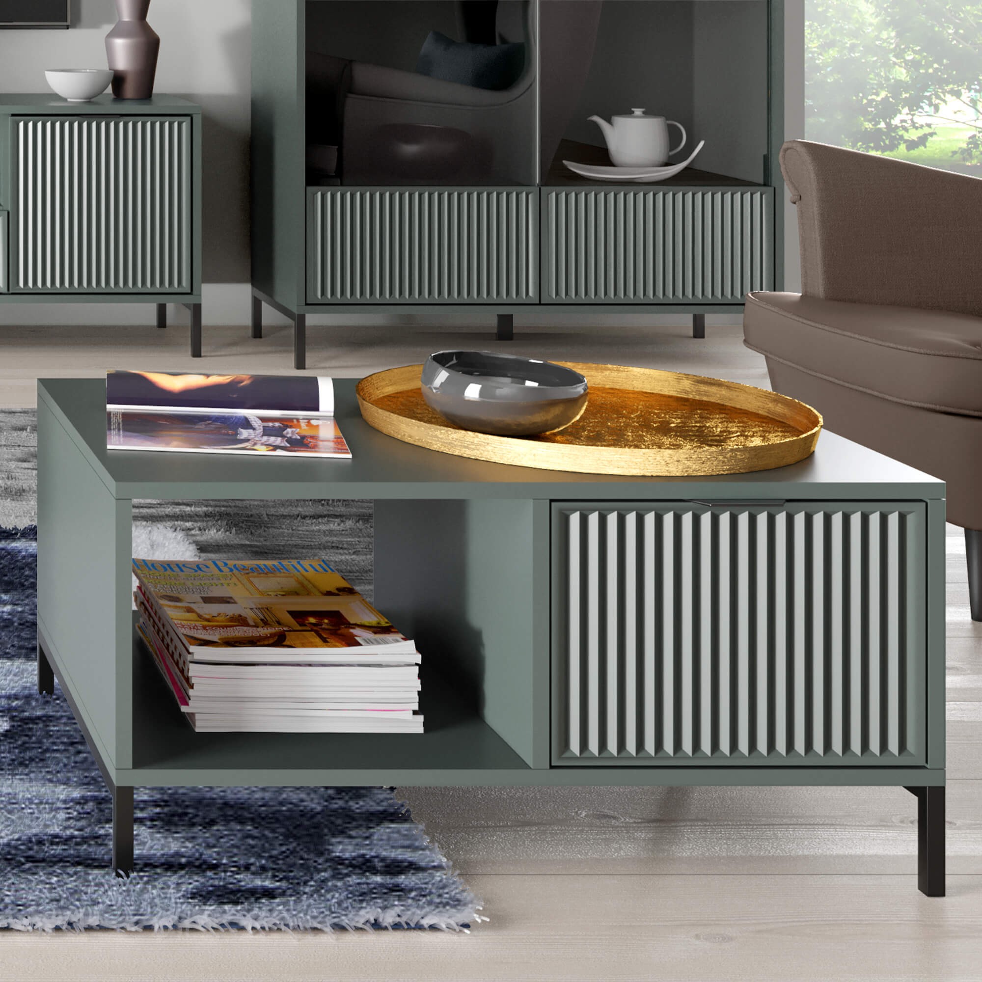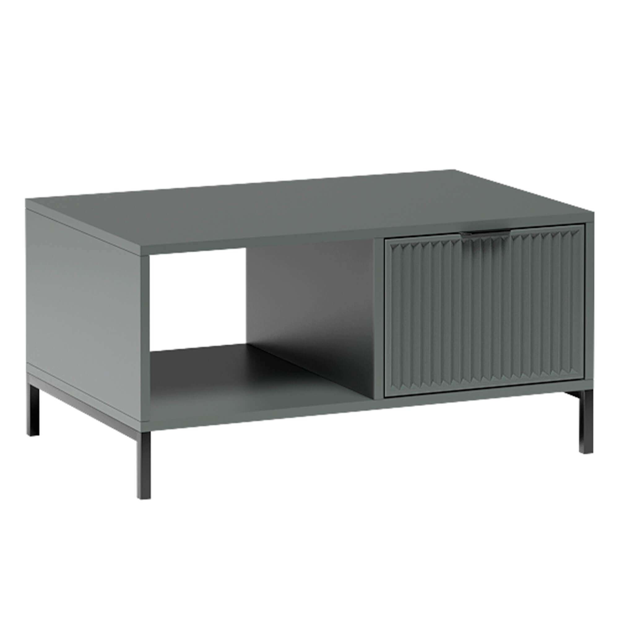 Stolik kawowy LS-6 to idealna propozycja dla miłośników nowoczesnych i niebanalnych wnętrz. Wyróżnia go unikalna kolorystyka Green Stone, która wprowadza do pomieszczenia powiew świeżości i elegancji, świetnie komponując się z najnowszymi trendami wnętrzarskimi. Głęboki, stonowany odcień zieleni w połączeniu z matową czernią metalowych nóg tworzy mebel o silnym charakterze.