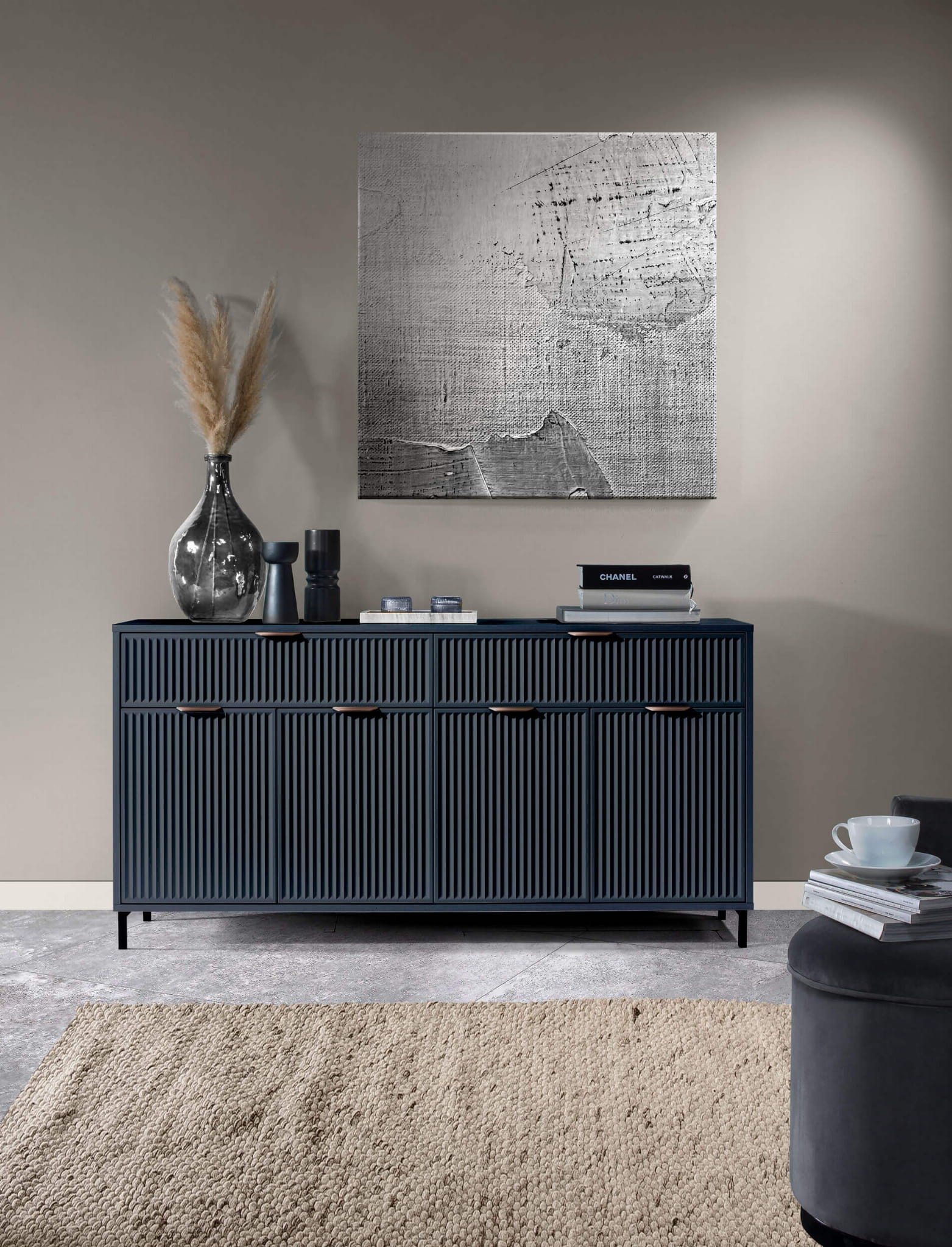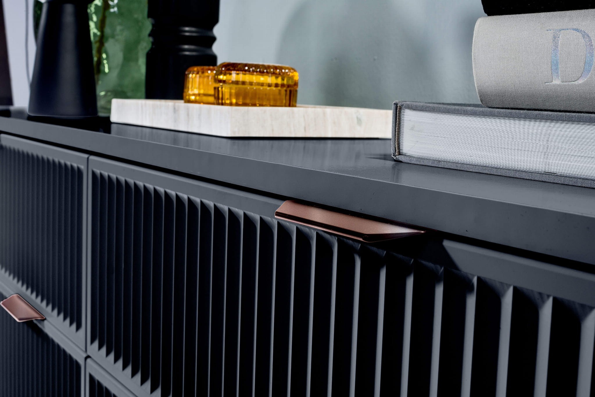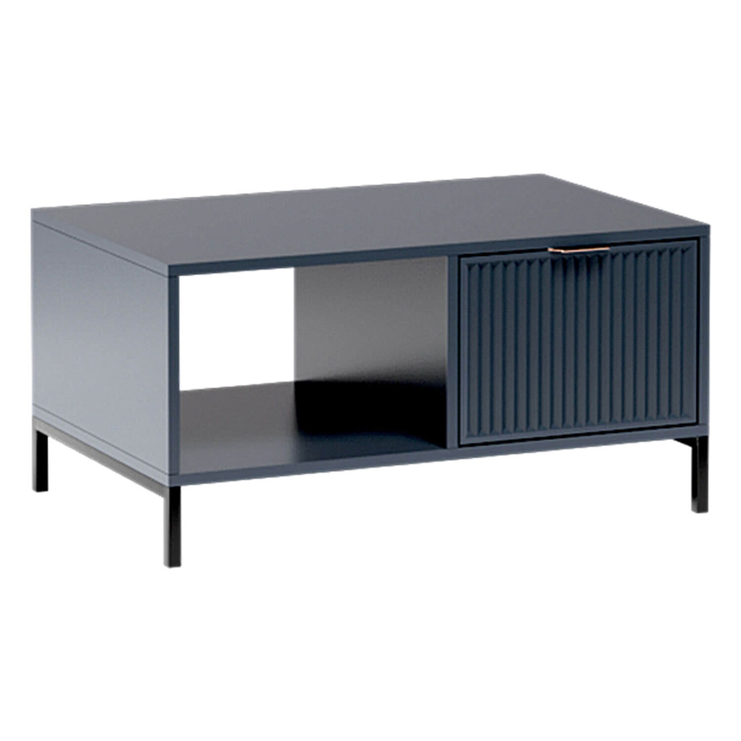Niezwykle praktyczny stolik kawowy z szufladą z miedzianym uchwytem – niezbędnik każdego salonu! Mebel doskonale sprawdzi się obok sofy czy narożnika tworząc miejsce na ustawienie przekąsek i napojów czy po prostu ciekawych dekoracji: świeżych kwiatów, świec, figurek. Choć mebel ma prostą i klasyczną formę, która pasuje do każdego stylu, to jednak ciekawy ryflowany front sprawia, że stolik jest naprawdę unikatowy. Odważny odcień indigo dodaje klasy i ciekawie kontrastuje z miedzianym uchwytem. Z całą pewnością stworzy efekt wow w każdym wnętrzu! Ponadto wysokie czarne nóżki dodają elegancji i lekkości. Zdecydowanie łatwiej posprzątać czy odkurzyć pod takim meblem, a zwłaszcza po odwiedzinach gości.