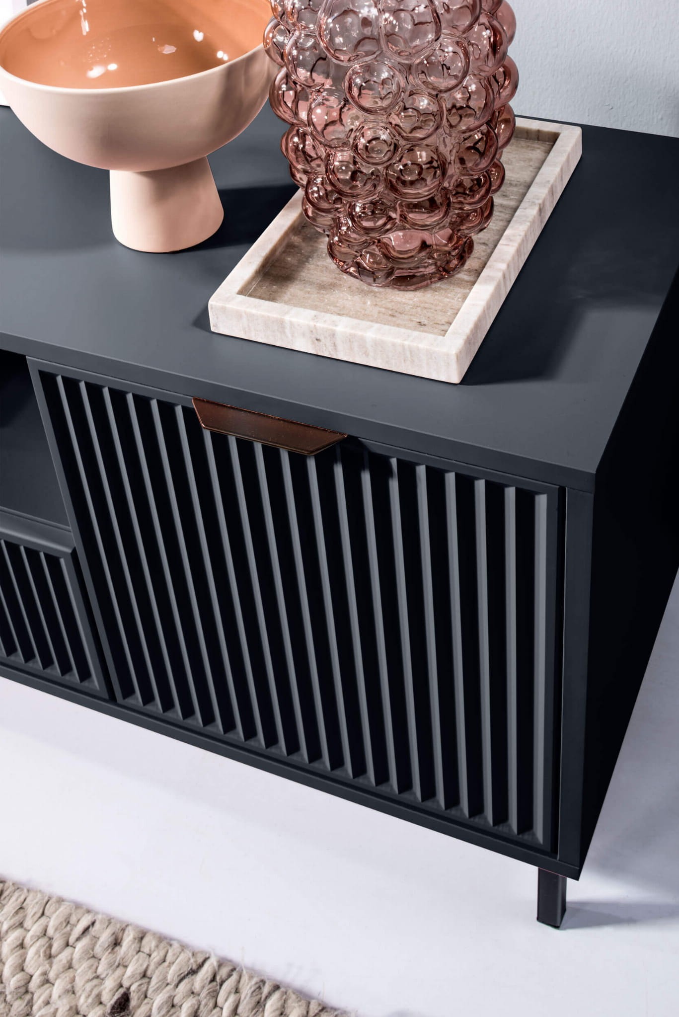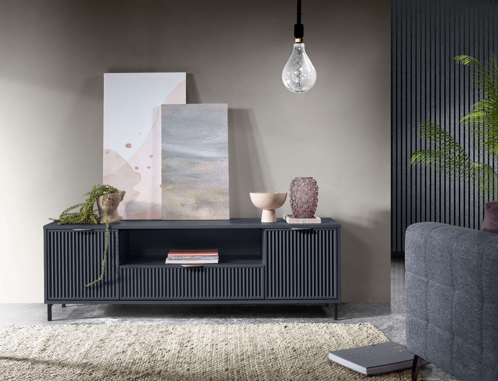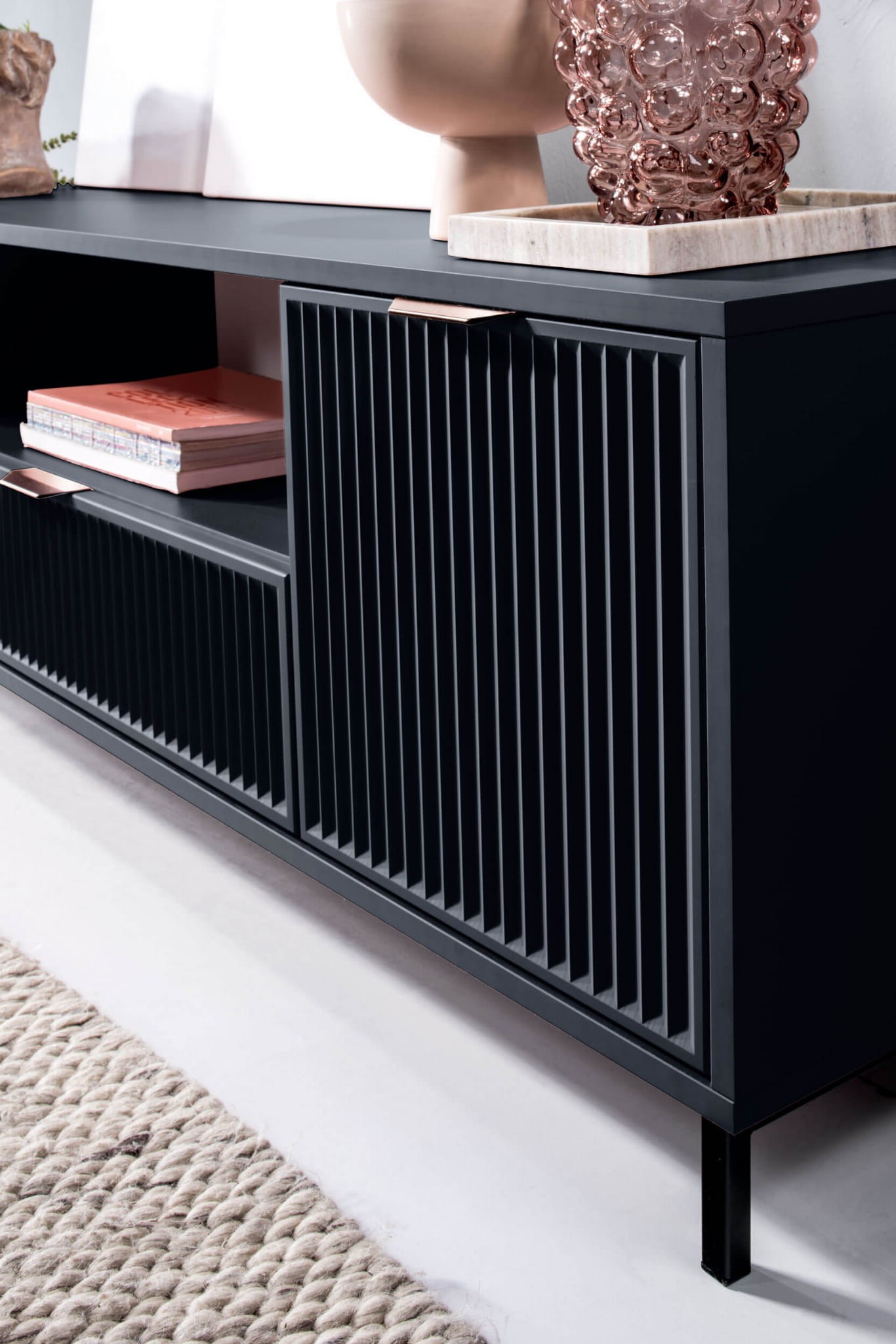 Niezwykle praktyczny stolik kawowy z szufladą z miedzianym uchwytem – niezbędnik każdego salonu! Mebel doskonale sprawdzi się obok sofy czy narożnika tworząc miejsce na ustawienie przekąsek i napojów czy po prostu ciekawych dekoracji: świeżych kwiatów, świec, figurek. Choć mebel ma prostą i klasyczną formę, która pasuje do każdego stylu, to jednak ciekawy ryflowany front sprawia, że stolik jest naprawdę unikatowy. Odważny odcień indigo dodaje klasy i ciekawie kontrastuje z miedzianym uchwytem. Z całą pewnością stworzy efekt wow w każdym wnętrzu! Ponadto wysokie czarne nóżki dodają elegancji i lekkości. Zdecydowanie łatwiej posprzątać czy odkurzyć pod takim meblem, a zwłaszcza po odwiedzinach gości.