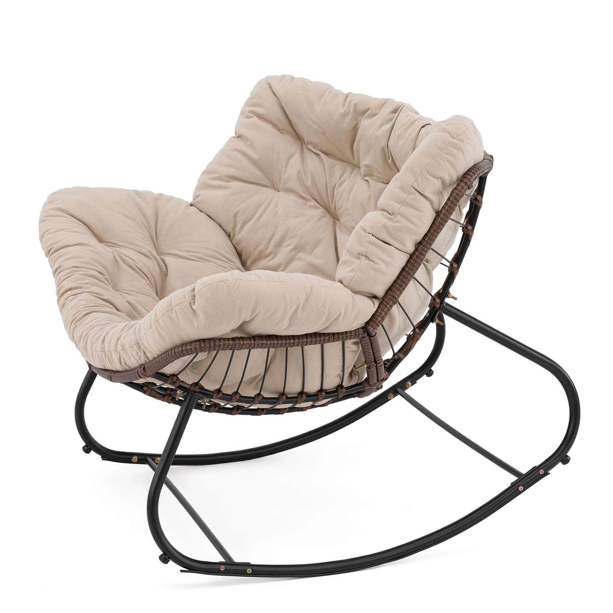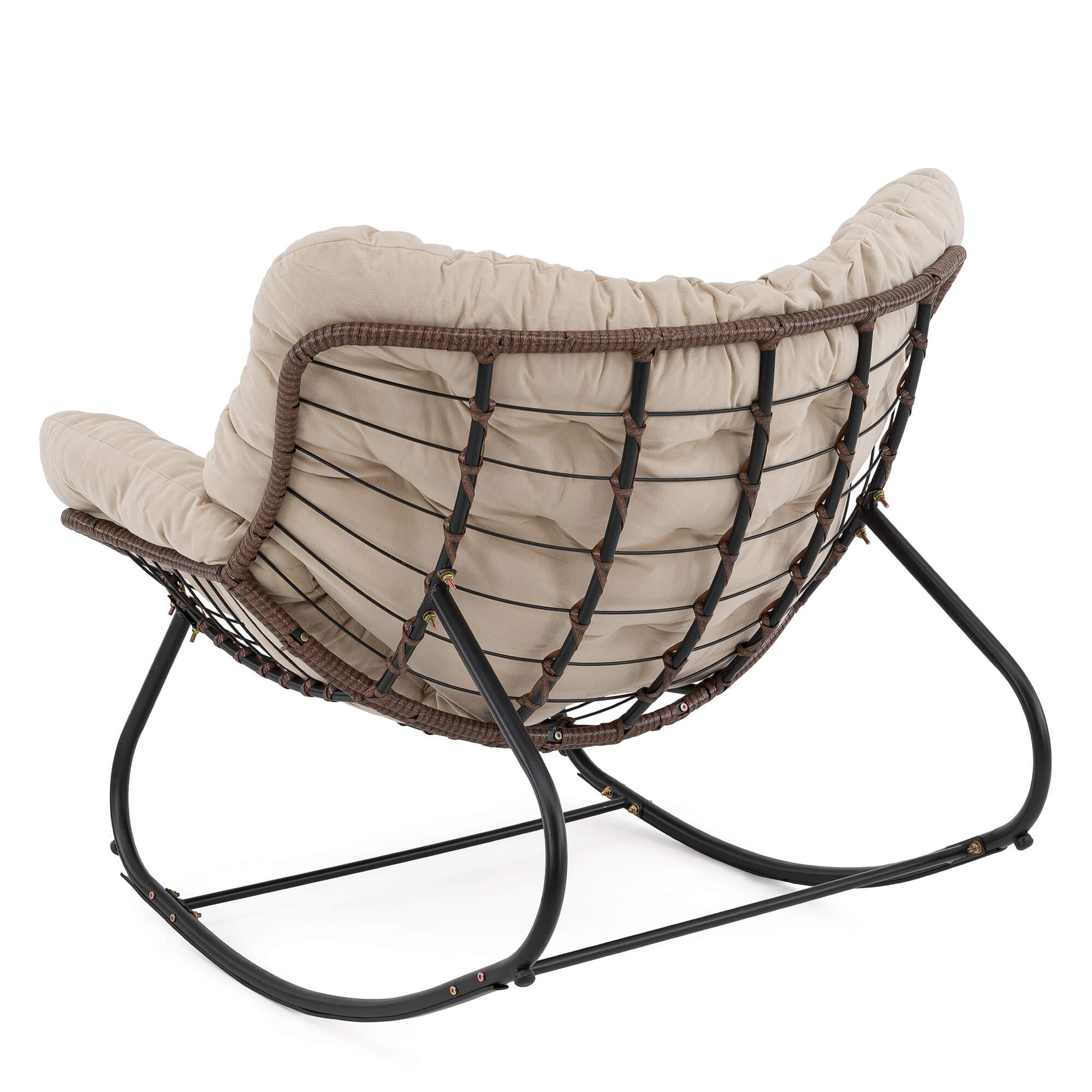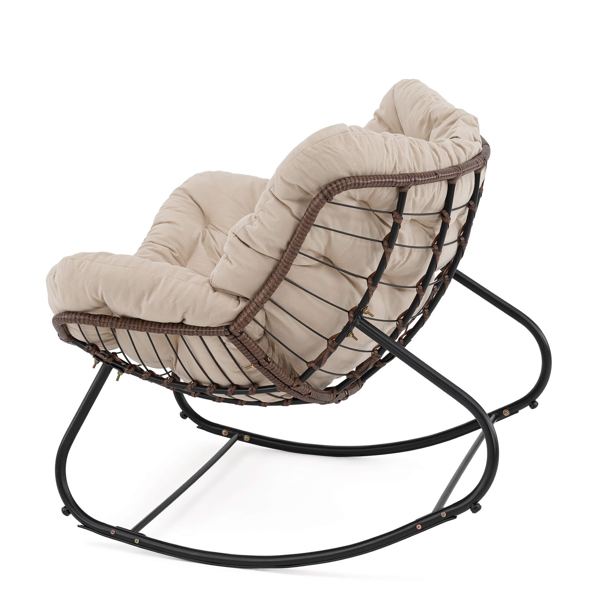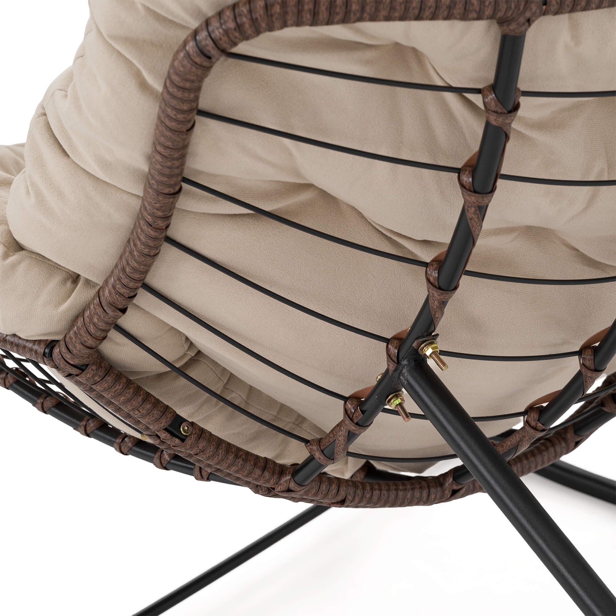 Ogrodowy fotel bujany technorattan BRĄZ poduszki beżowe