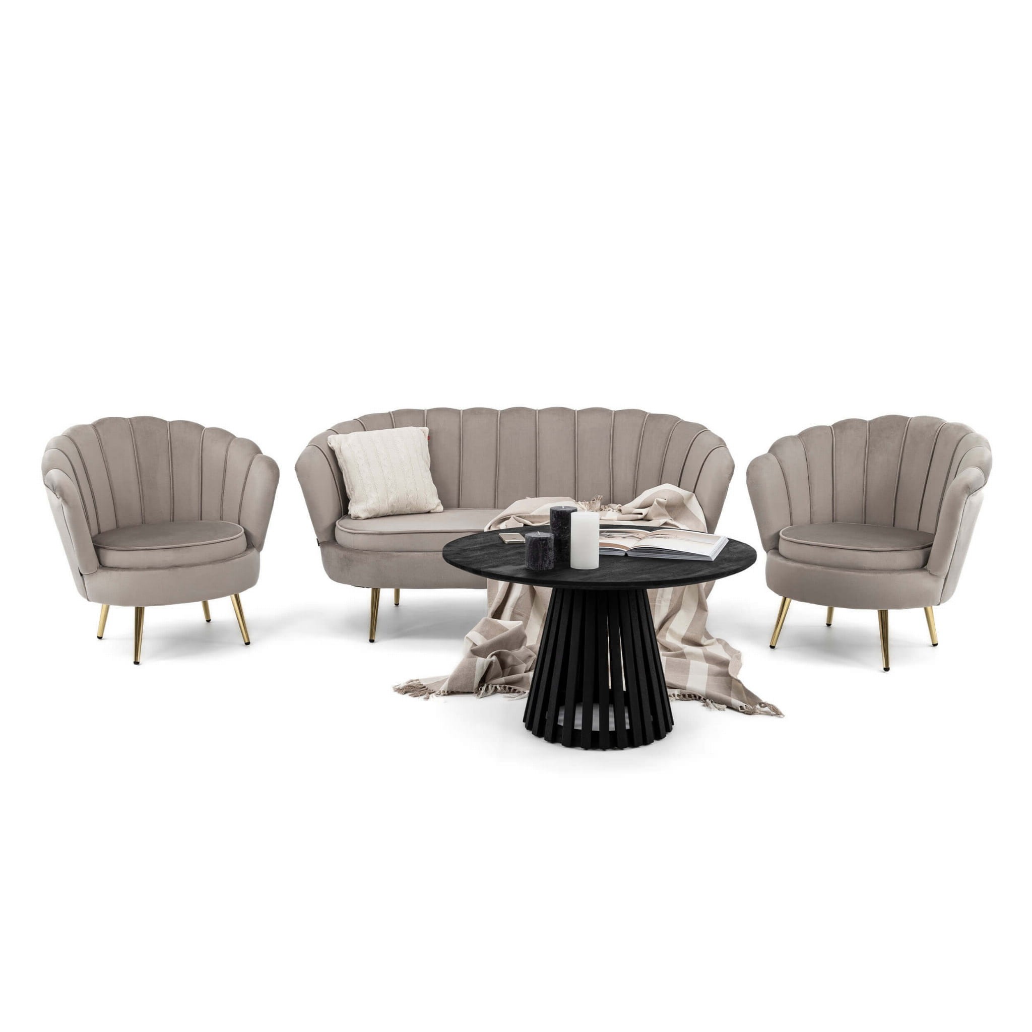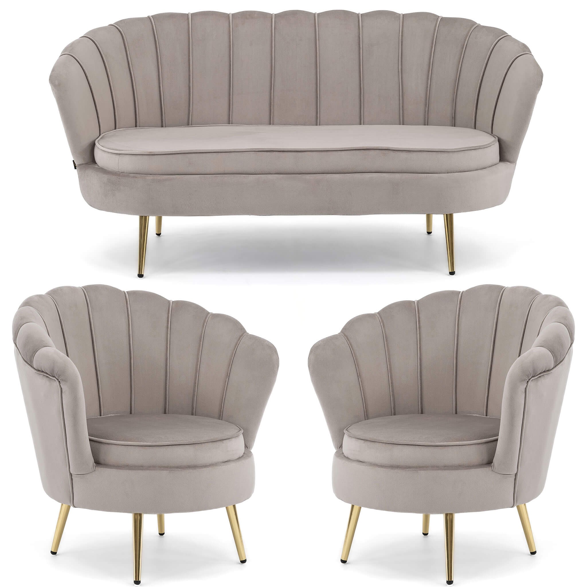 Zestaw wypoczynkowy Glamour: sofa i 2 fotele muszelki ciemnobeżowe, welurowe, ze złotymi nogami