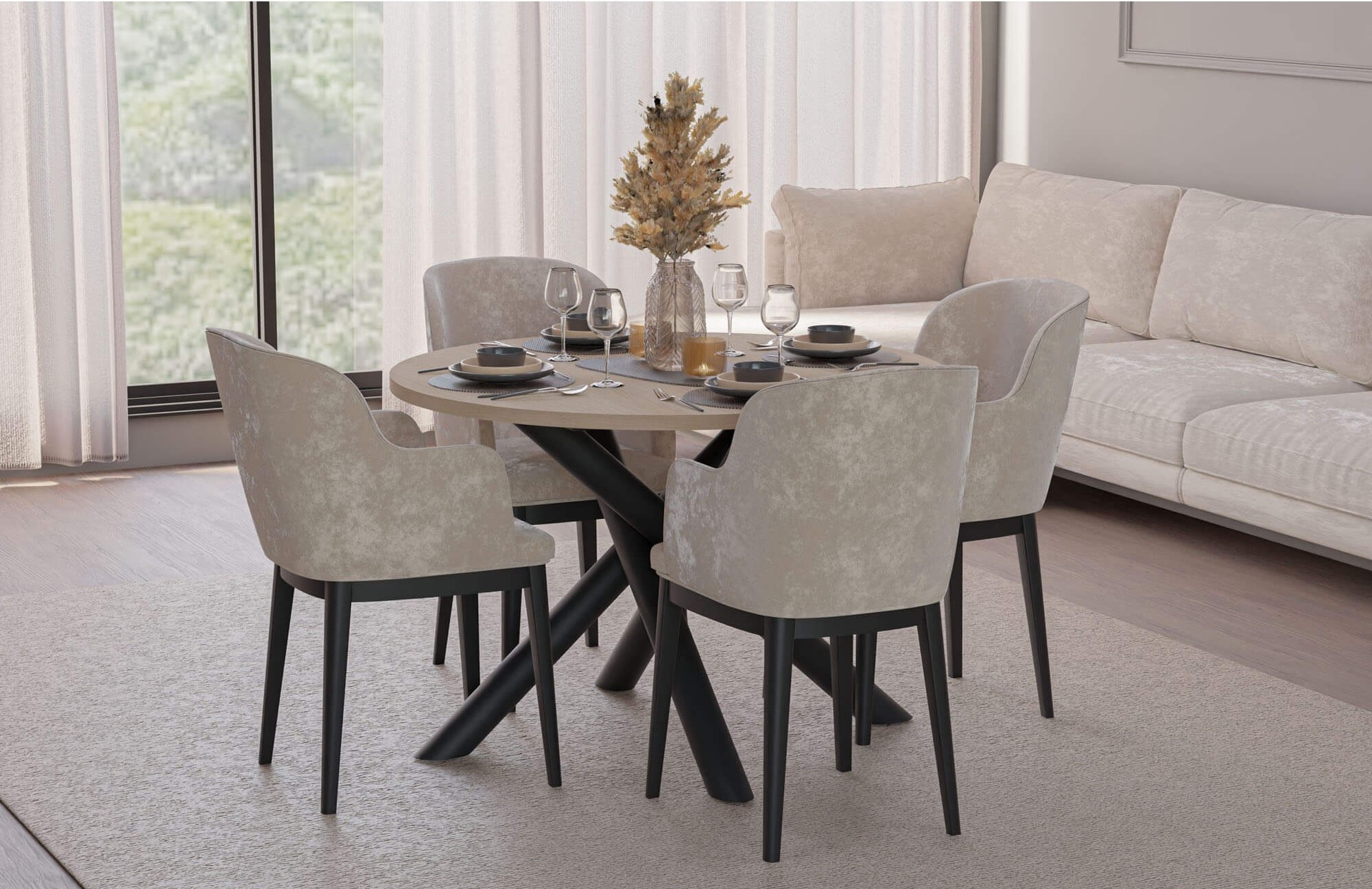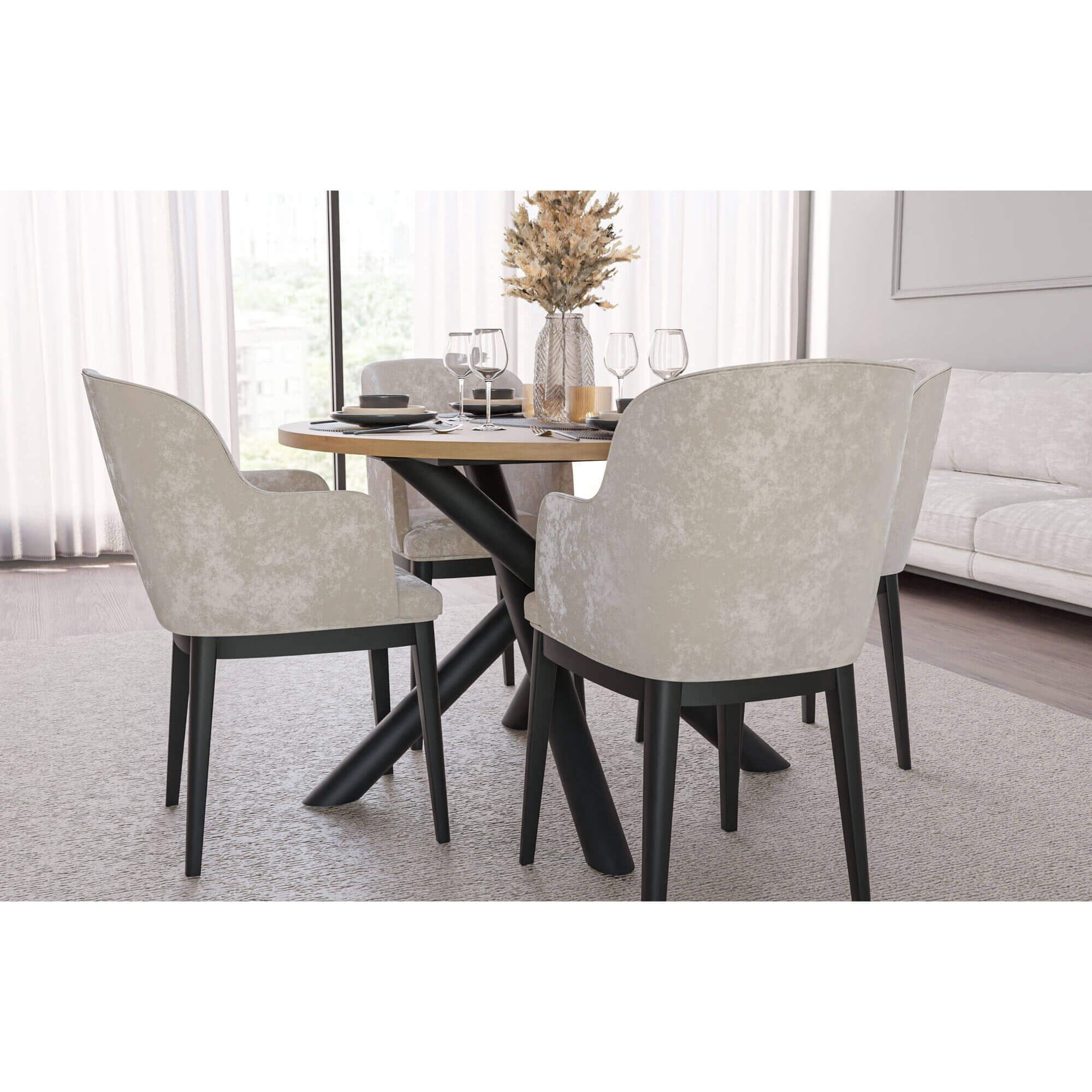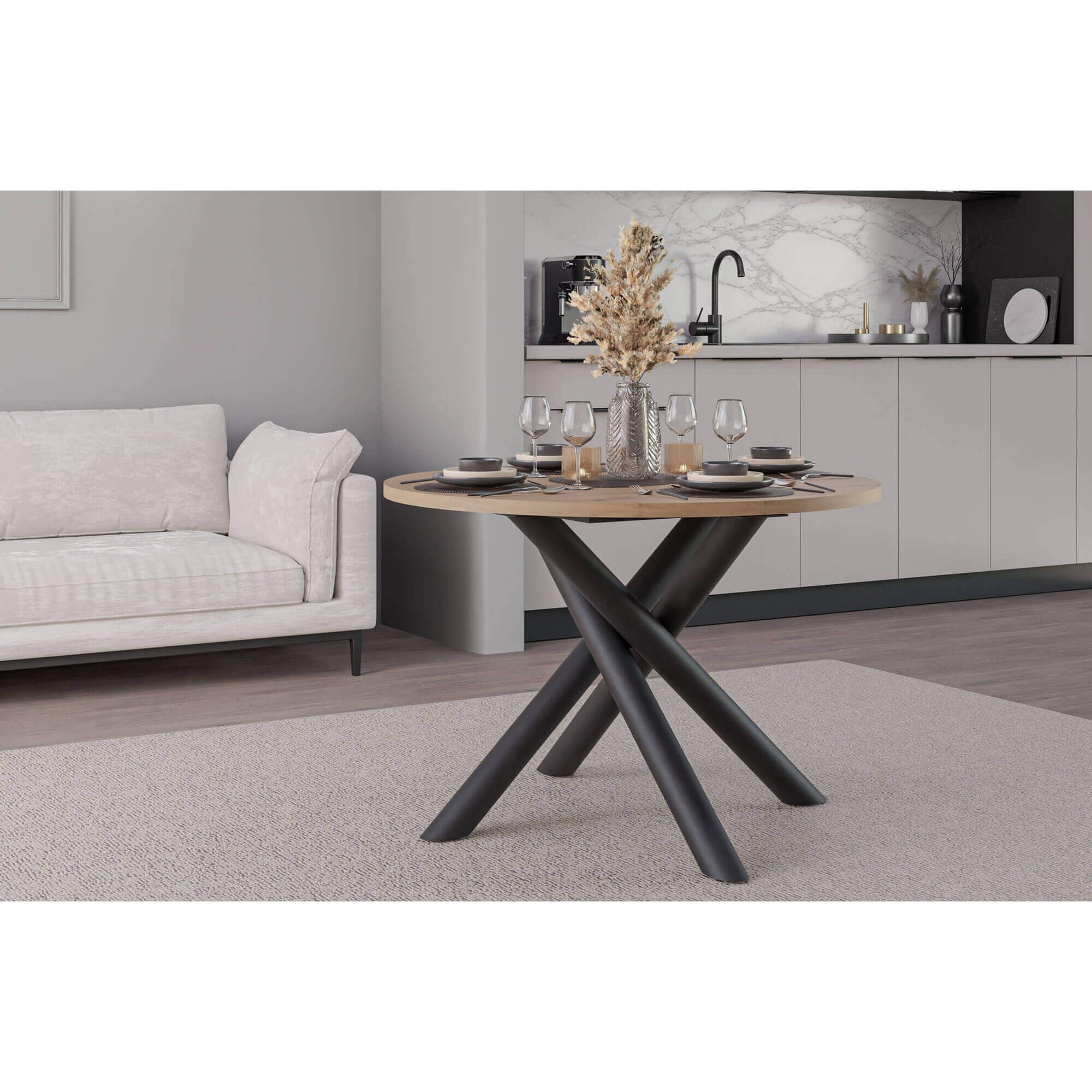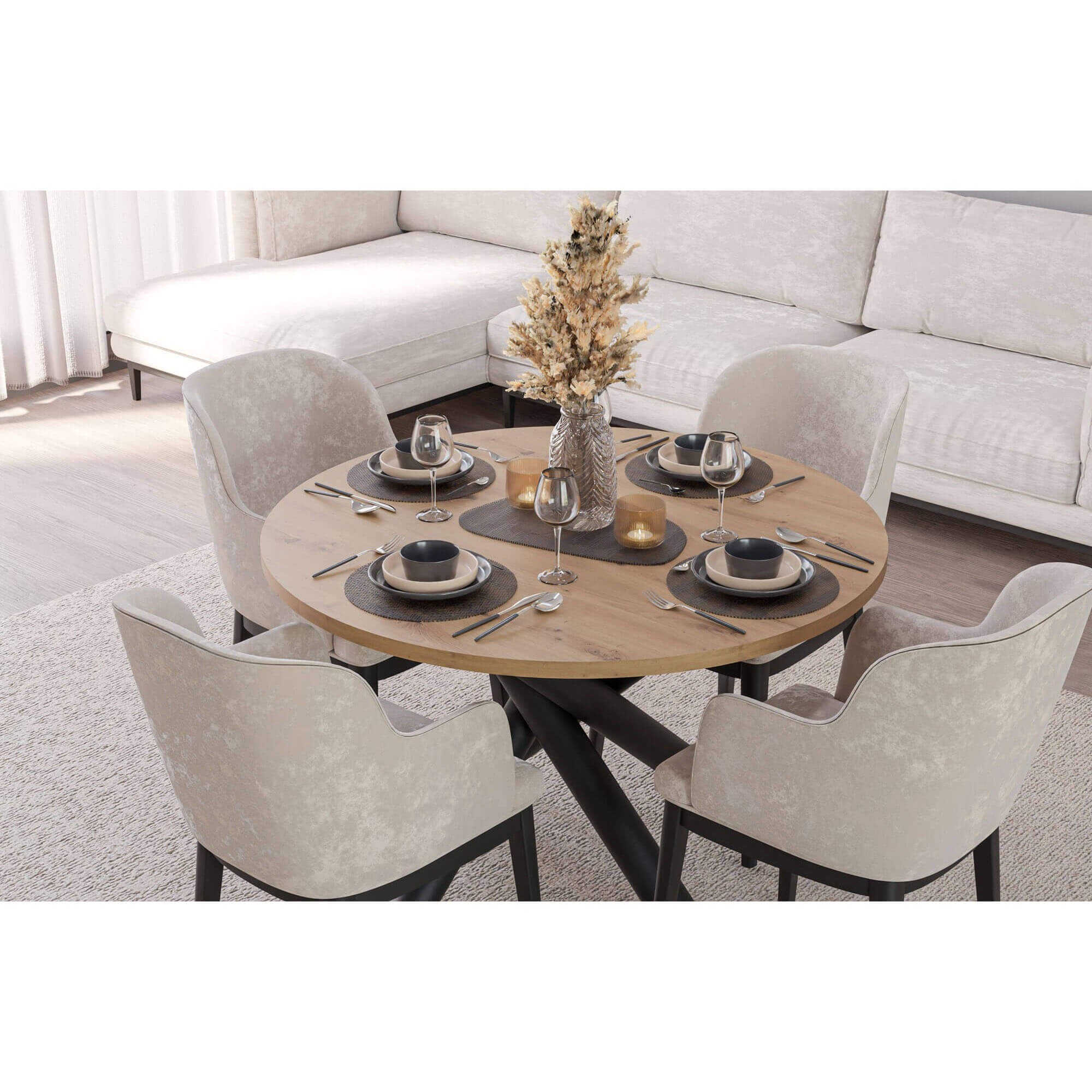 Stół OSLO to nowoczesny mebel, który świetnie sprawdzi się w jadalni lub salonie, stając się centralnym punktem spotkań w gronie rodziny i znajomych. Jego prosty, a jednocześnie efektowny design sprawia, że pasuje do różnych aranżacji – od minimalistycznych, przez skandynawskie, aż po loftowe. Okrągły blat zapewnia wygodę podczas wspólnych posiłków, a solidna podstawa w formie skrzyżowanych nóg nadaje całości oryginalny charakter i zapewnia stabilność. Dostępność różnych wariantów kolorystycznych pozwala dopasować stół OSLO do indywidualnych preferencji i wystroju wnętrza. To mebel, który łączy estetykę z funkcjonalnością, tworząc przyjazną przestrzeń do codziennego użytku.