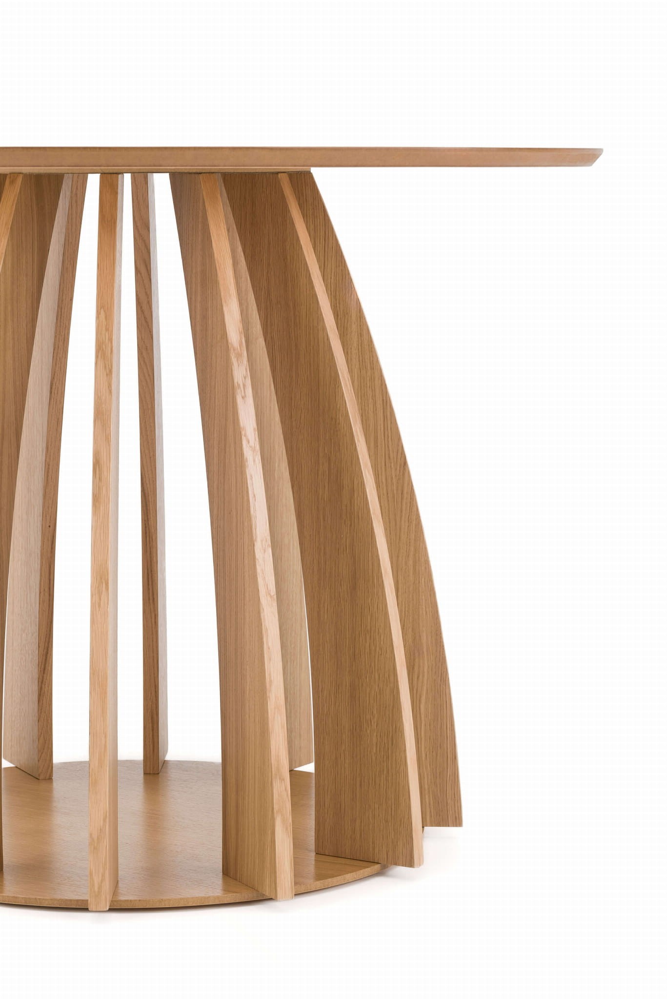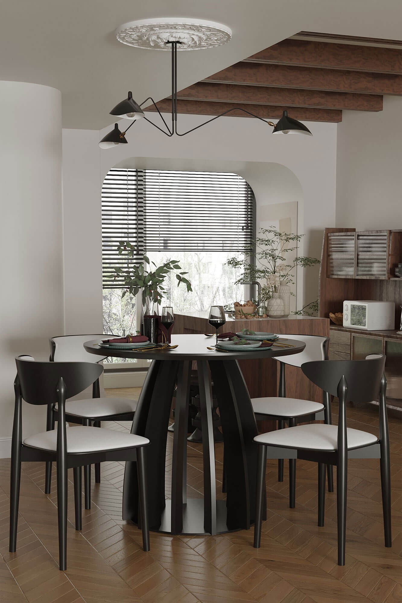 • Okrągły Blat: Stół posiada okrągły blat, który jest idealny do mniejszych przestrzeni, pozwalając na efektywne wykorzystanie miejsca. Okrągły kształt blatu sprzyja łatwej komunikacji i interakcji między osobami siedzącymi przy stole.