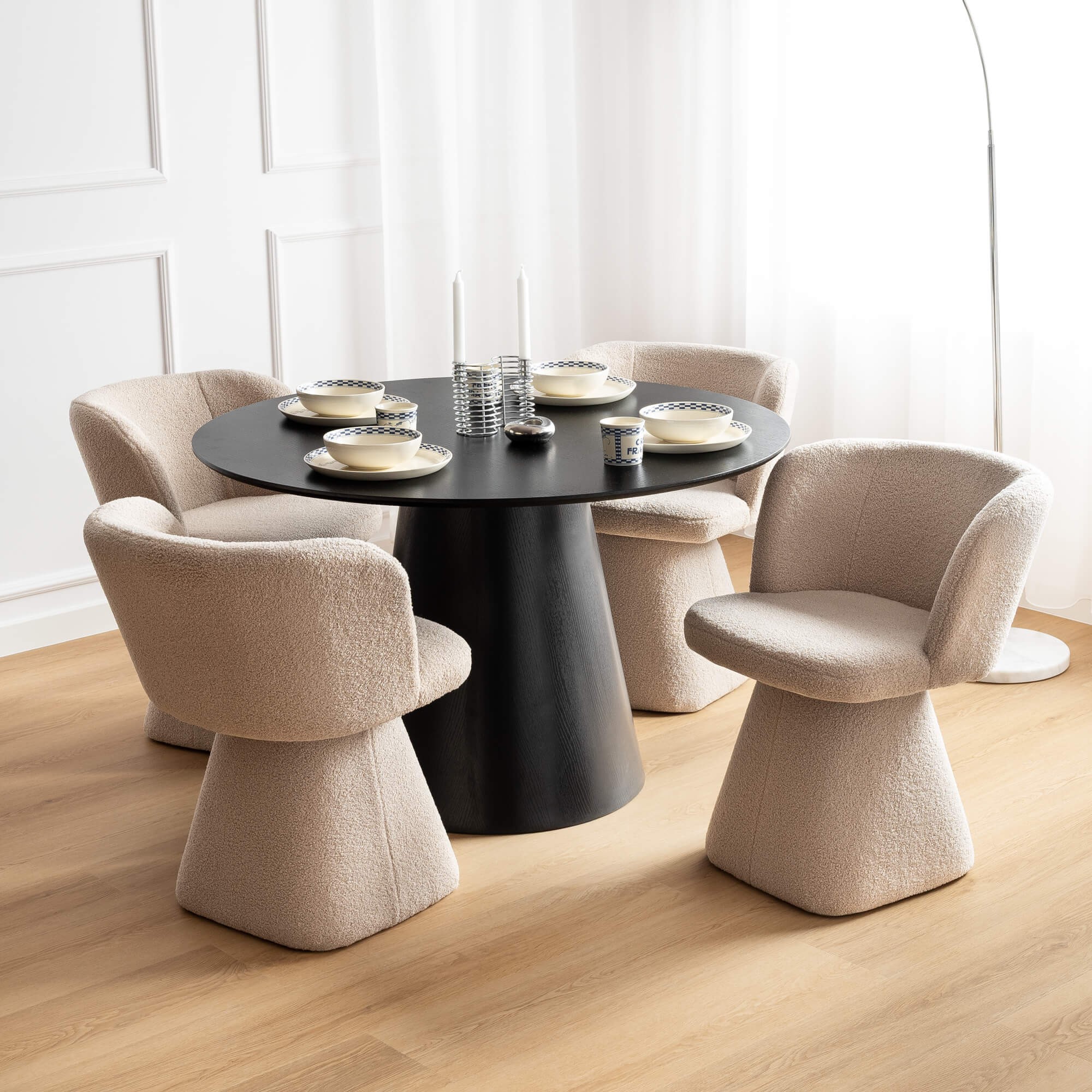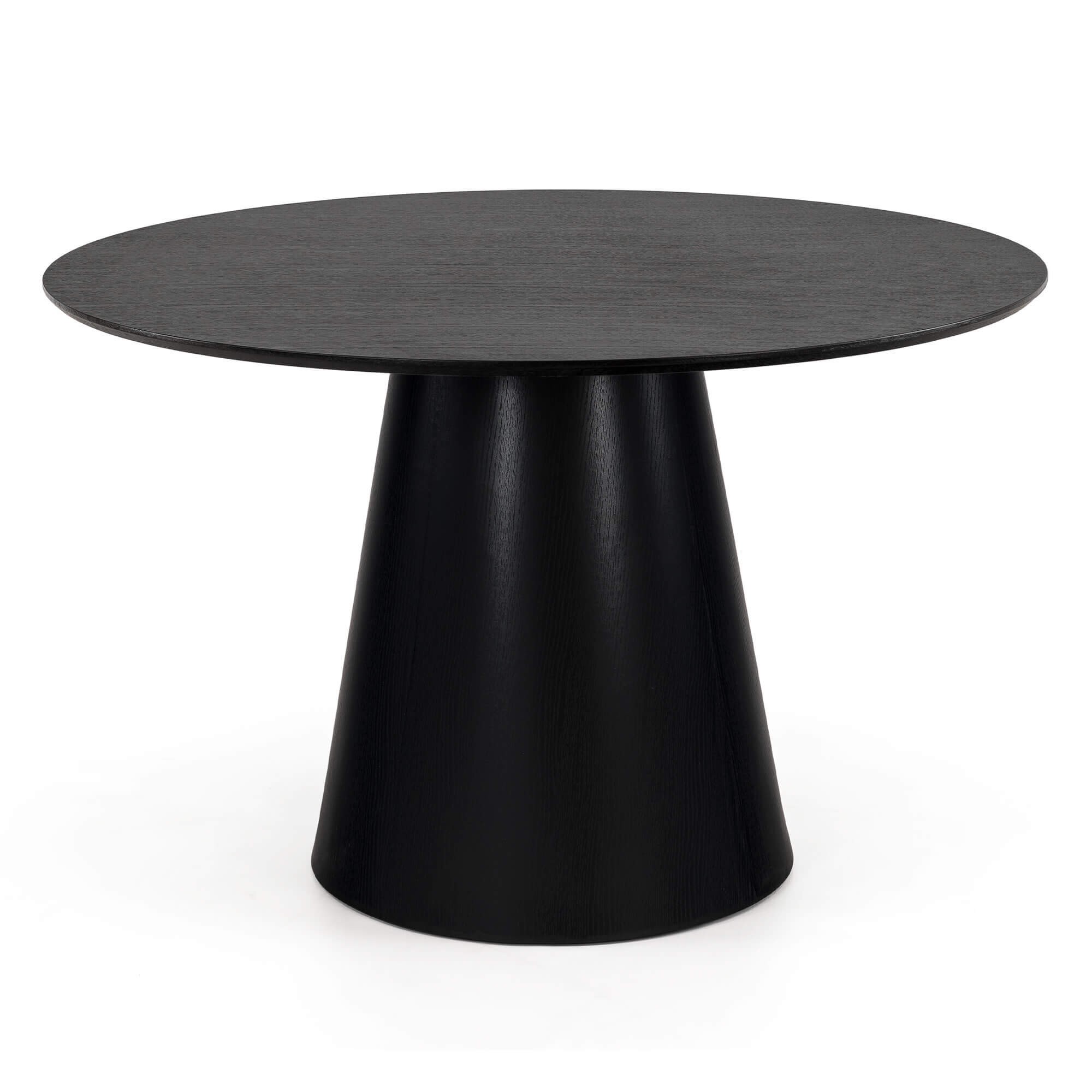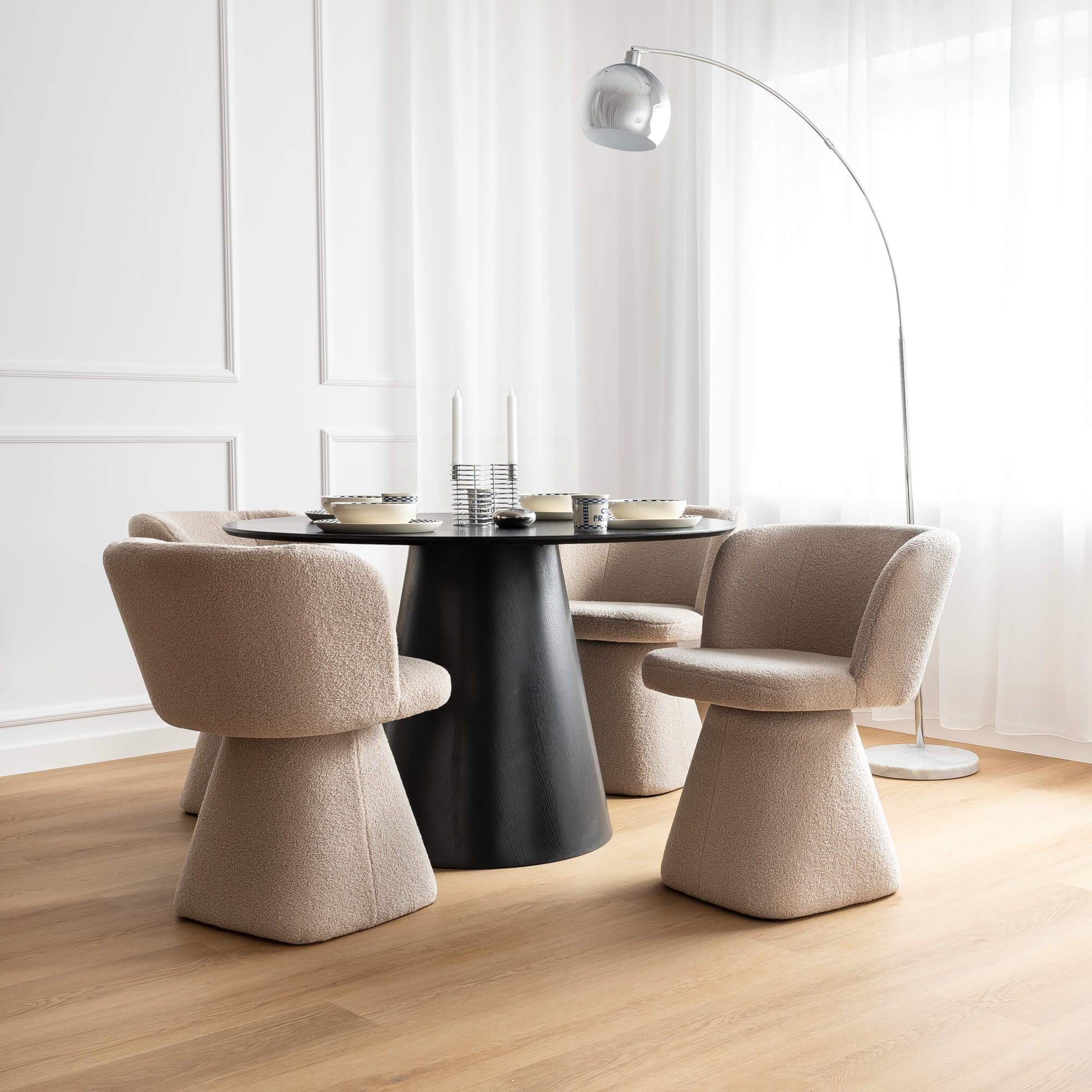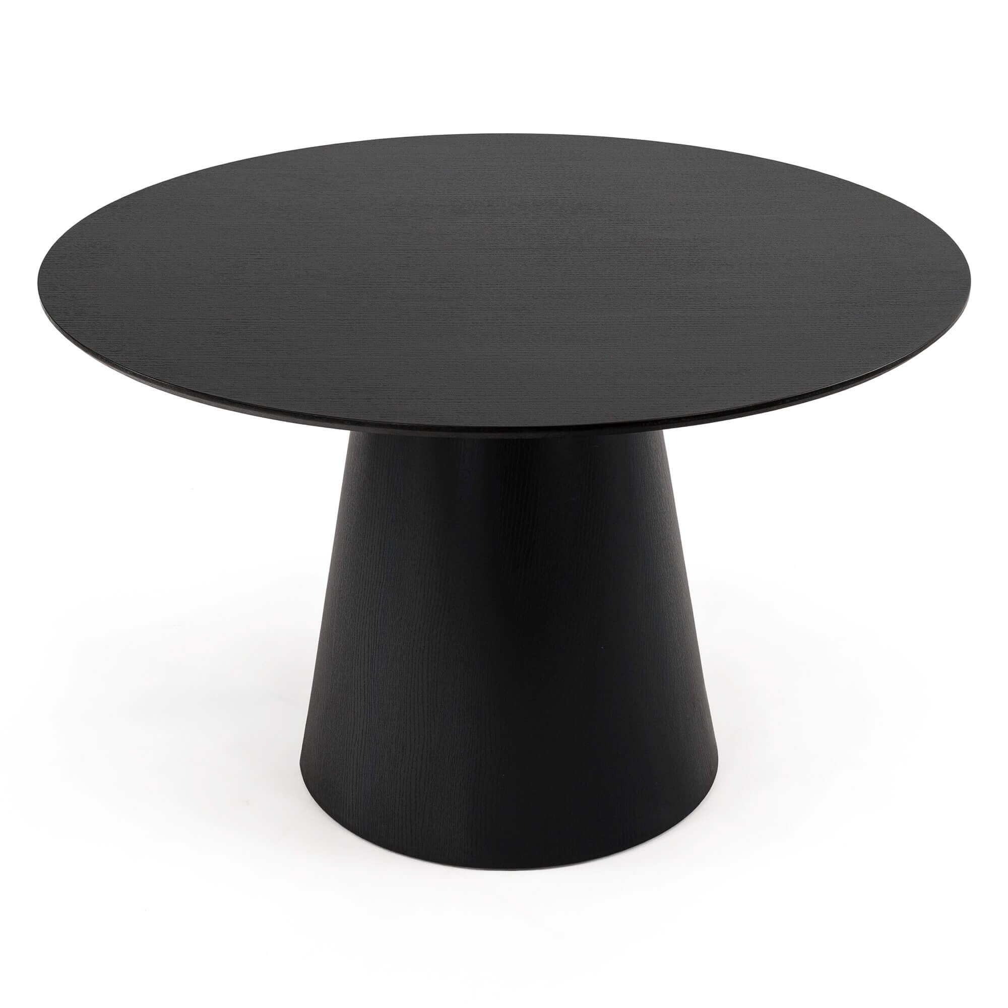 Stół Solan 120x75 cm w czarnym wykończeniu to mebel, który łączy elegancję i nowoczesny charakter. Prosta forma z okrągłym blatem i stabilną podstawą w kształcie stożka sprawia, że stół jest nie tylko funkcjonalny, ale także stanowi mocny akcent dekoracyjny we wnętrzu. Czerń dodaje mu wyjątkowej klasy i sprawia, że świetnie odnajdzie się zarówno w nowoczesnych aranżacjach, jak i w bardziej minimalistycznych przestrzeniach. Okrągły kształt sprzyja swobodnym rozmowom przy posiłkach, a jego wielkość pozwala wygodnie usadzić 4 osoby. Dzięki kompaktowym wymiarom jest to idealne rozwiązanie do jadalni, kuchni czy salonu, gdzie liczy się zarówno wygoda, jak i estetyka.