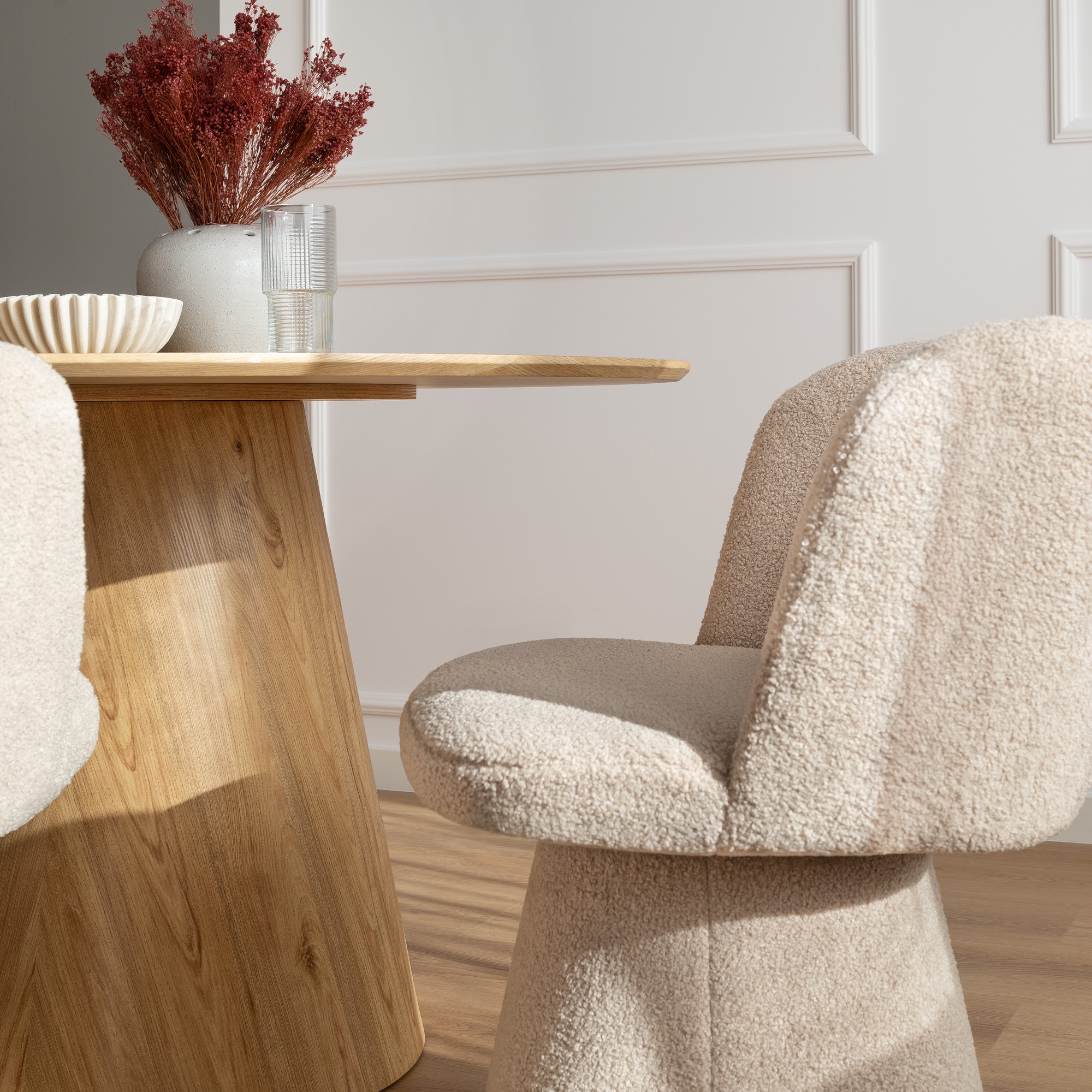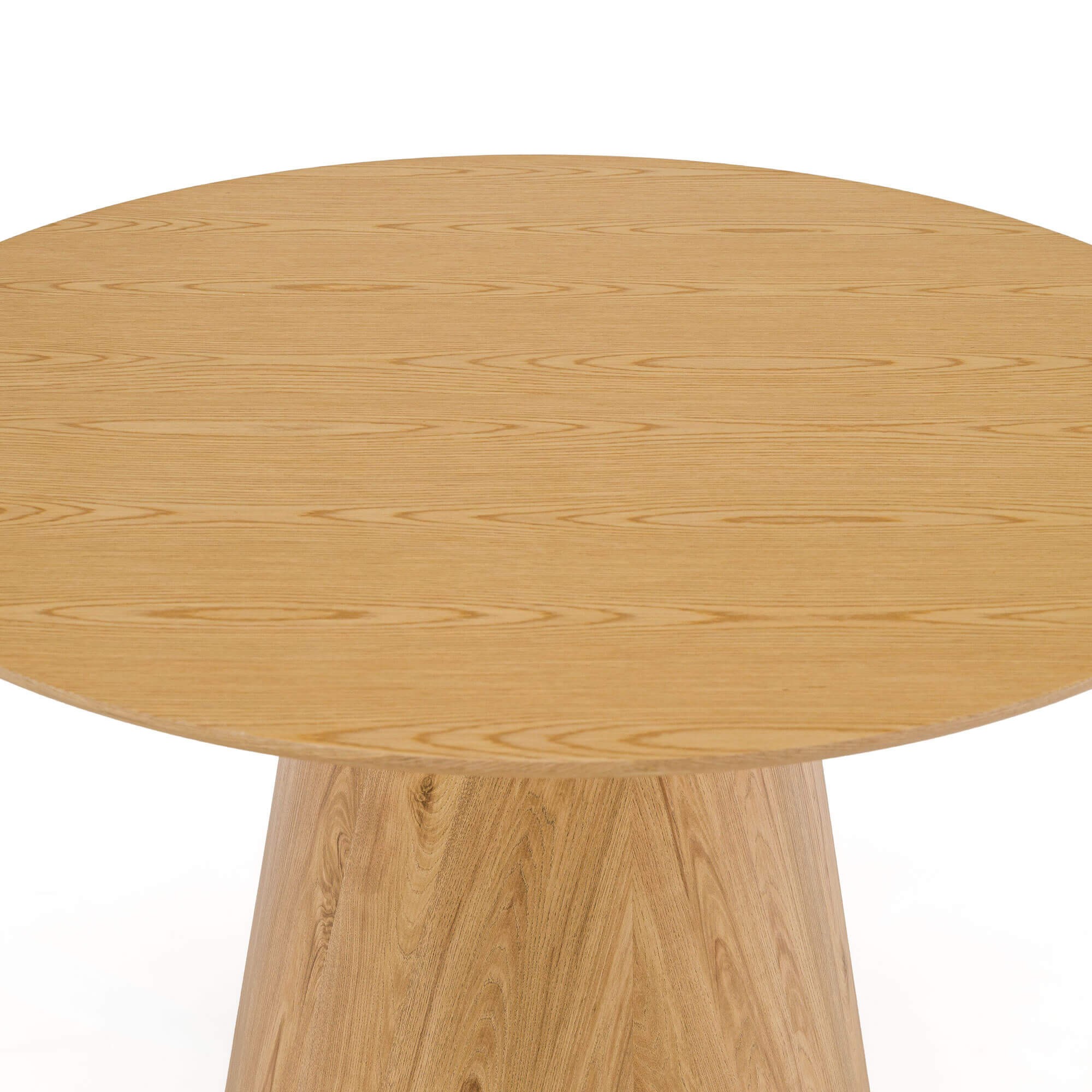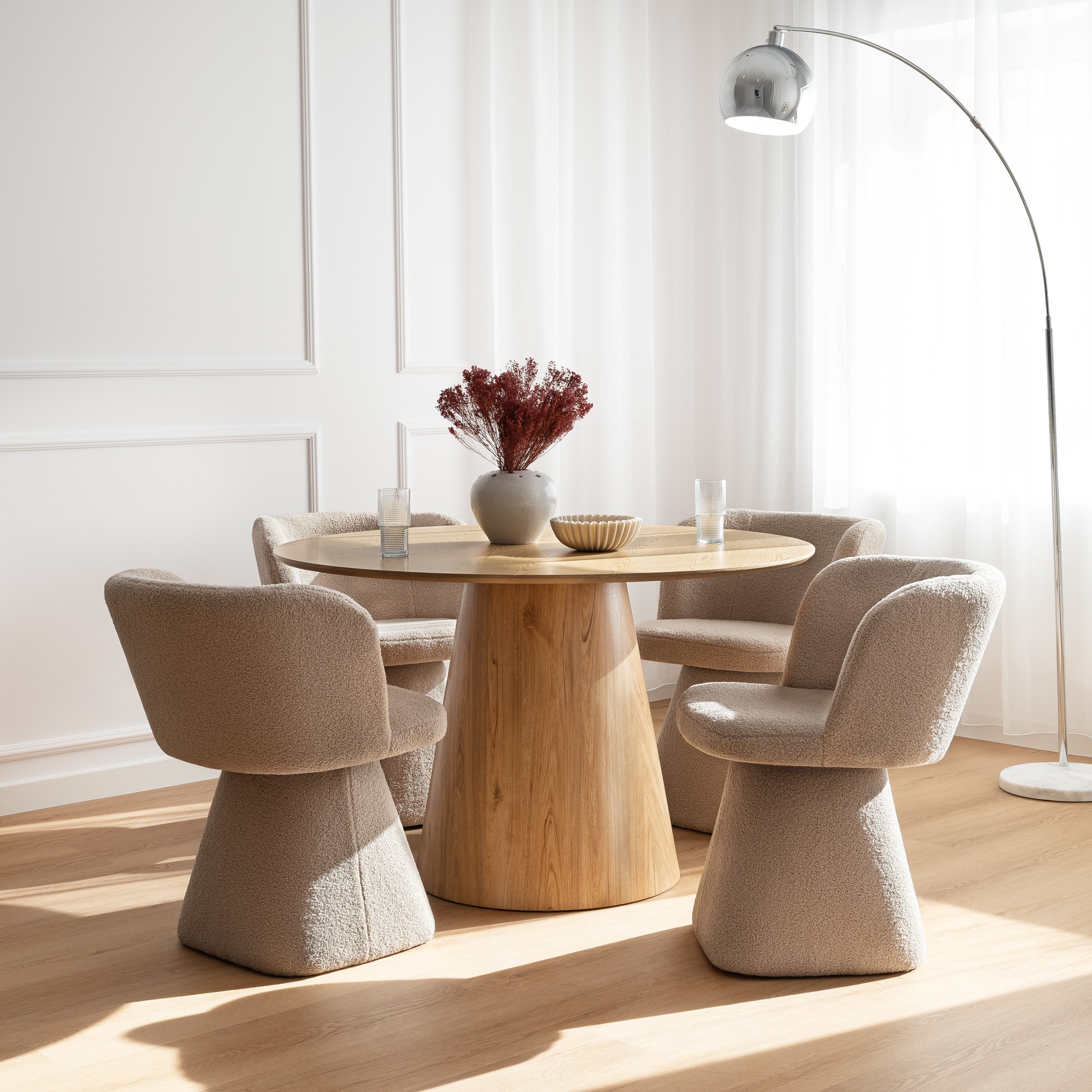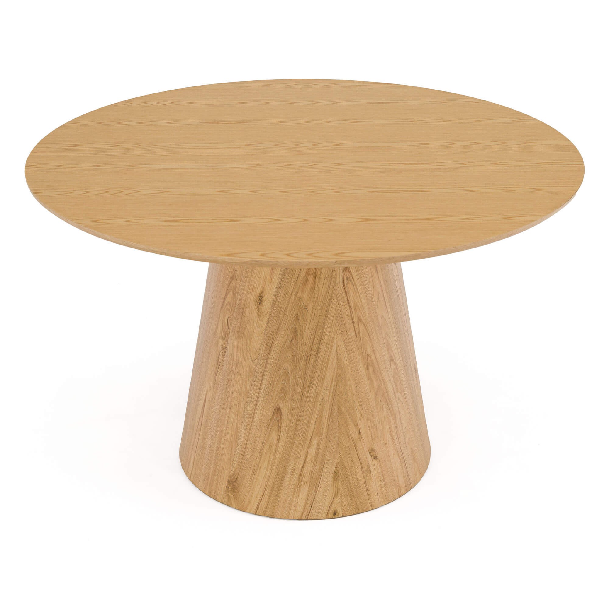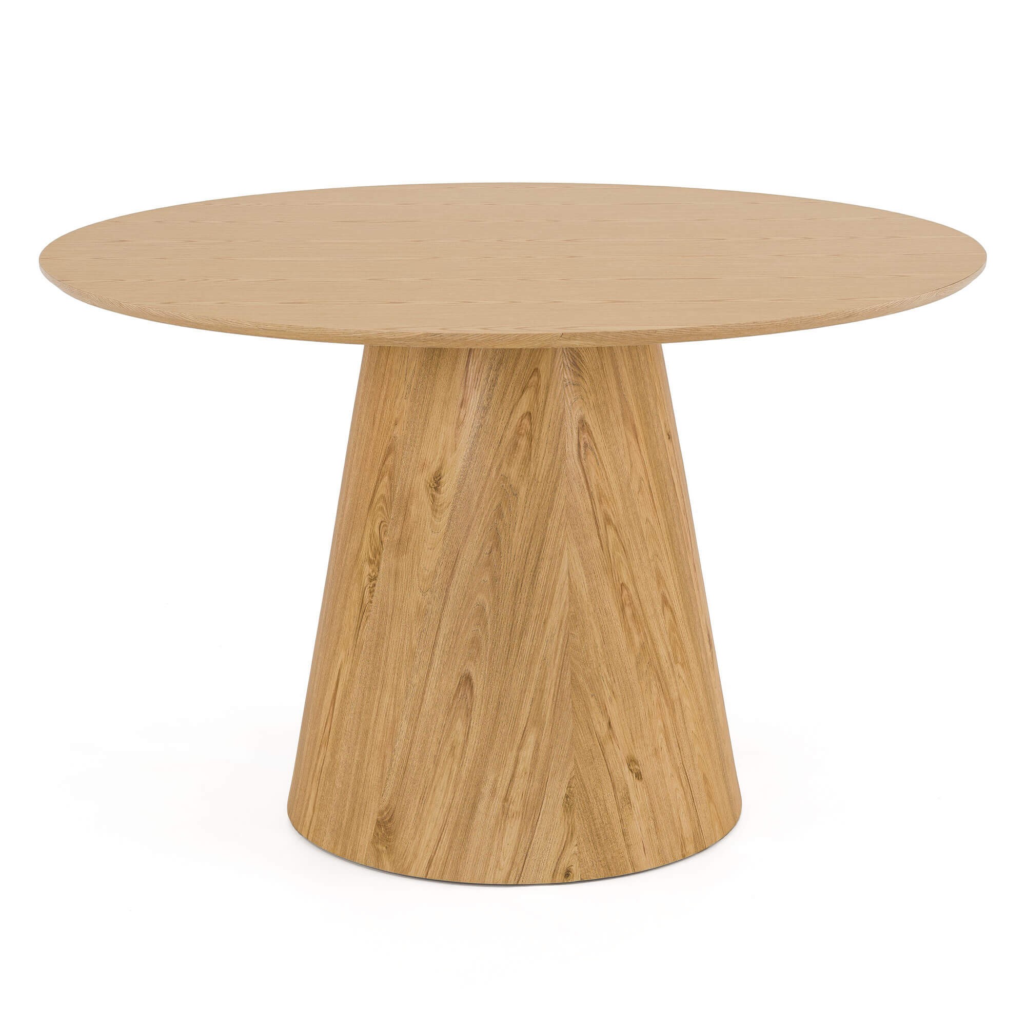 Stół Solan 120x75 cm w kolorze naturalnego dębu to mebel, który łączy w sobie prostotę i nowoczesną elegancję. Okrągły blat wsparty na stabilnej, pełnej nodze w formie stożka sprawia, że całość prezentuje się solidnie i nowocześnie, a jednocześnie lekko wpisuje się w każde wnętrze. Dzięki swojej formie stół doskonale sprawdzi się zarówno w jadalni, salonie, jak i w przestrzeni biurowej – przyjemnie eksponując się w towarzystwie nowoczesnych krzeseł. To model stworzony z myślą o codziennym użytkowaniu. Okrągły kształt sprzyja wspólnym posiłkom i rozmowom, a stabilna podstawa zapewnia wygodę siedzenia bez przeszkadzających nóg w narożnikach. Jego uniwersalny design sprawia, że pasuje zarówno do wnętrz urządzonych w stylu minimalistycznym, jak i do bardziej klasycznych aranżacji.