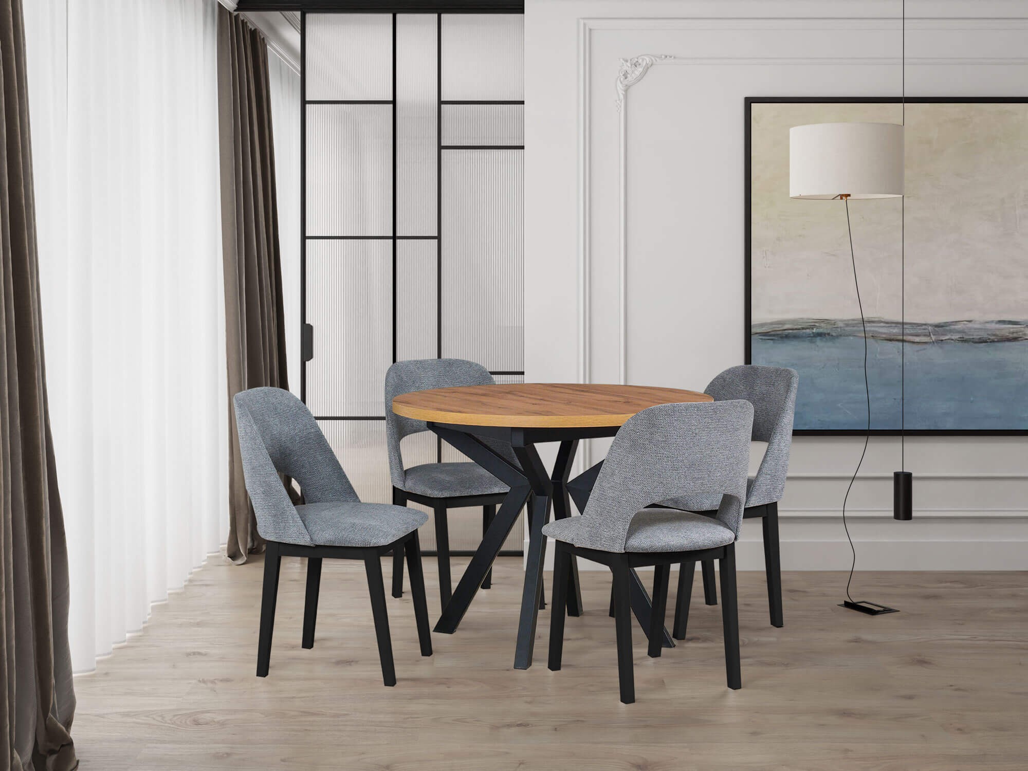 Okrągły kształt stołu sprzyja swobodnej komunikacji i idealnie sprawdzi się podczas spotkań z rodziną czy przyjaciółmi. Dzięki uniwersalnemu designowi, stół ten może stać się centralnym punktem każdego pomieszczenia, a w połączeniu z tapicerowanymi krzesłami stworzy harmonijną i elegancką przestrzeń. Stół okrągły z czarnymi nogami wprowadza do wnętrza przytulność, jednocześnie podkreślając jego nowoczesny styl. To idealne rozwiązanie zarówno do salonu, jak i biura, które z pewnością doda klasy i nowoczesności każdemu wnętrzu.
