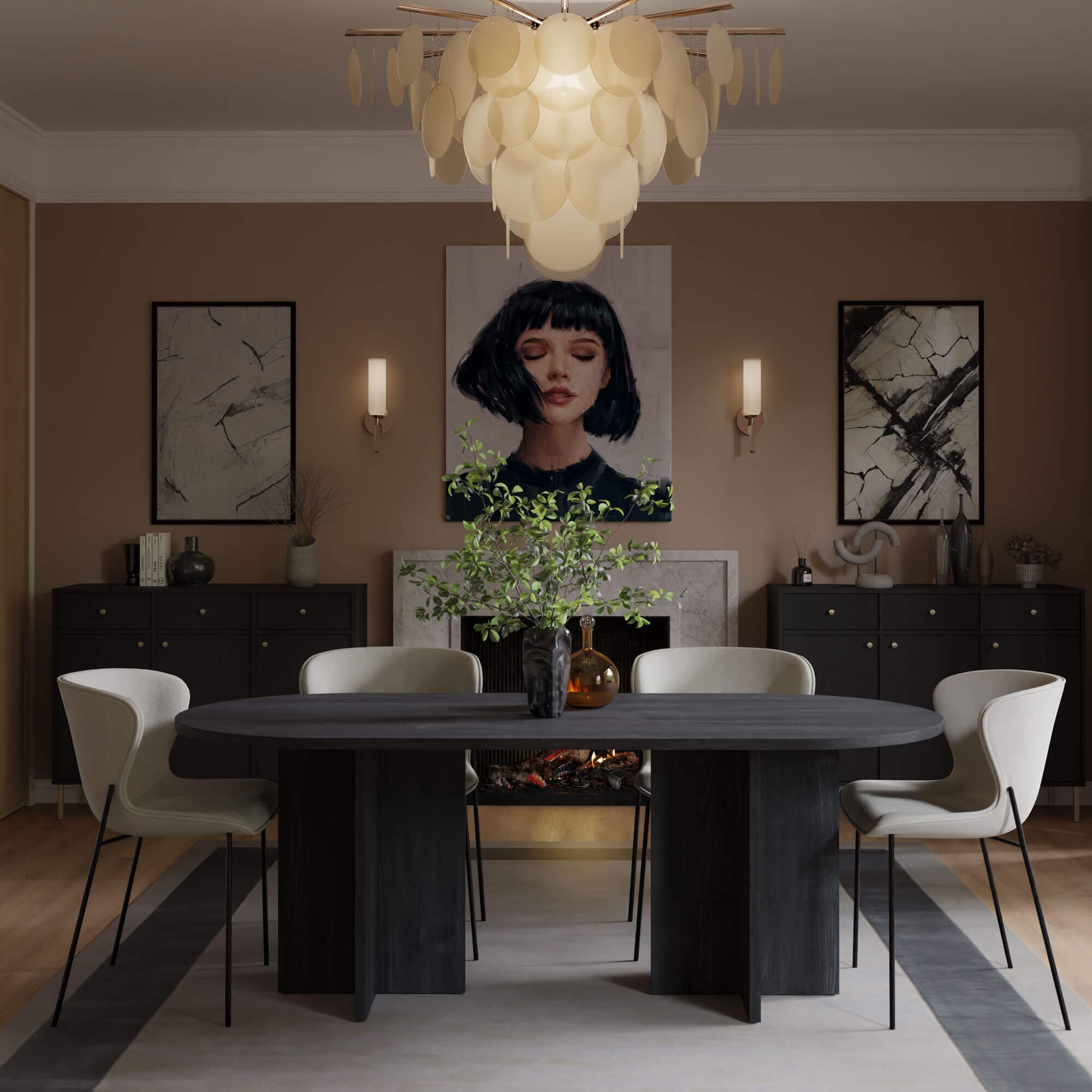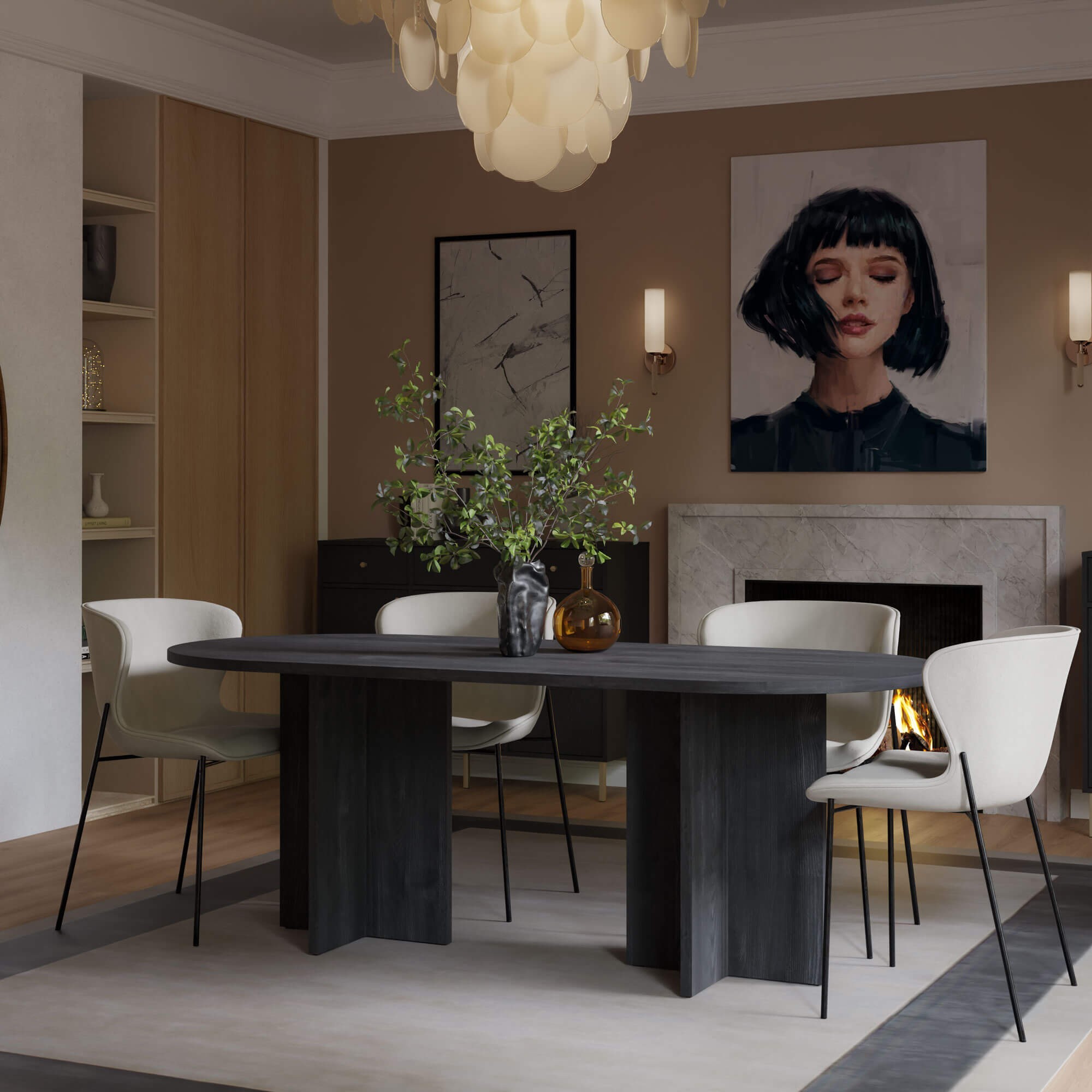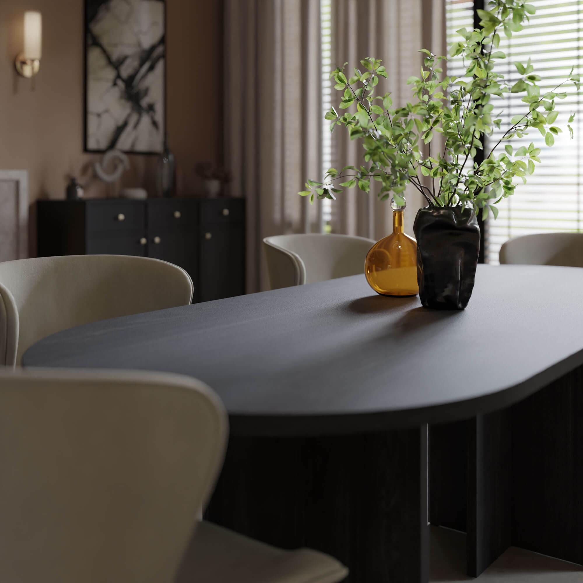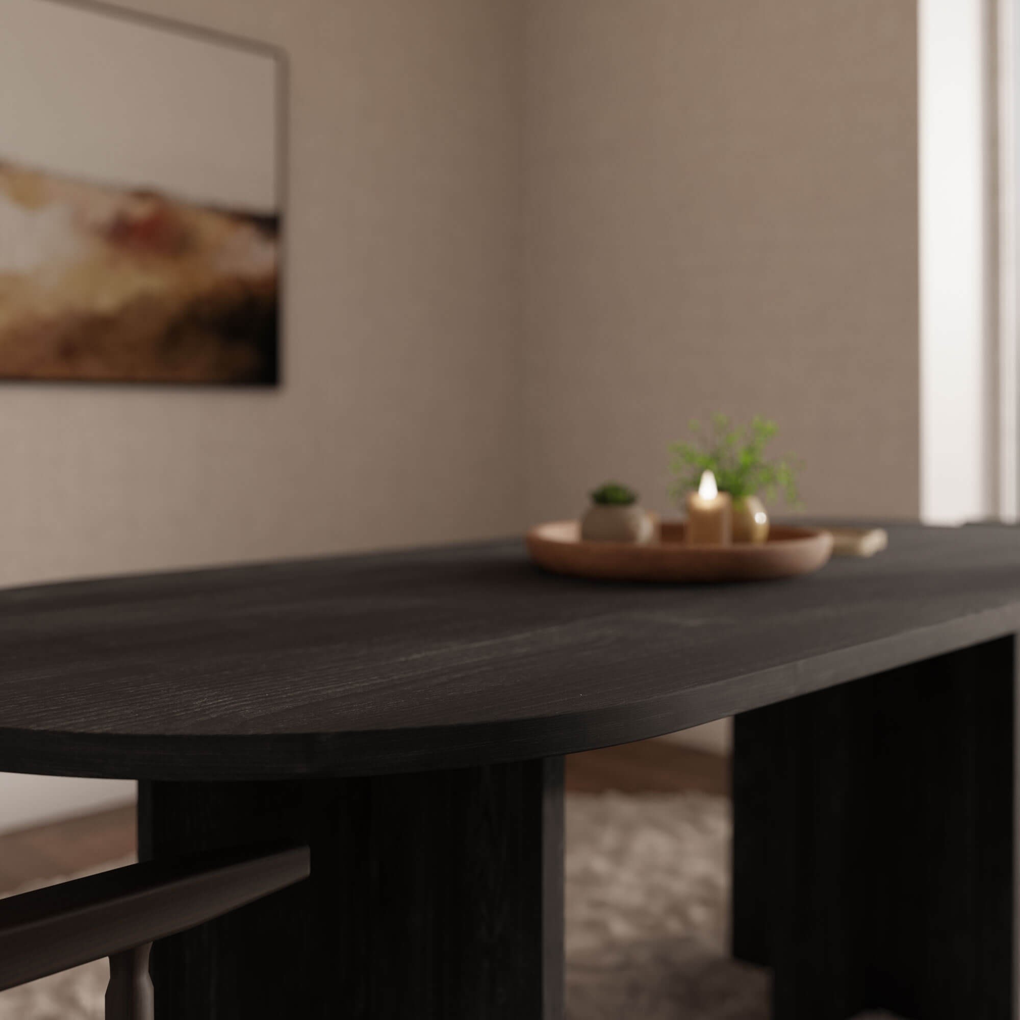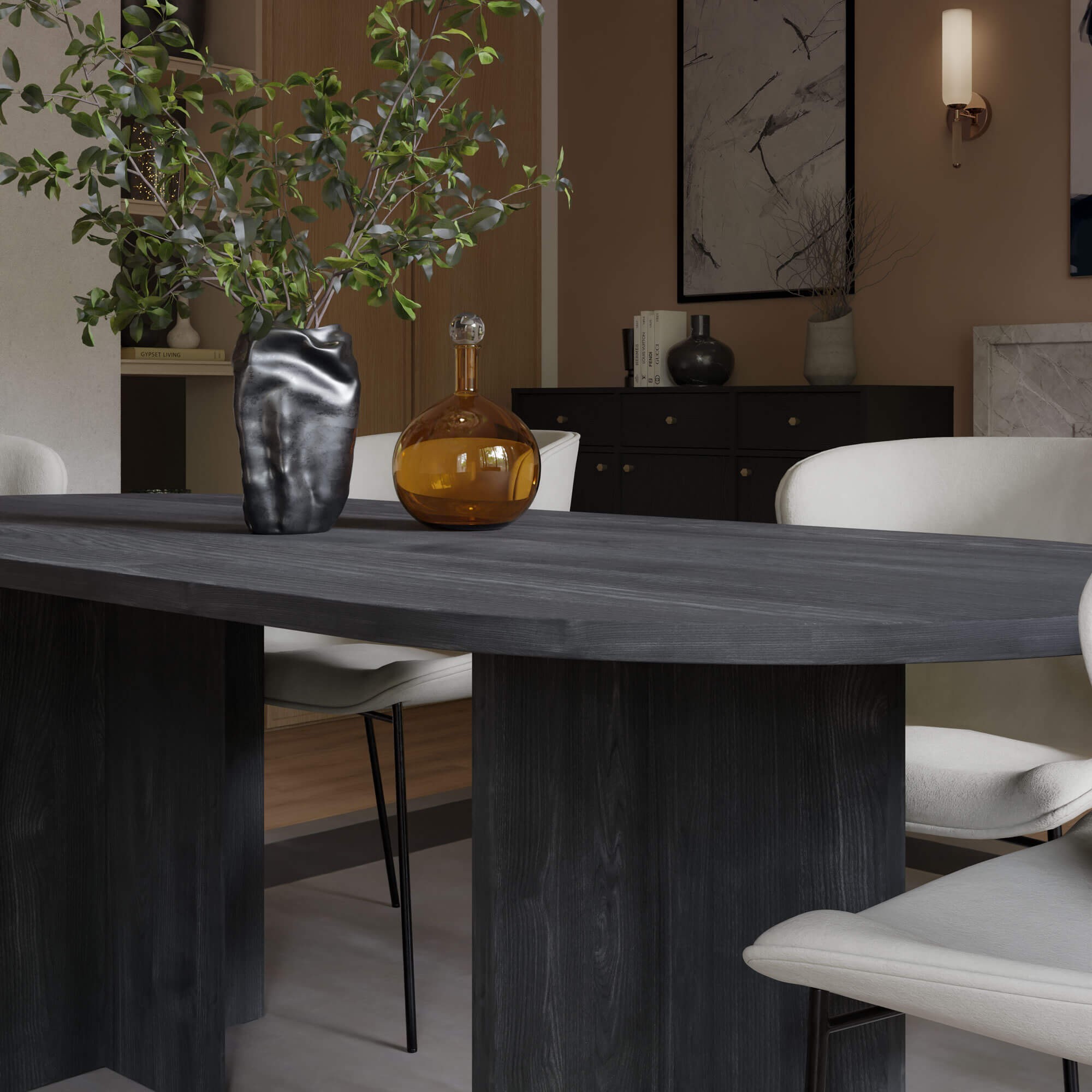 Stół pięknie komponuje się z jasnymi ścianami, tapicerowanymi krzesłami oraz złotymi i czarnymi detalami. Stół LOEN w tej wersji kolorystycznej podkreśla charakter wnętrza i nadaje mu ponadczasowej elegancji.