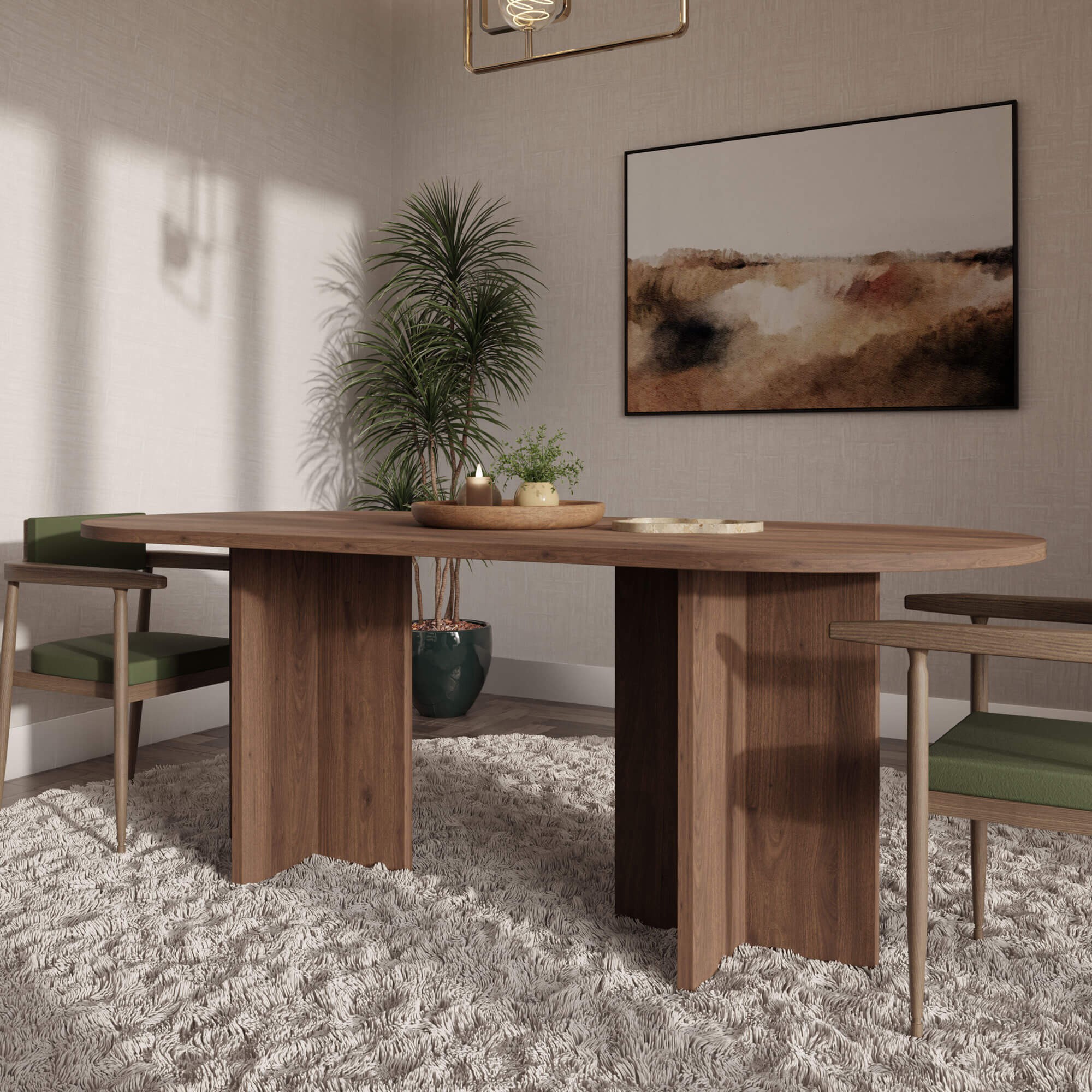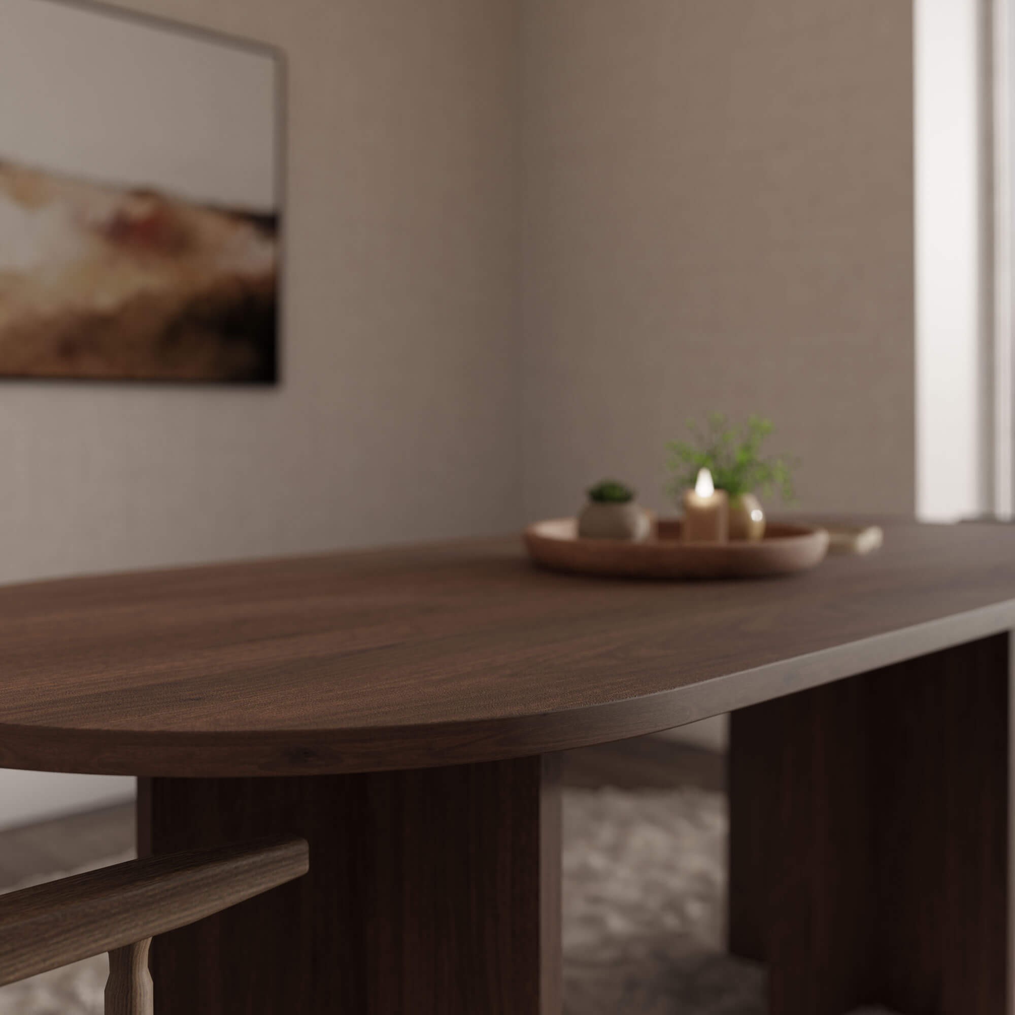 Charakterystyczne, panelowe nogi nadają stołowi wyrazistości i stabilności. Konstrukcja została zaprojektowana w sposób zapewniający równomierne rozłożenie ciężaru oraz komfort ustawienia krzeseł. Owalna forma blatu sprzyja wygodnemu rozmieszczeniu gości i podnosi funkcjonalność przestrzeni.