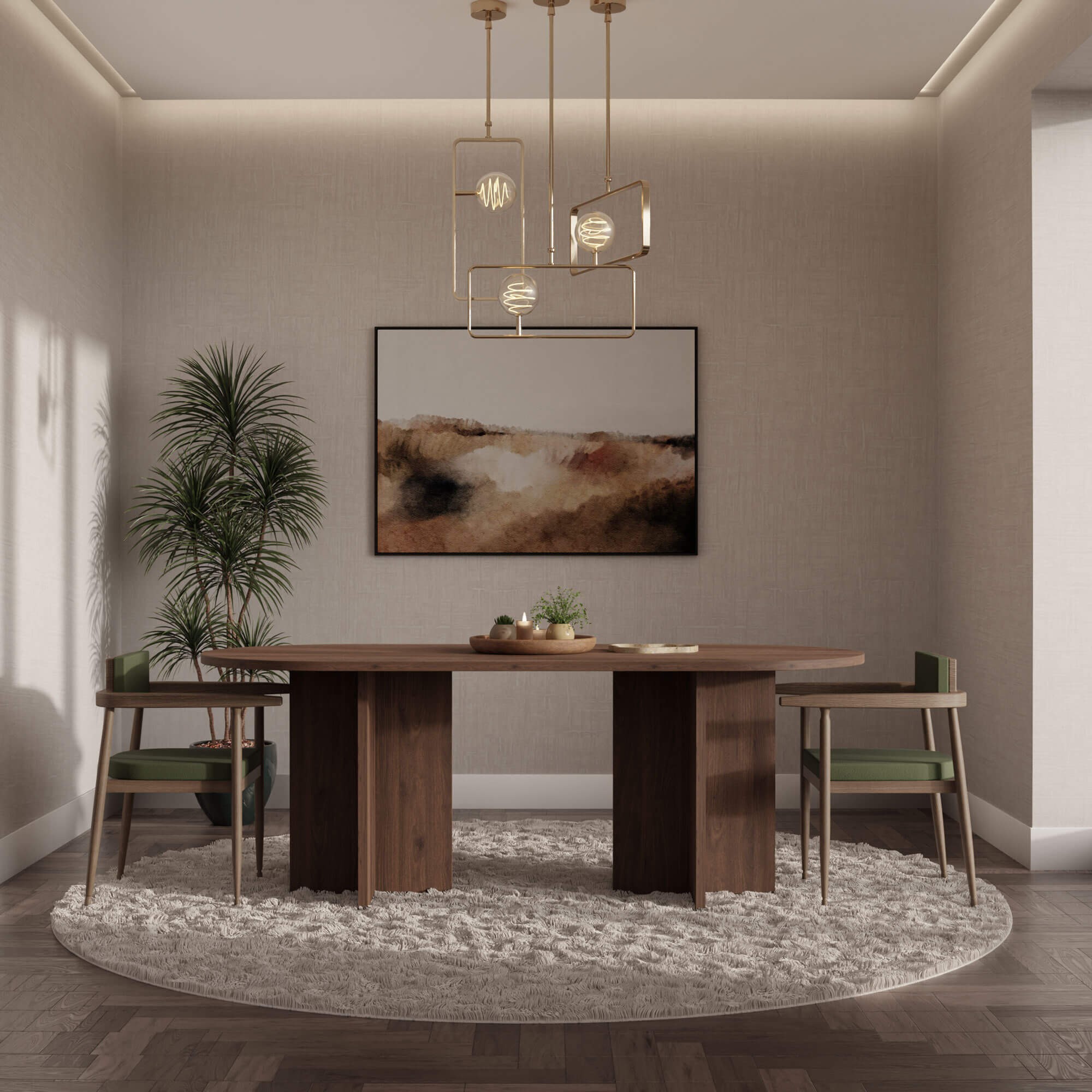 Orzechowy odcień doskonale komponuje się z tapicerowanymi krzesłami, naturalnymi tkaninami i złotymi lub czarnymi dodatkami. To stół, który subtelnie podkreśla charakter wnętrza bez dominowania przestrzeni.