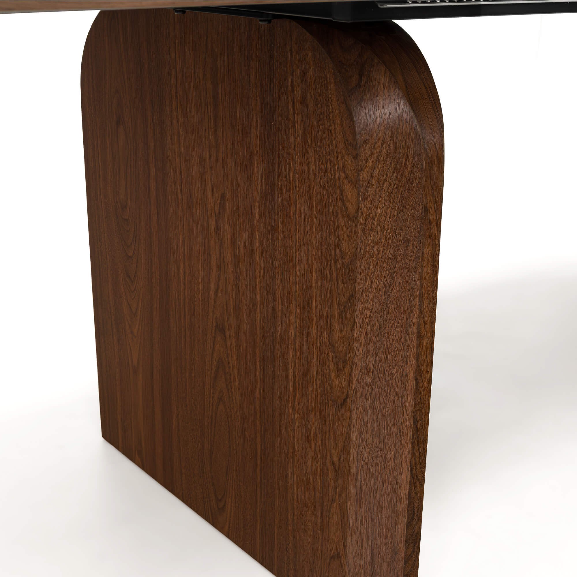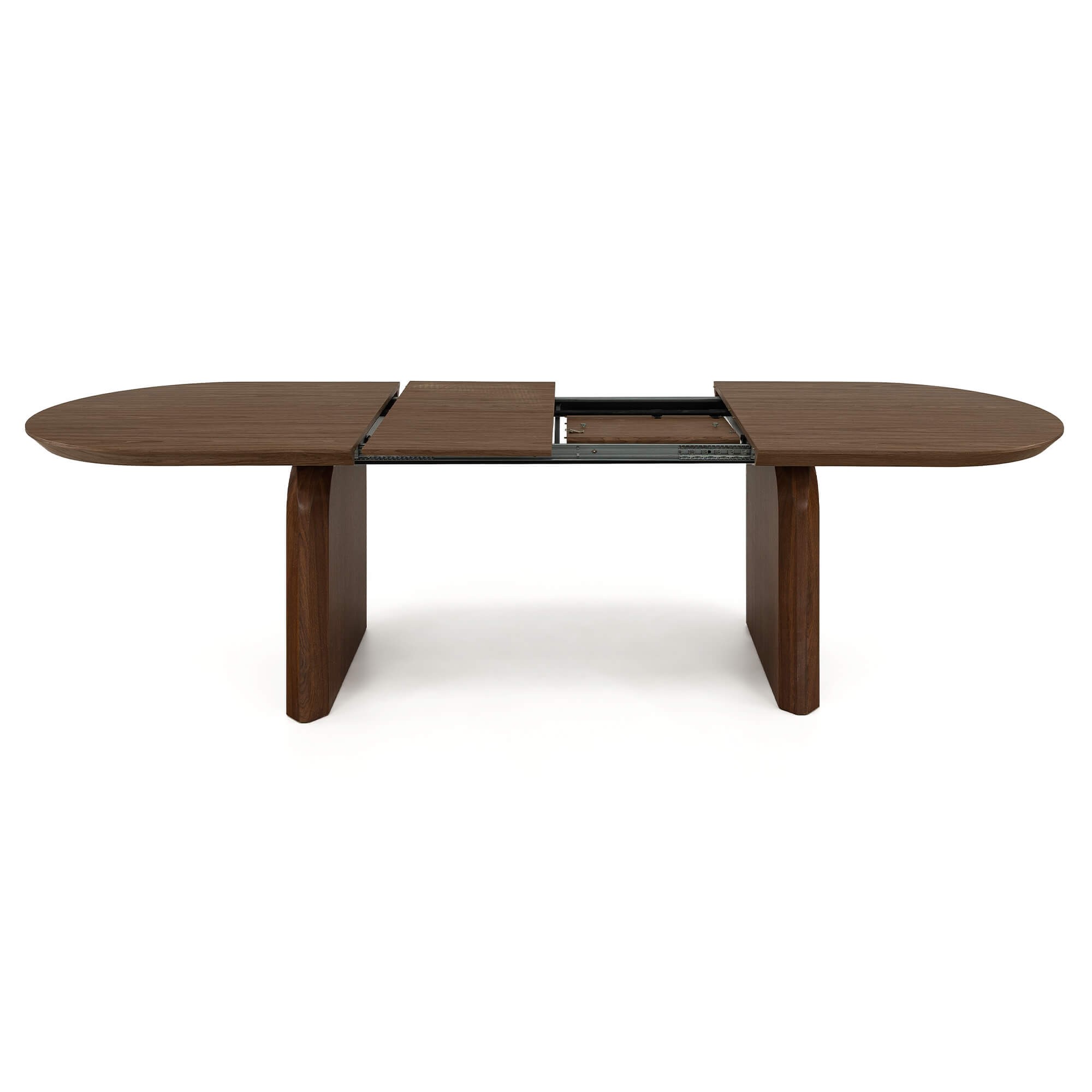 Solidność stołu opiera się na dwóch szerokich, monolitycznych nogach o zaokrąglonych krawędziach. Taka konstrukcja zapewnia maksymalną stabilność nawet przy pełnym rozłożeniu blatu do trzech metrów. Wnętrze stołu zostało wyposażone w dedykowane klamry zabezpieczające, które trzymają wkładki w stabilnej pozycji, gwarantując równe i bezpieczne połączenie powierzchni roboczej.