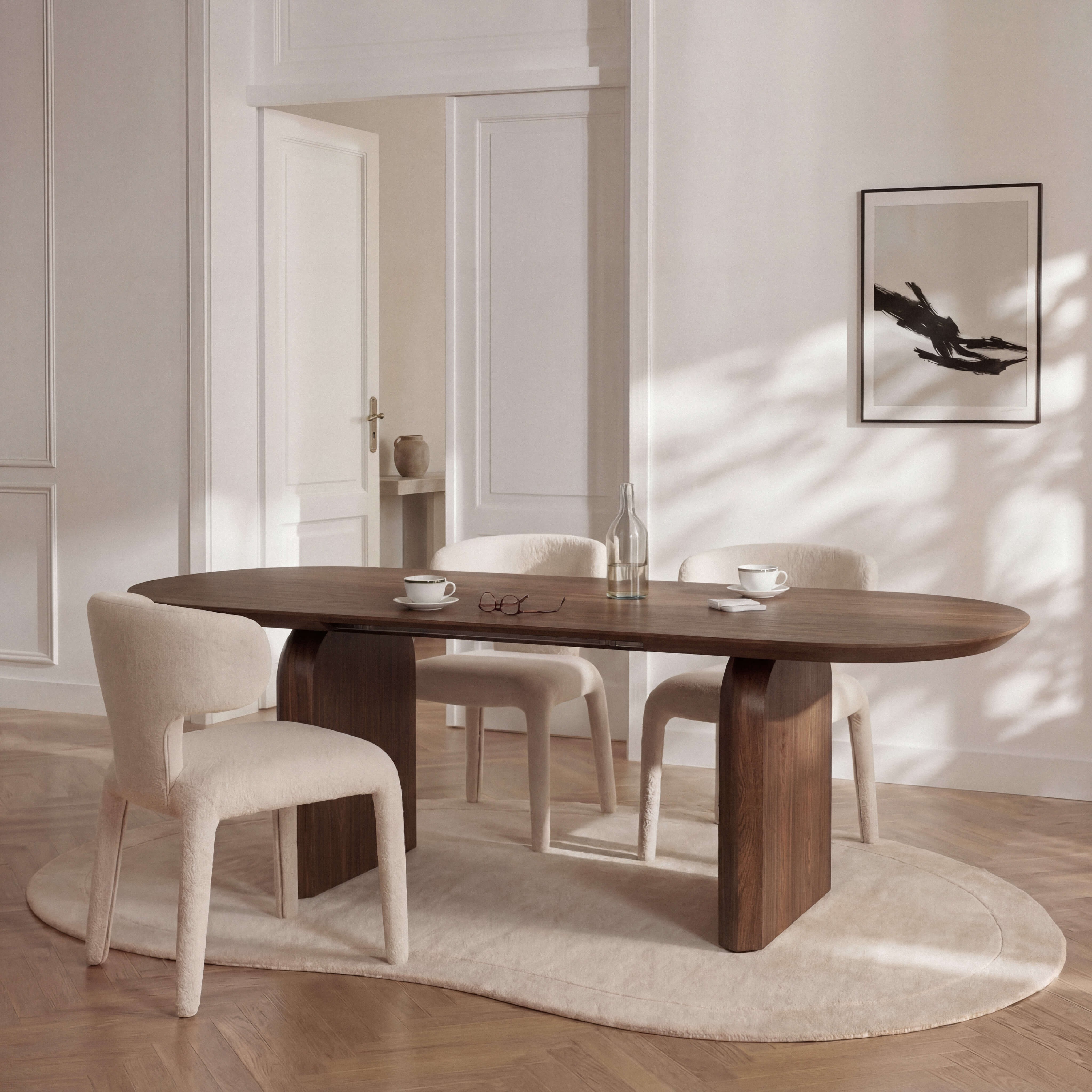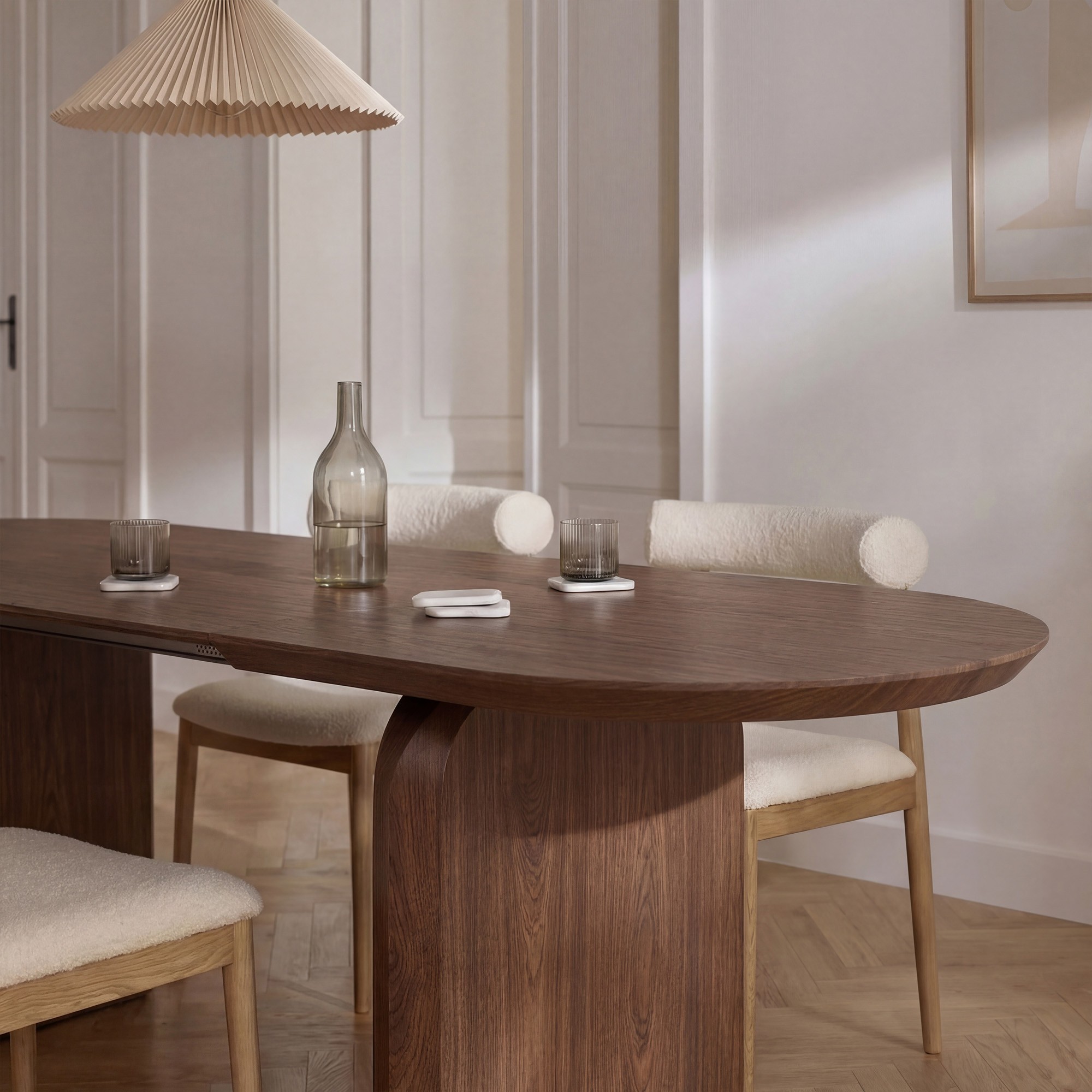 Projekt stołu CHANDLER czerpie inspirację z natury, co widać w łagodnych łukach i braku ostrych kantów. Zaokrąglone brzegi blatu nie tylko podkreślają nowoczesny design mebla, ale również znacząco podnoszą bezpieczeństwo domowników, zwłaszcza tych najmłodszych. Harmonijna sylwetka stołu sprawia, że mimo swoich dużych wymiarów, mebel nie przytłacza wnętrza, dodając mu lekkości i elegancji.