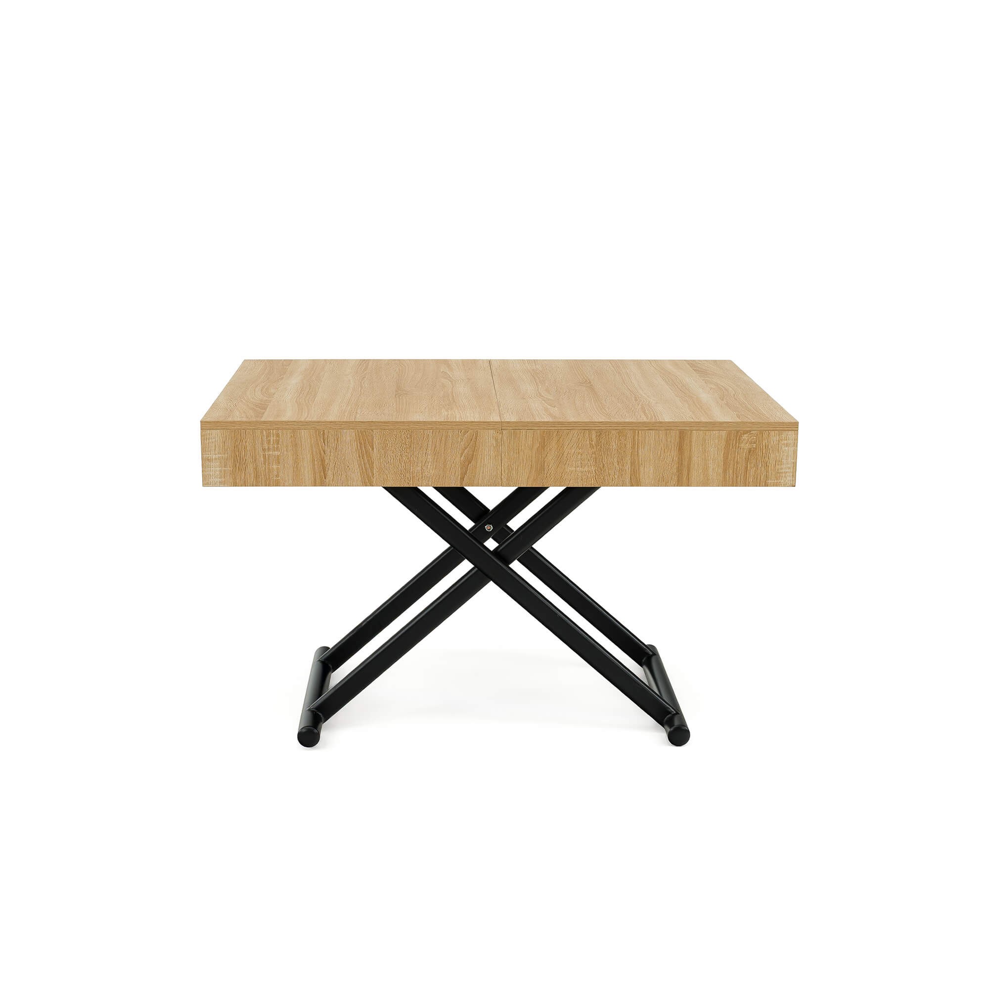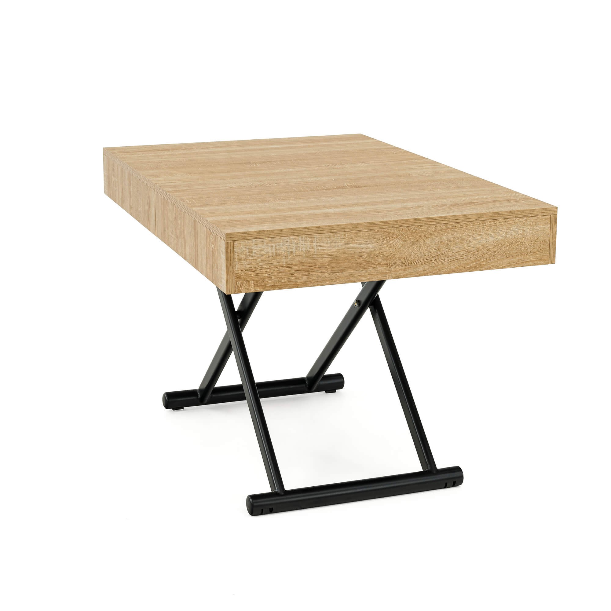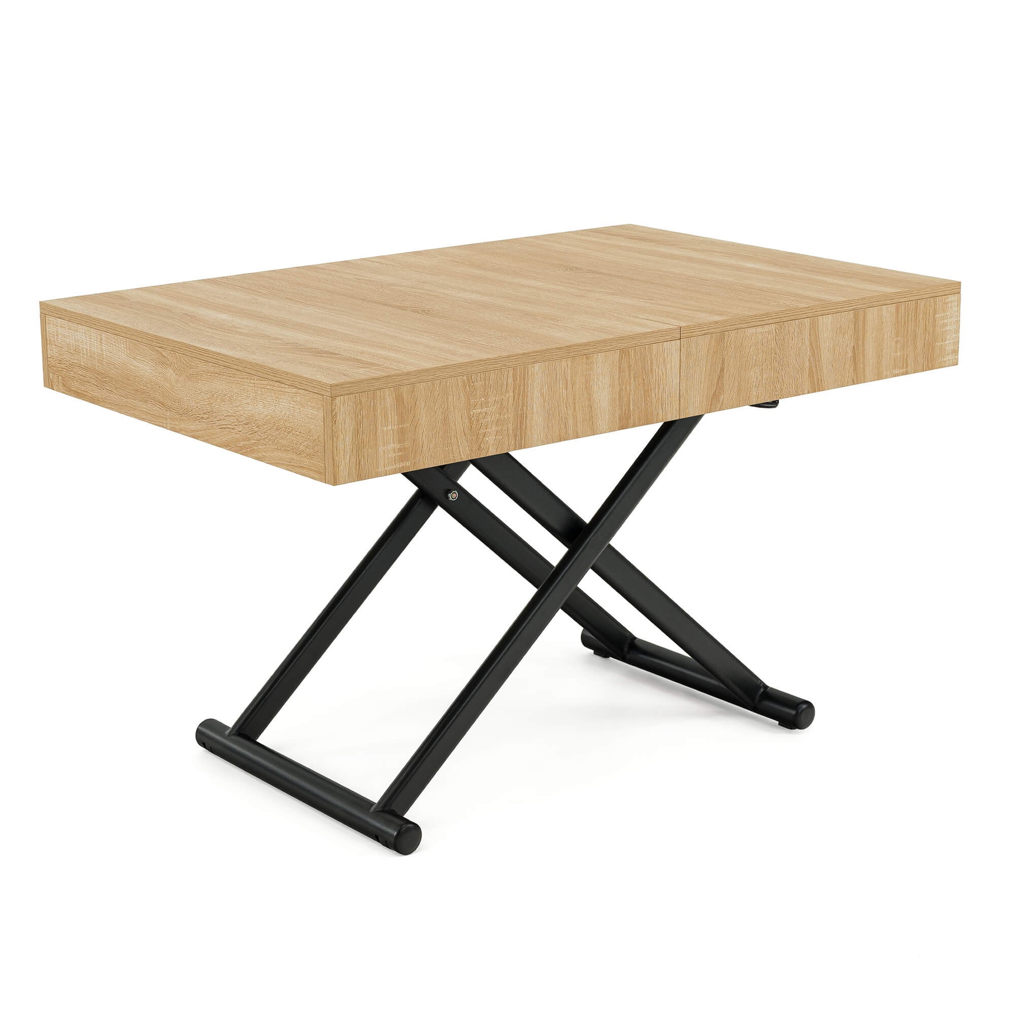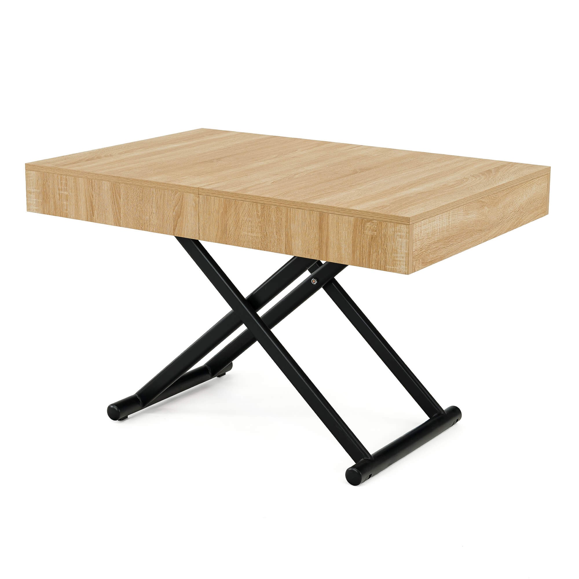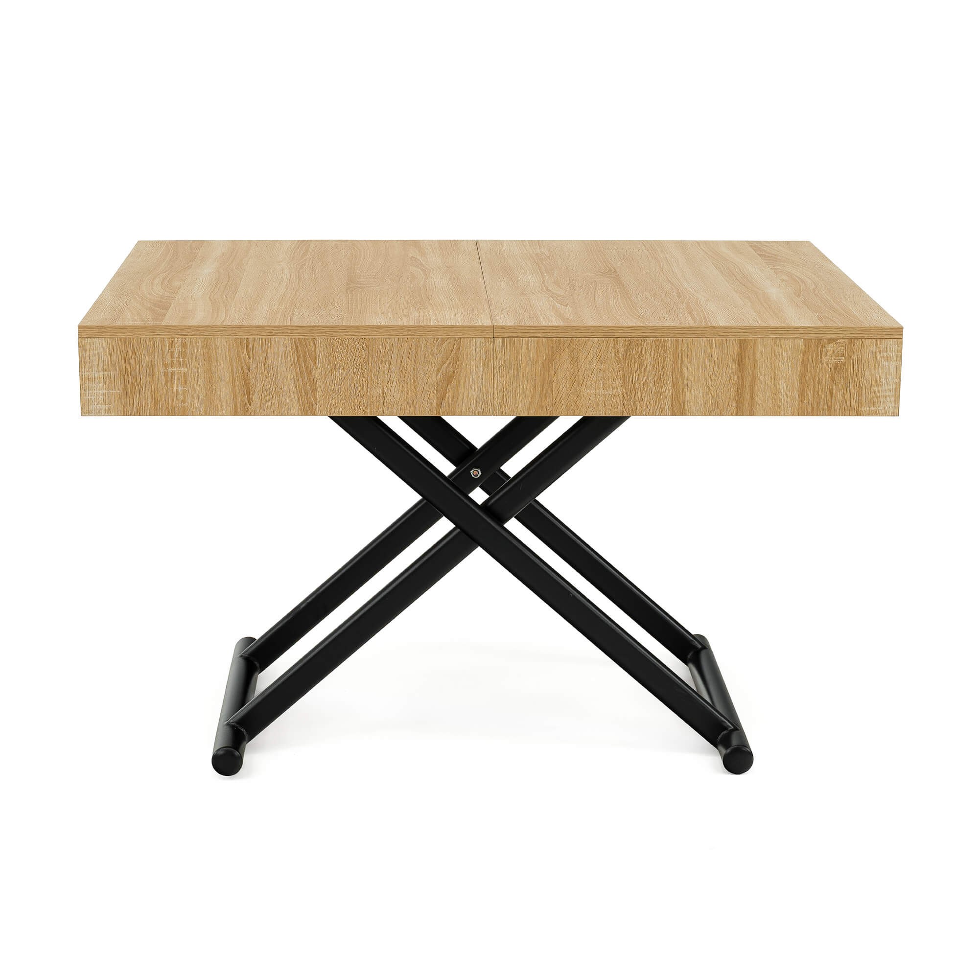 Stół SUN w kolorze dąb natural to praktyczny i nowoczesny mebel, który świetnie sprawdzi się w salonie lub jadalni. Dzięki mechanizmowi pneumatycznemu można go w prosty sposób podnosić i obniżać, dopasowując wysokość do własnych potrzeb – od niskiego stolika kawowego po pełnowymiarowy stół obiadowy. Solidny blat wykonany jest z płyty MDF oklejonej fornirem w odcieniu dąb natural, co nadaje całości eleganckiego wyglądu i sprawia, że stół pasuje zarówno do nowoczesnych, jak i klasycznych aranżacji wnętrz. Stabilna podstawa z metalowymi nogami w kształcie krzyżaka zapewnia wytrzymałość i bezpieczeństwo użytkowania, a prosty system rozkładania umożliwia szybkie dopasowanie stołu do większej liczby gości.