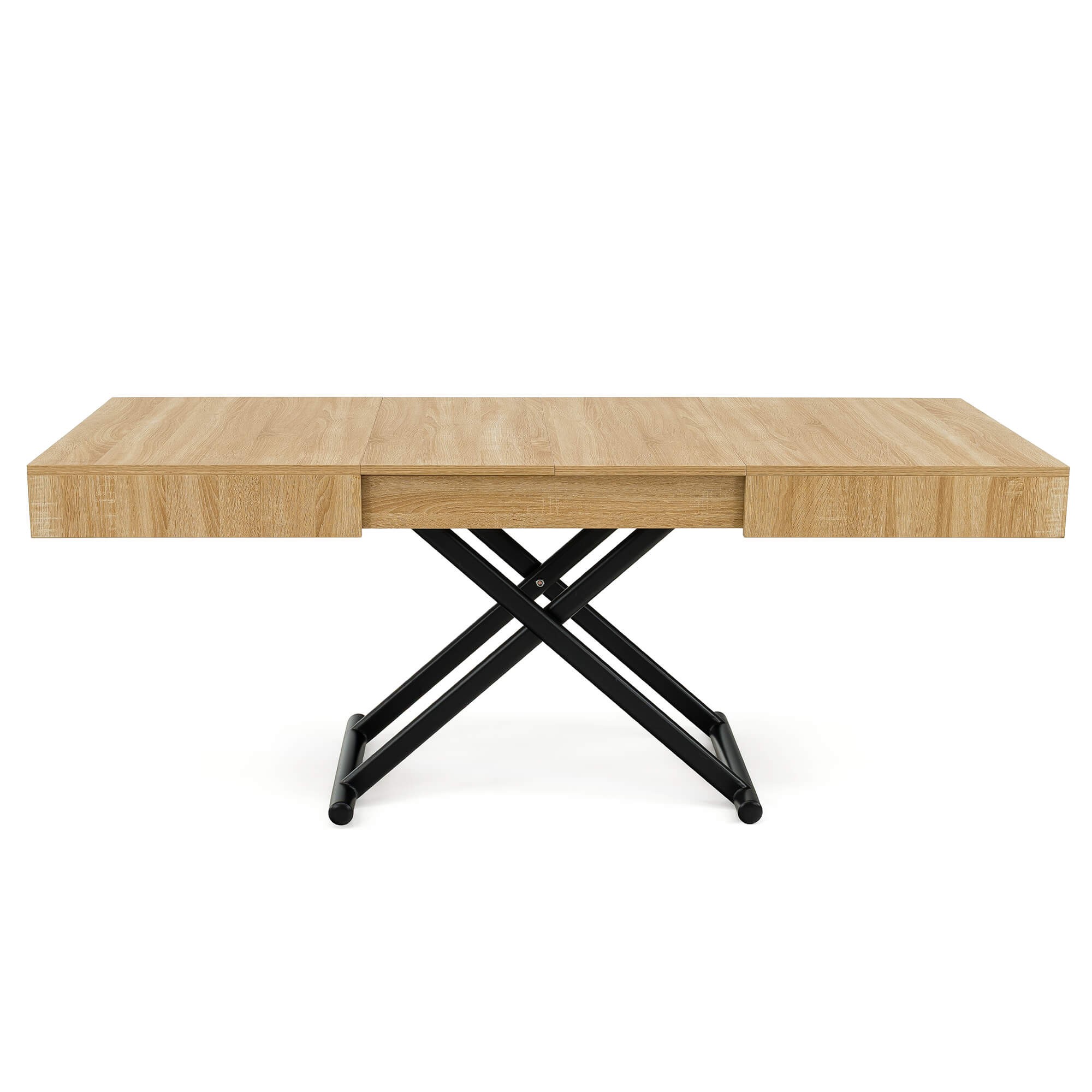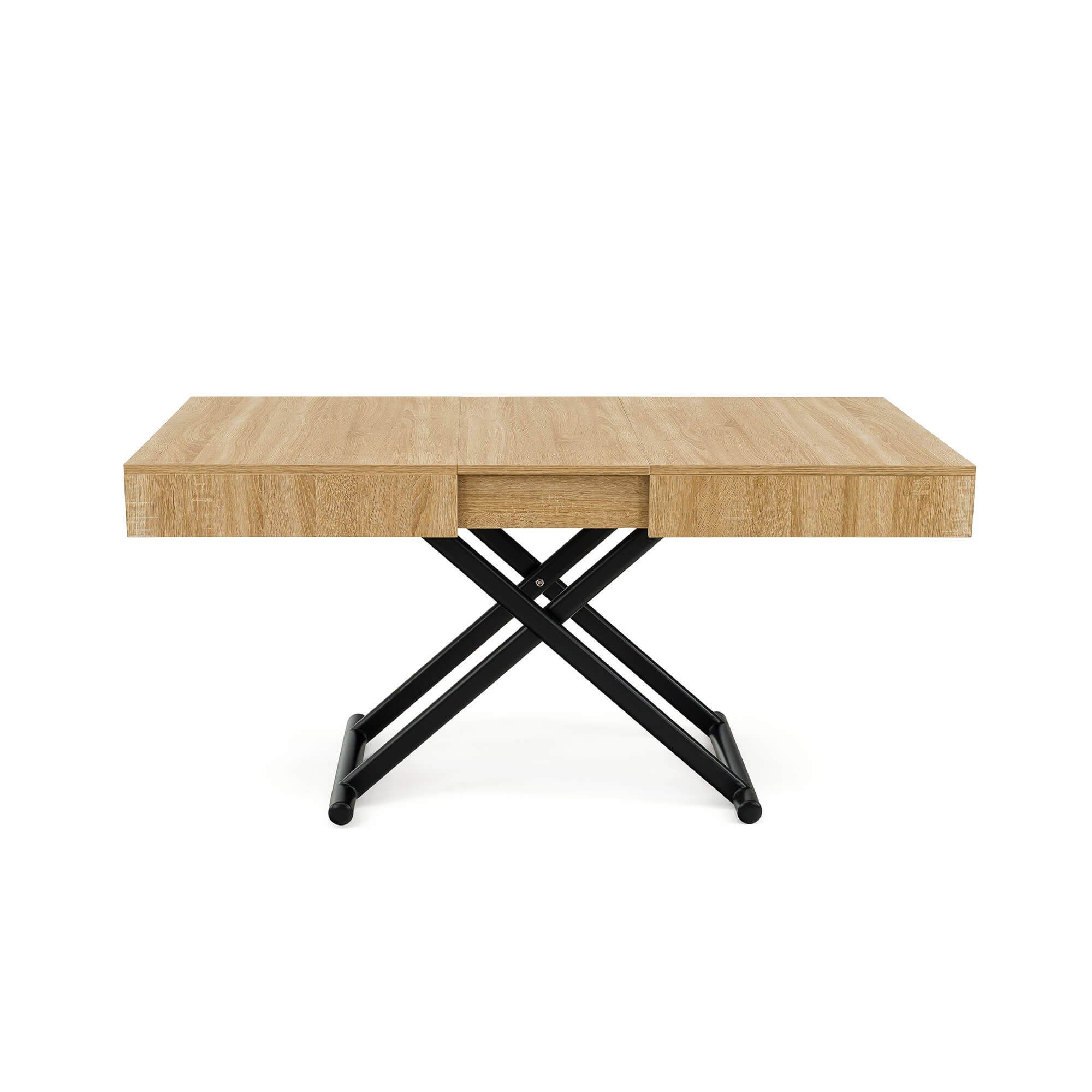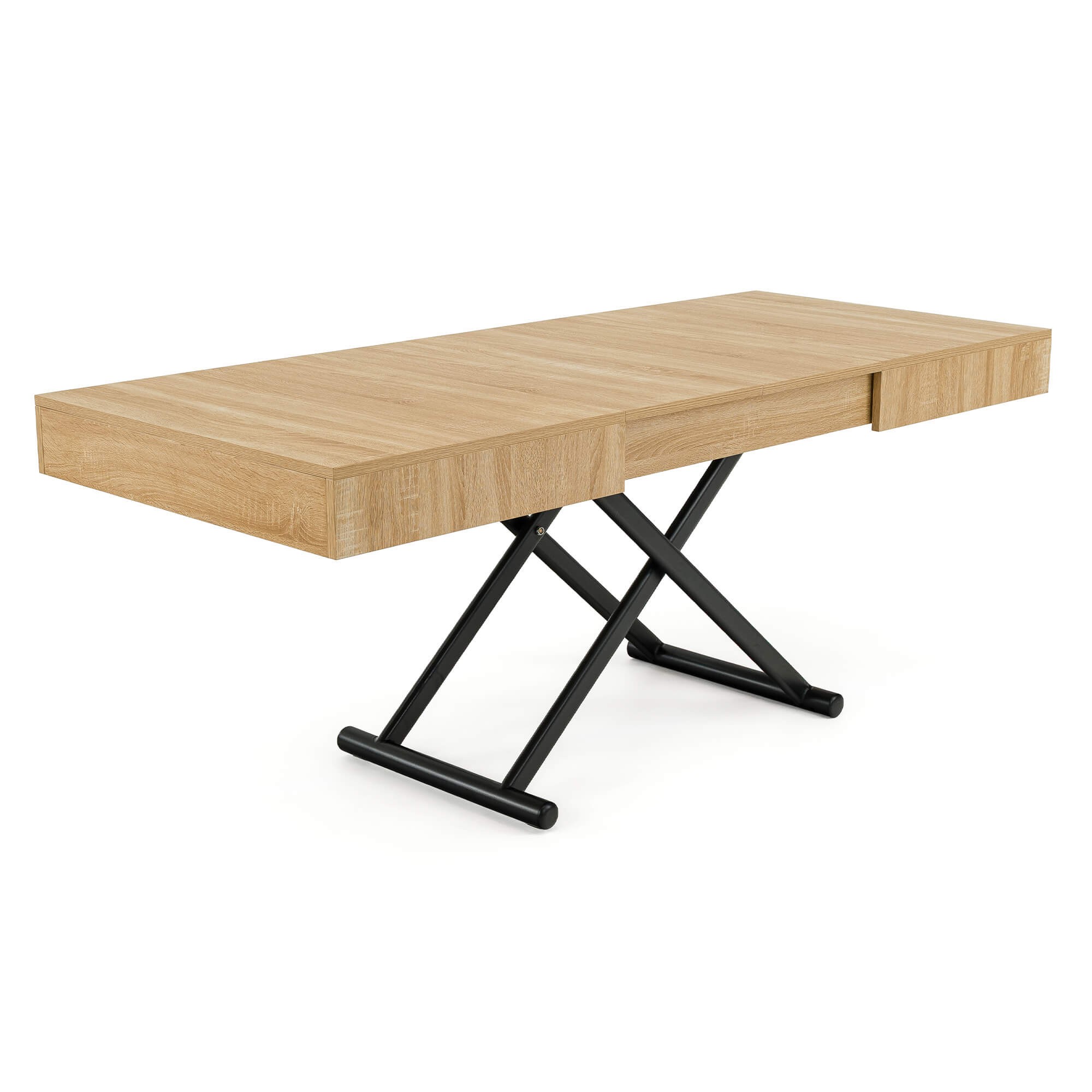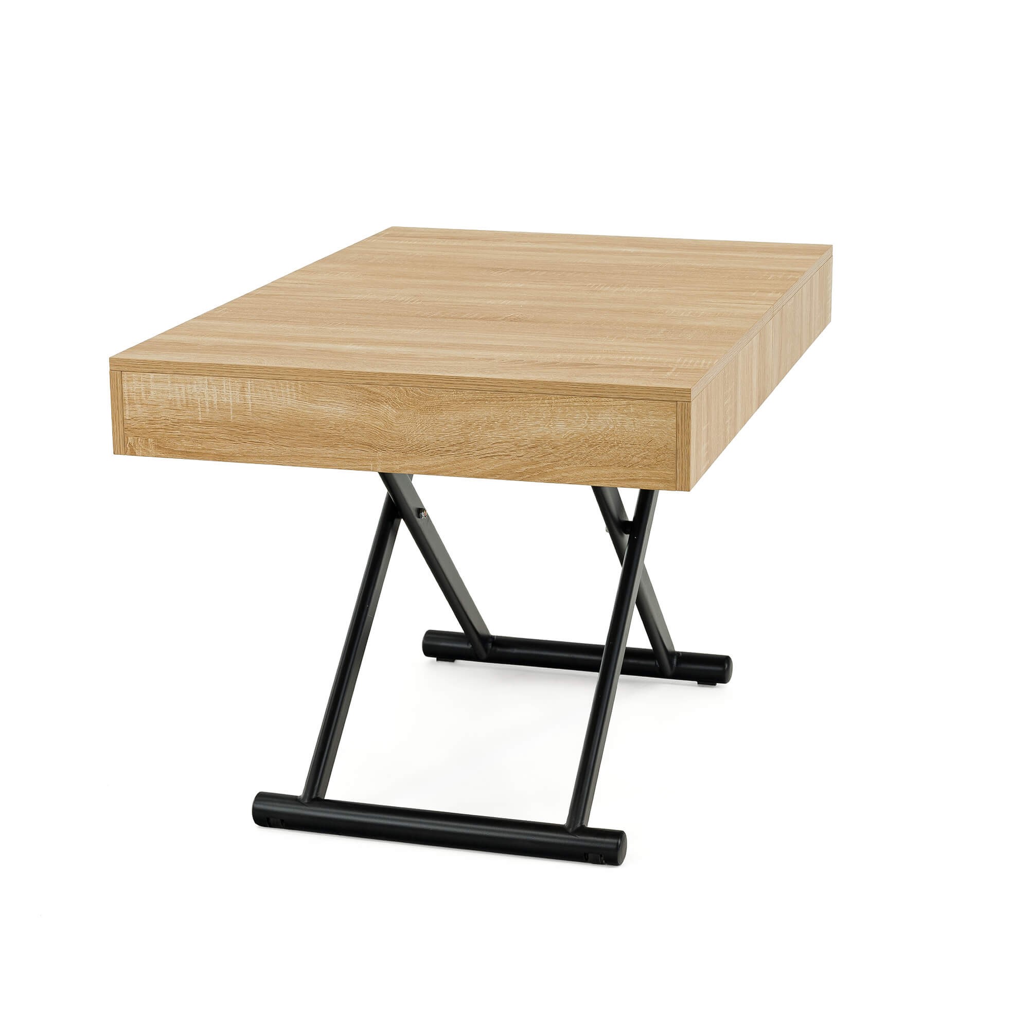 Stół SUN w kolorze dąb natural to praktyczny i nowoczesny mebel, który świetnie sprawdzi się w salonie lub jadalni. Dzięki mechanizmowi pneumatycznemu można go w prosty sposób podnosić i obniżać, dopasowując wysokość do własnych potrzeb – od niskiego stolika kawowego po pełnowymiarowy stół obiadowy. Solidny blat wykonany jest z płyty MDF oklejonej fornirem w odcieniu dąb natural, co nadaje całości eleganckiego wyglądu i sprawia, że stół pasuje zarówno do nowoczesnych, jak i klasycznych aranżacji wnętrz. Stabilna podstawa z metalowymi nogami w kształcie krzyżaka zapewnia wytrzymałość i bezpieczeństwo użytkowania, a prosty system rozkładania umożliwia szybkie dopasowanie stołu do większej liczby gości.