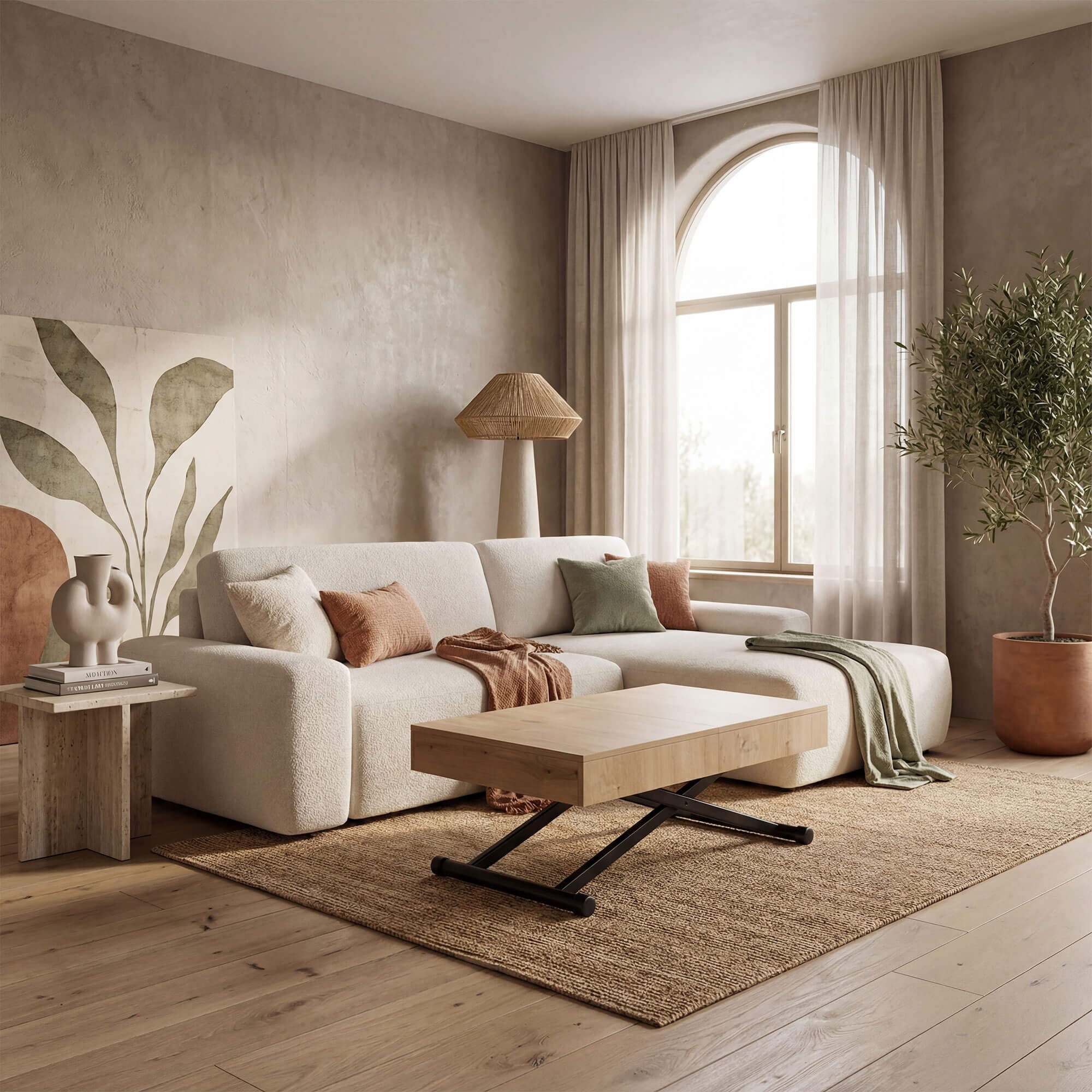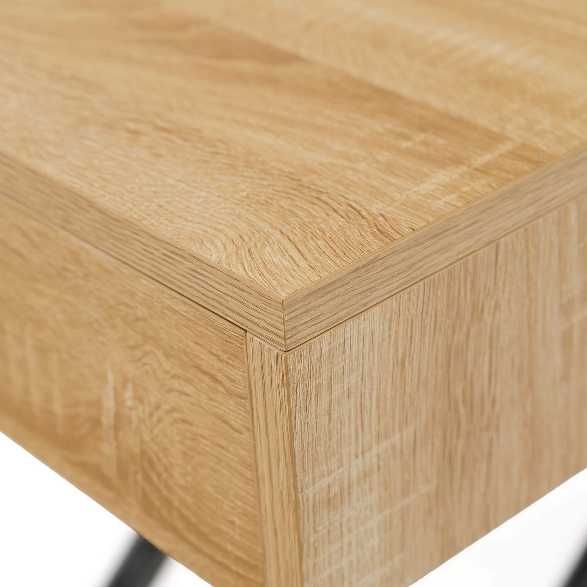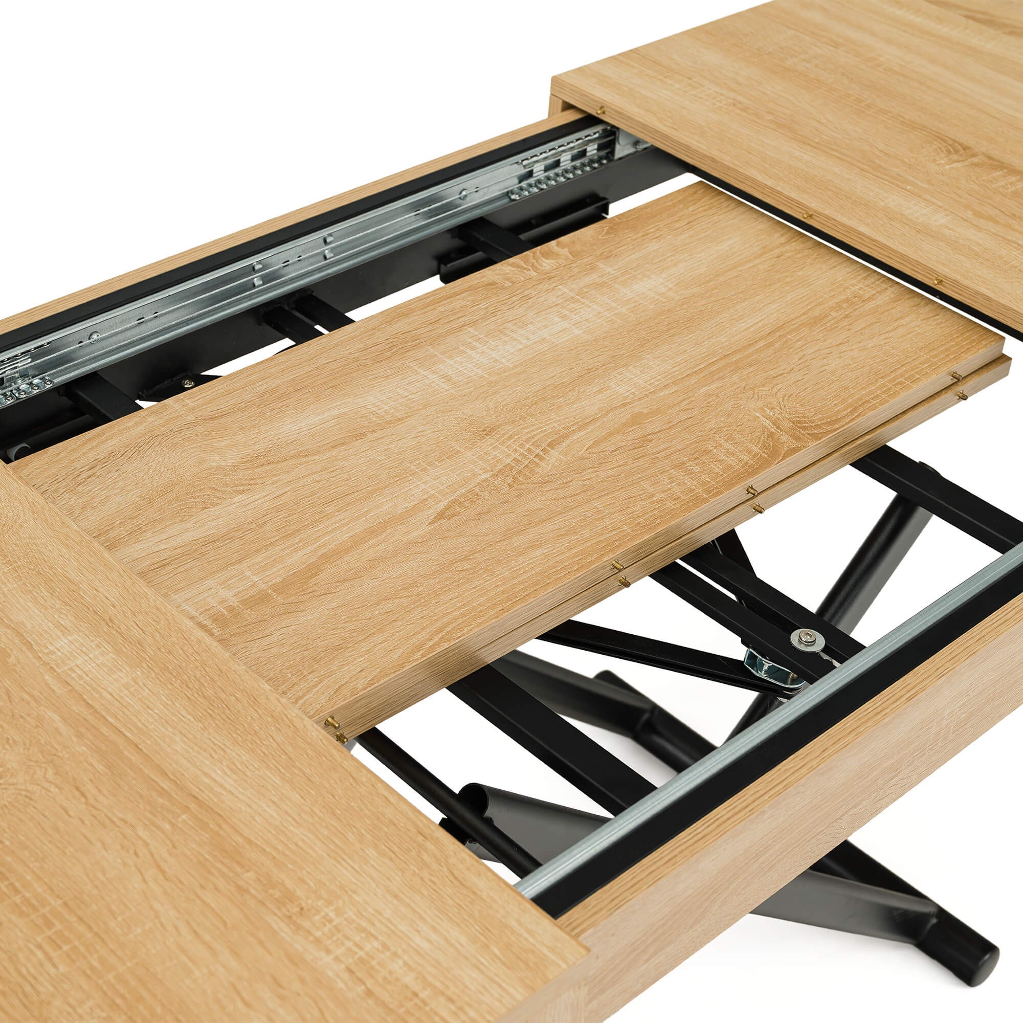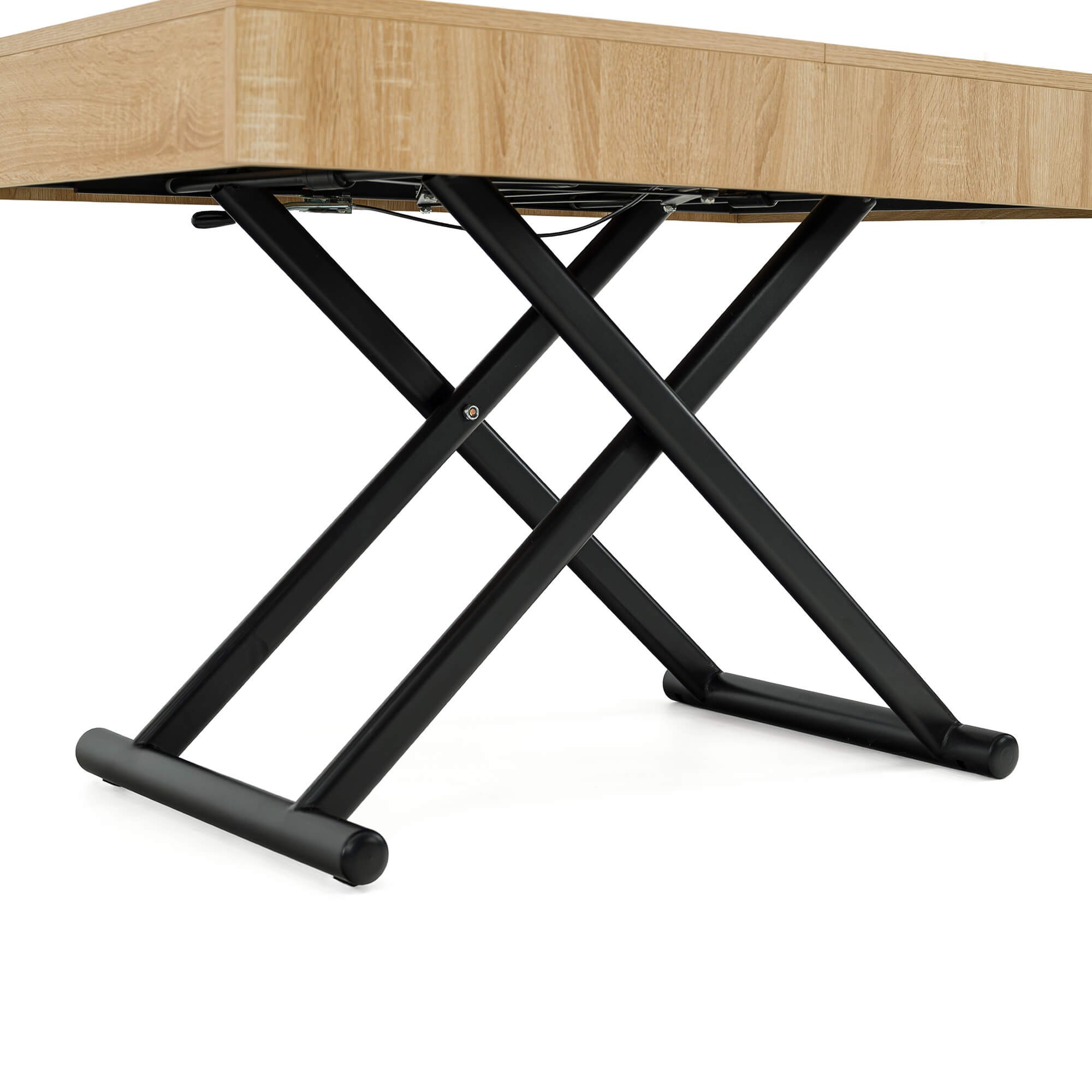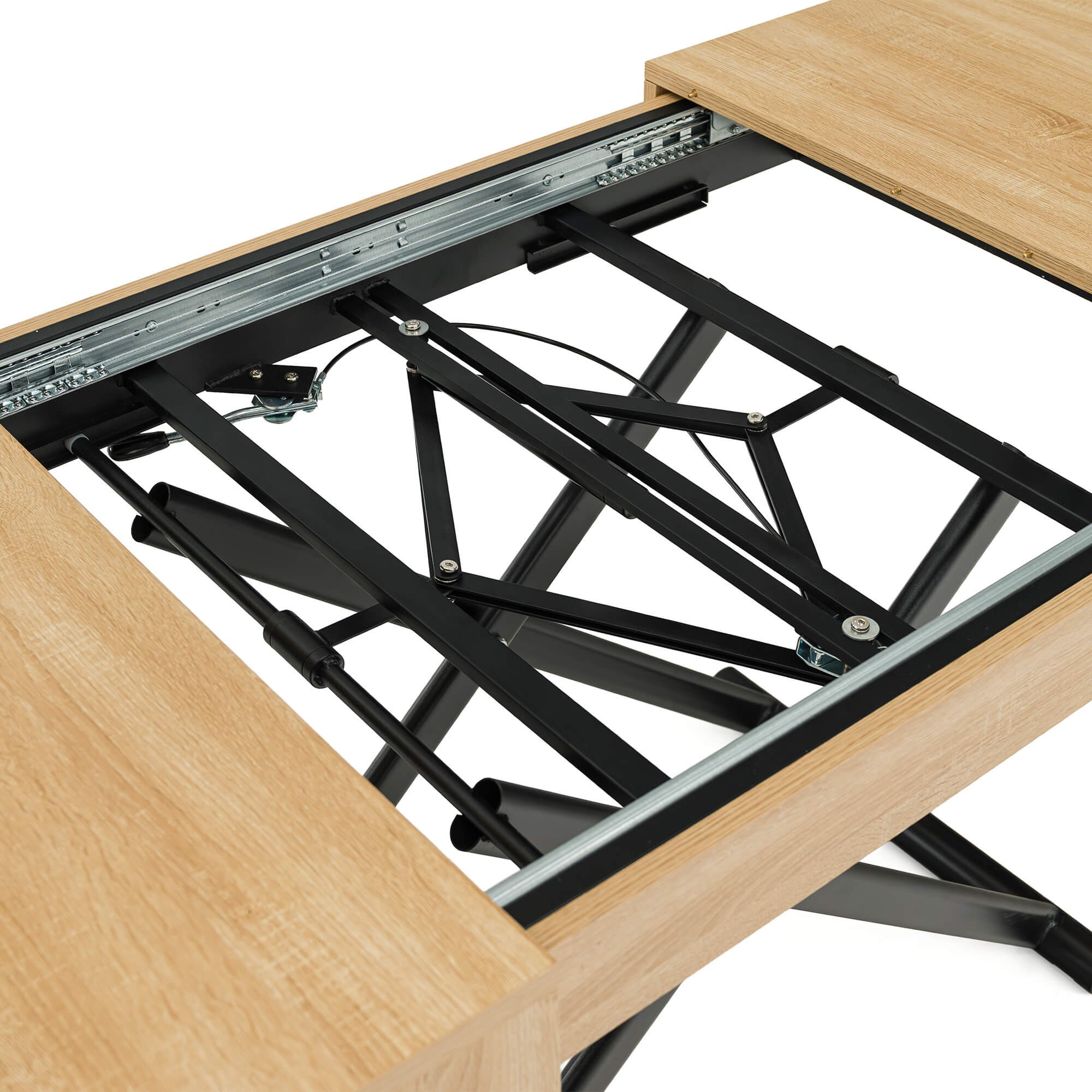 Stół SUN w kolorze dąb natural to praktyczny i nowoczesny mebel, który świetnie sprawdzi się w salonie lub jadalni. Dzięki mechanizmowi pneumatycznemu można go w prosty sposób podnosić i obniżać, dopasowując wysokość do własnych potrzeb – od niskiego stolika kawowego po pełnowymiarowy stół obiadowy. Solidny blat wykonany jest z płyty MDF oklejonej fornirem w odcieniu dąb natural, co nadaje całości eleganckiego wyglądu i sprawia, że stół pasuje zarówno do nowoczesnych, jak i klasycznych aranżacji wnętrz. Stabilna podstawa z metalowymi nogami w kształcie krzyżaka zapewnia wytrzymałość i bezpieczeństwo użytkowania, a prosty system rozkładania umożliwia szybkie dopasowanie stołu do większej liczby gości.