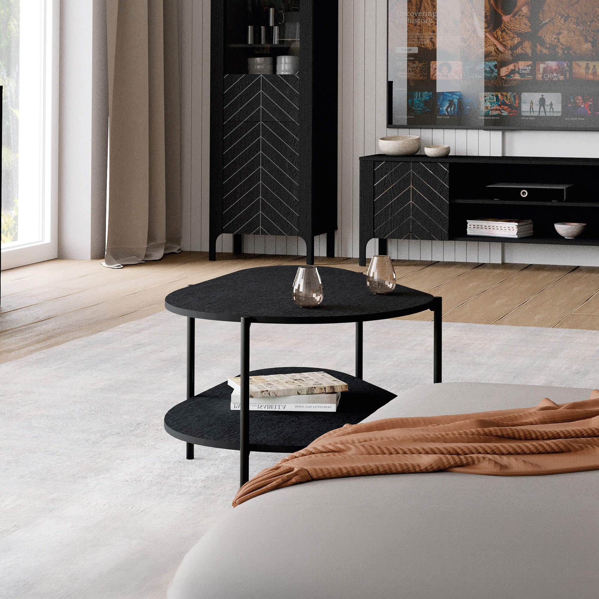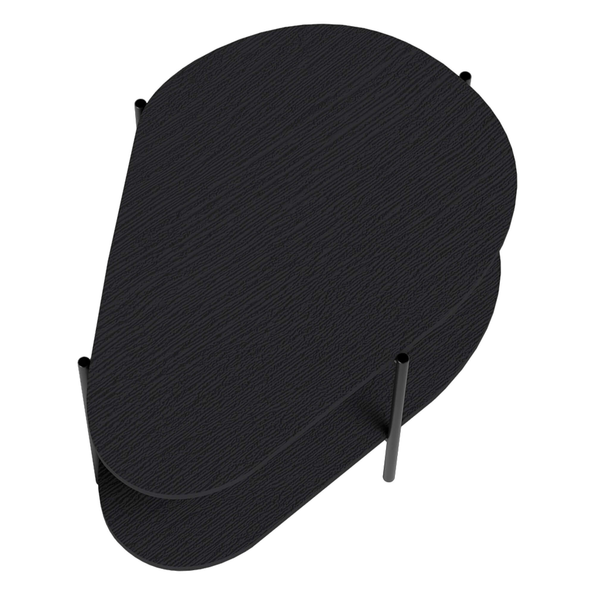 Stolik kawowy MM-8 to mebel, który przełamuje schematy. Jego organiczny, obły kształt wprowadza do salonu powiew świeżości i nowoczesnego podejścia do designu. Głęboka czerń wykończenia w połączeniu z surową, metalową ramą sprawia, że stolik prezentuje się niezwykle elegancko, stając się centralnym punktem strefy wypoczynkowej.