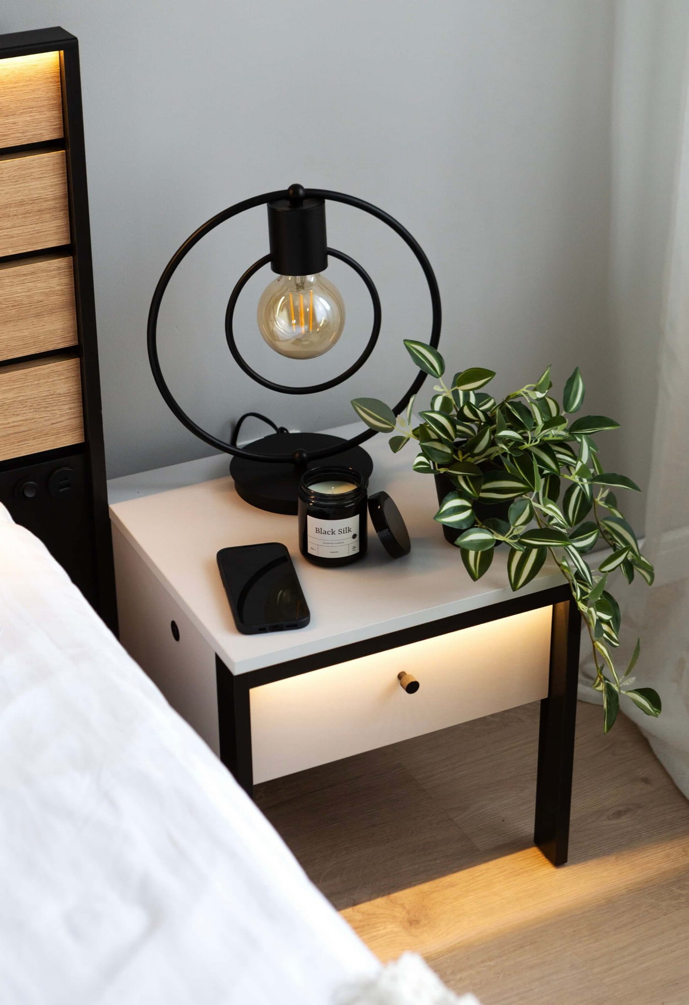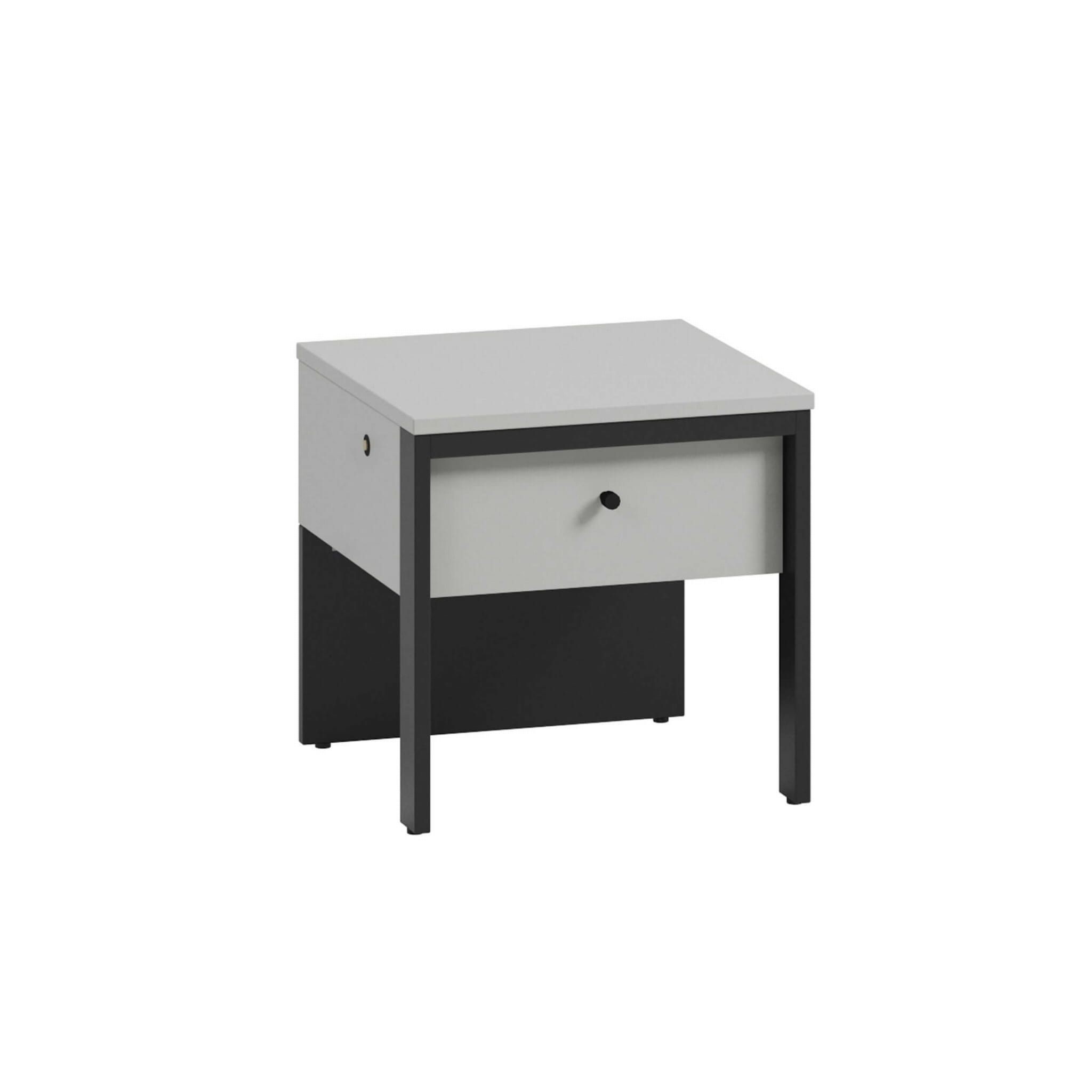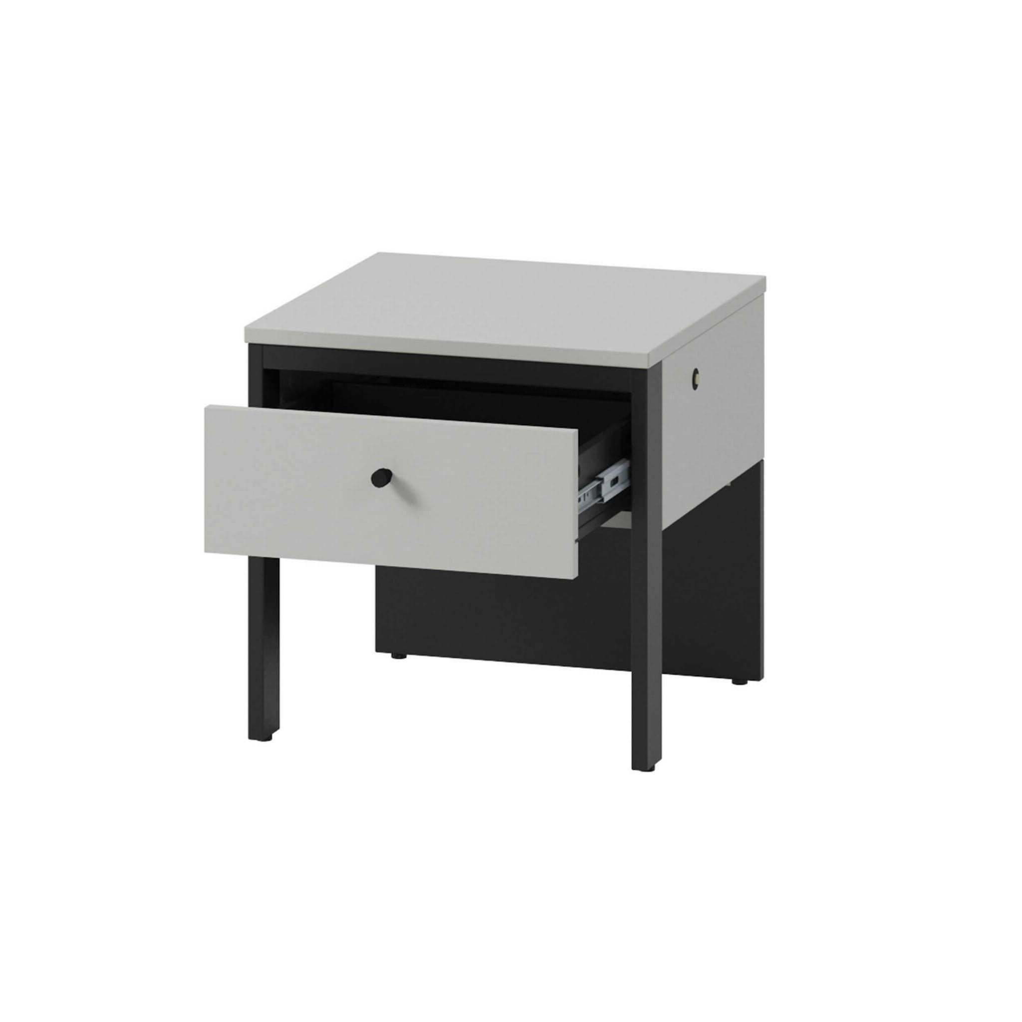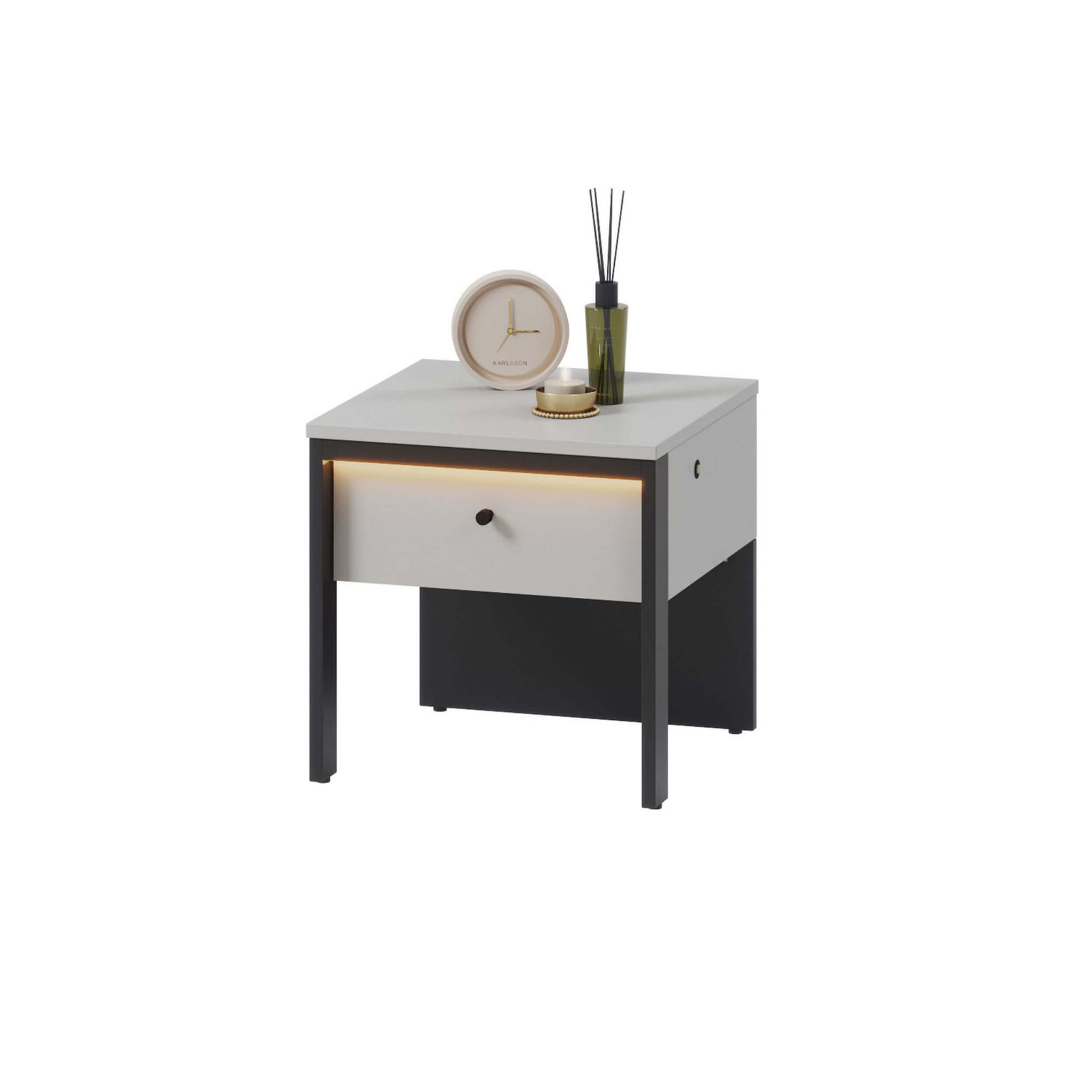 Odkryj magię nowoczesnej kolekcji GRIS z wbudowanym oświetleniem LED o ciepłej barwie i stwórz klimatyczny nastrój w swojej sypialni! To połączenie smukłych nóżek, szarości i czarnych detali, które będą wyróżniać się w każdym domu. Jedną z popularnych brył jest stolik nocny GS-05, który stanowi idealne dopełnienie przestrzeni przy łóżku. Solidna konstrukcja z płyt laminowanych zabezpieczona obrzeżami ABS to najskuteczniejszy sposób, by mebel charakteryzował się wysoką jakością, odpornością i starannym wykończeniem. Dodatkowo opiera się ona na dwóch smukłych nóżkach i tylnej stabilizującej płyty. Pojedyncza szufladka to świetne miejsce na drobiazgi, które chcemy mieć na wyciągnięcie ręki. Elementem, który podkreśla nowoczesny charakter jest z kolei wbudowane klimatyczne oświetlenie LED.